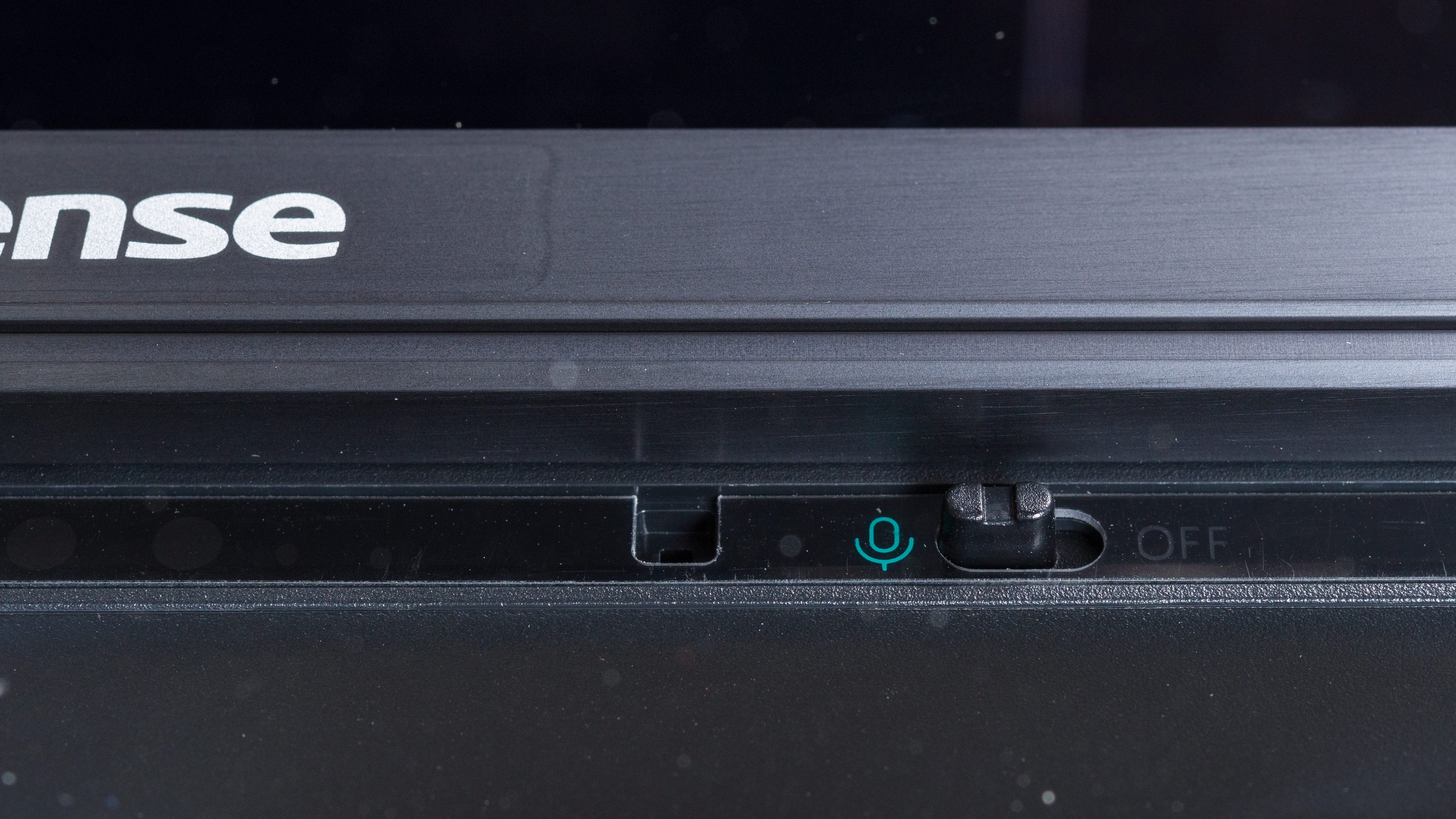 There's a single button on the bottom center of the TV that can be used to switch inputs and power the TV on/off. There's also a small switch that you can use to turn on/off the TV's built-in microphone.
