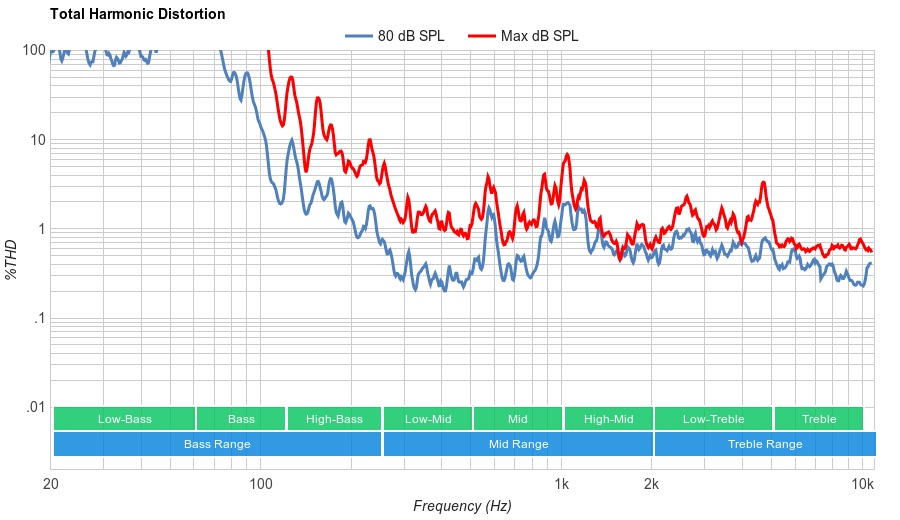 Average distortion performance. The overall amount of harmonic distortion at 70dB and 80dB SPL is quite low. There is, however, a little bit of rise in distortion under maximum load, but remaining within an acceptable range.