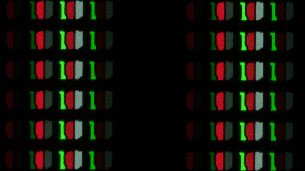 The LG A1 uses a WRGB subpixel structure. Like other OLEDs, all four subpixels are never lit at the same time. This image shows the red, white, and blue sub-pixels. You can see an alternate photo with the green, red, and white subpixels lit here.