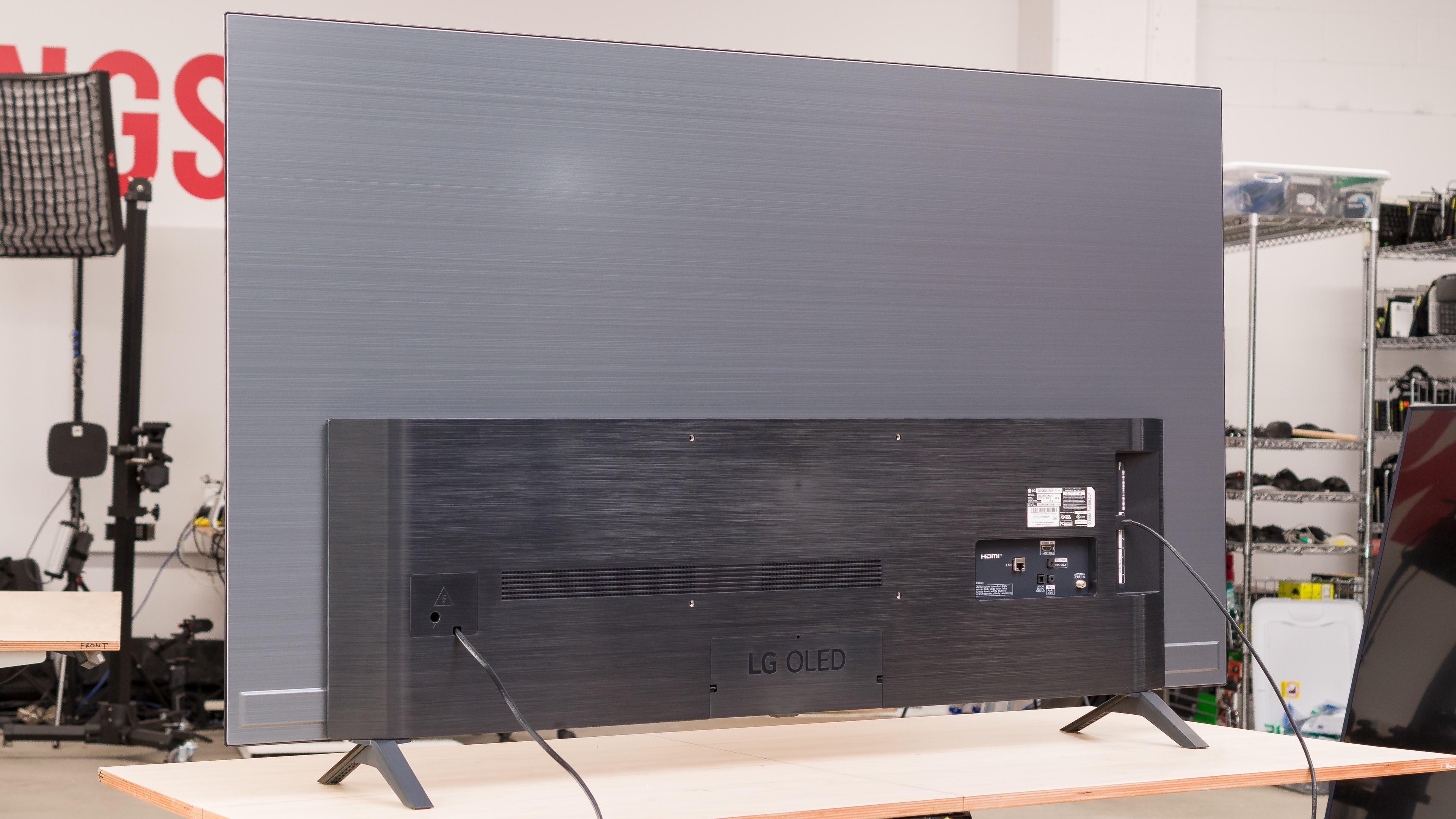 The back of the TV is plain, and unfortunately, there's no cable management. Like the LG C1 OLED, the top half is metal, but the thicker bottom portion that houses the electronics is plastic. Most of the inputs face to the side and are easy to access, but there are a few less commonly used inputs that face straight back from the TV, and these are very difficult to access, especially when the TV is wall mounted.