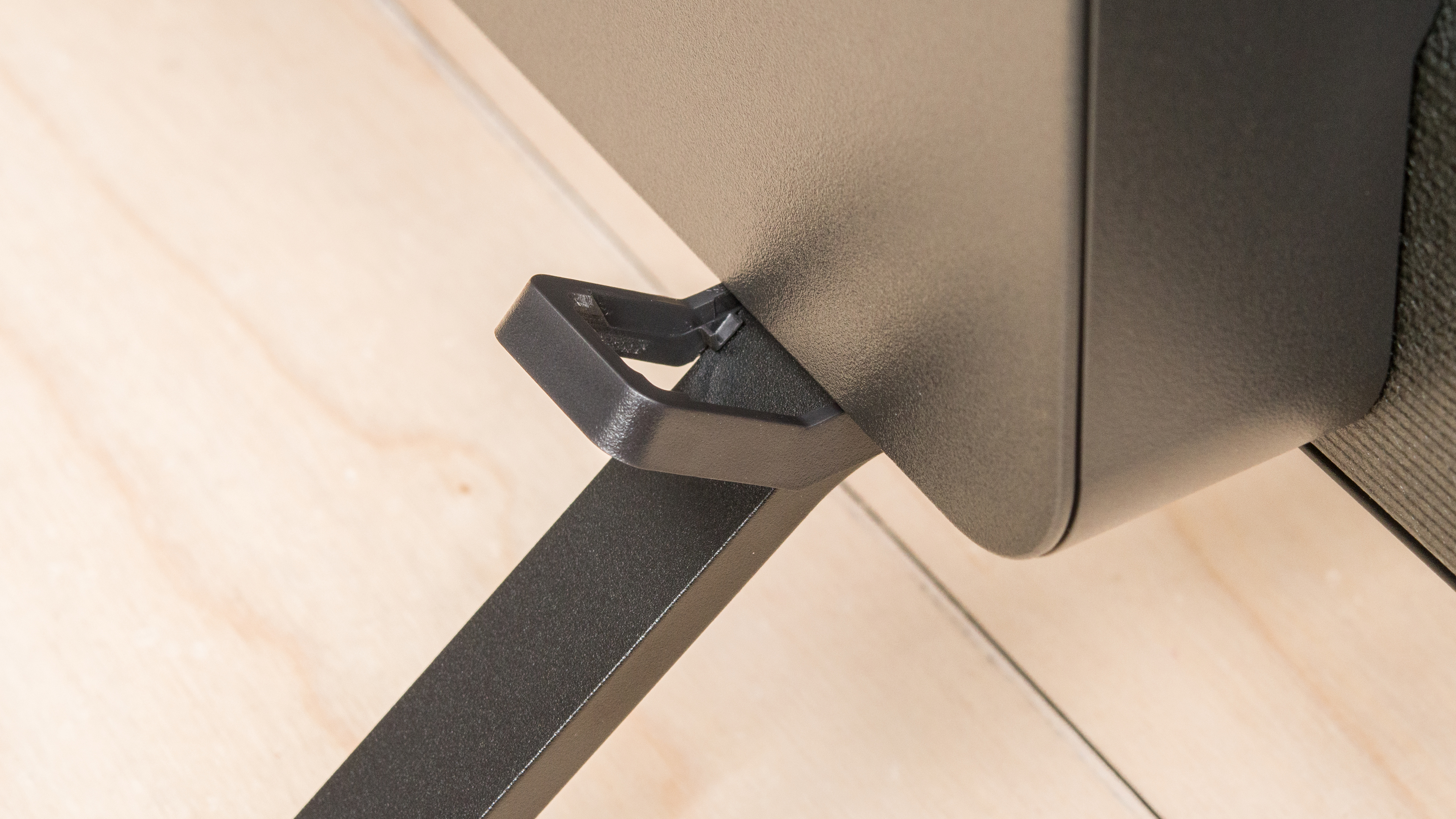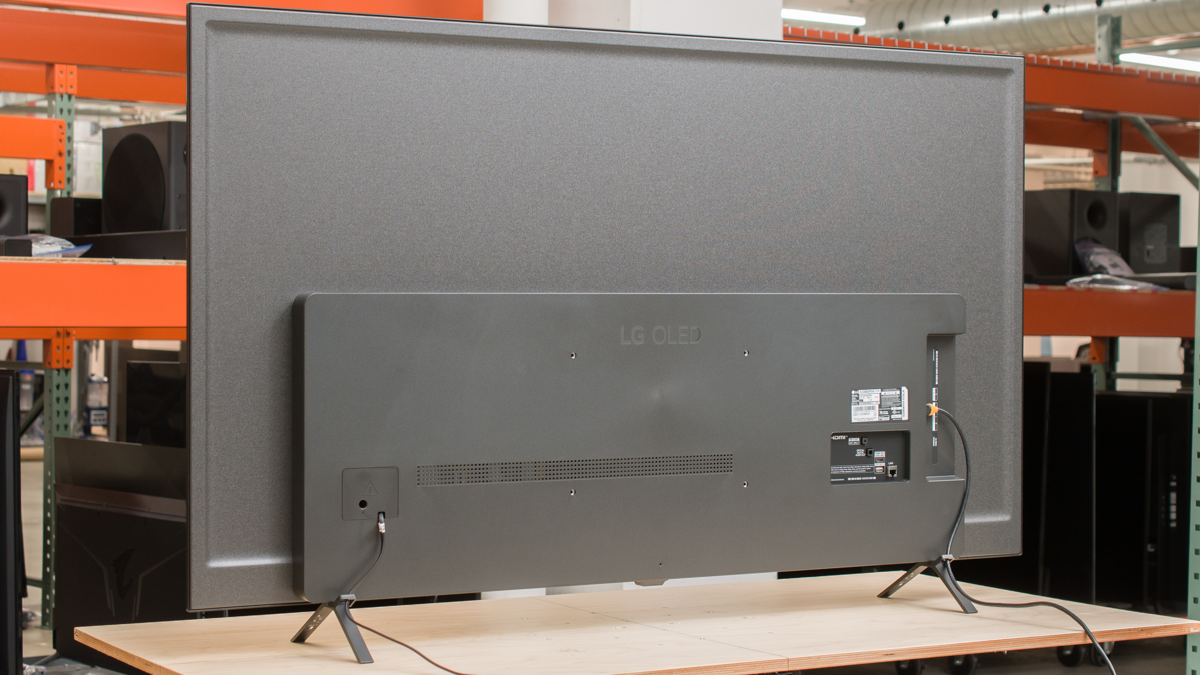 The TV has a simple style similar to its predecessor, the LG A1 OLED. It features two V-shaped feet, and the back panel is flat except for the housing for the inputs.