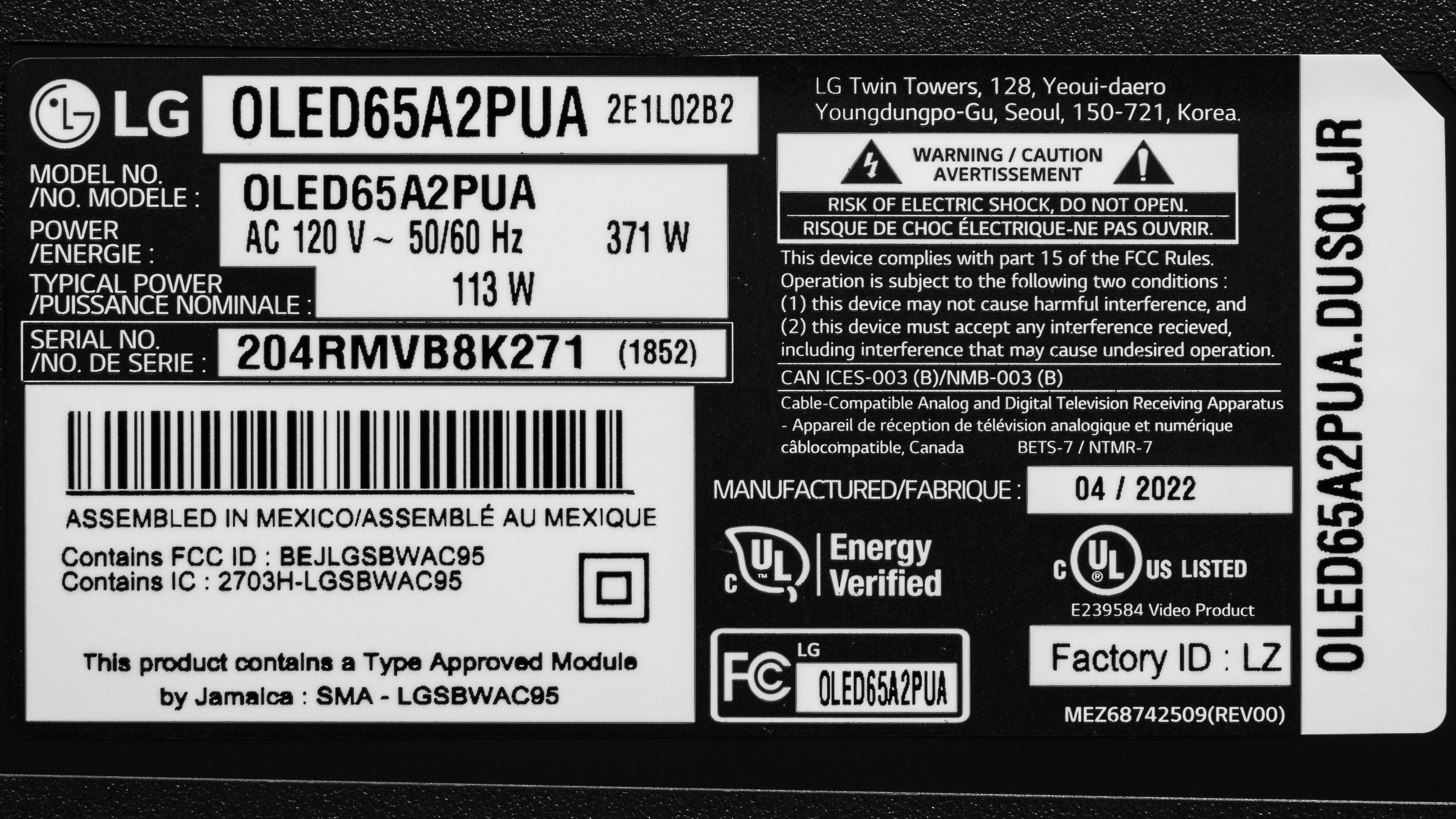 We tested the 65-inch LG A2 (OLED65A2PUA), and the results are also valid for the 48-inch, 55-inch, and 77-inch variants. It's sold at Costco under the OLED55A2AUA/OLED65AUA model codes, and while it's the same TV, it comes with an extra warranty, and its remote supports NFC, while the 48-inch and 77-inch models are only available at Best Buy. The exact model code can vary between different regions and even retailers, but it's the same TV.