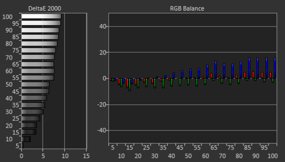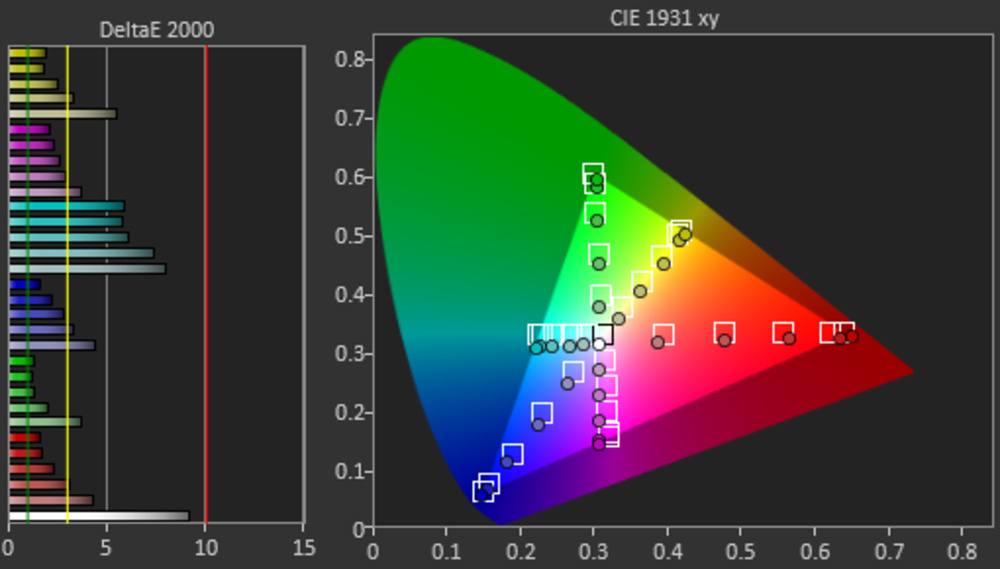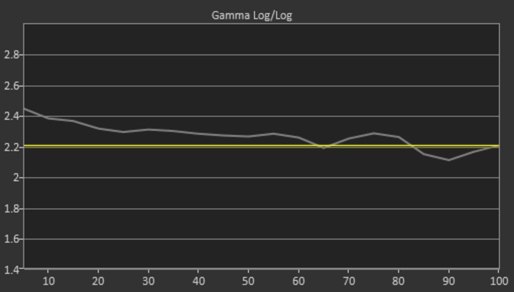 After calibration, this TV has much better accuracy, and it looks fantastic. A few colors have slight inaccuracies, but it's not really noticeable to most people. The white balance is perfect, and gamma follows our 2.2 target for a dark room perfectly. The overall color temperature is perfect. Note that this calibration was done with the traditional D65 white point, not the modified Judd white point that some calibrators are recommending for OLED displays.