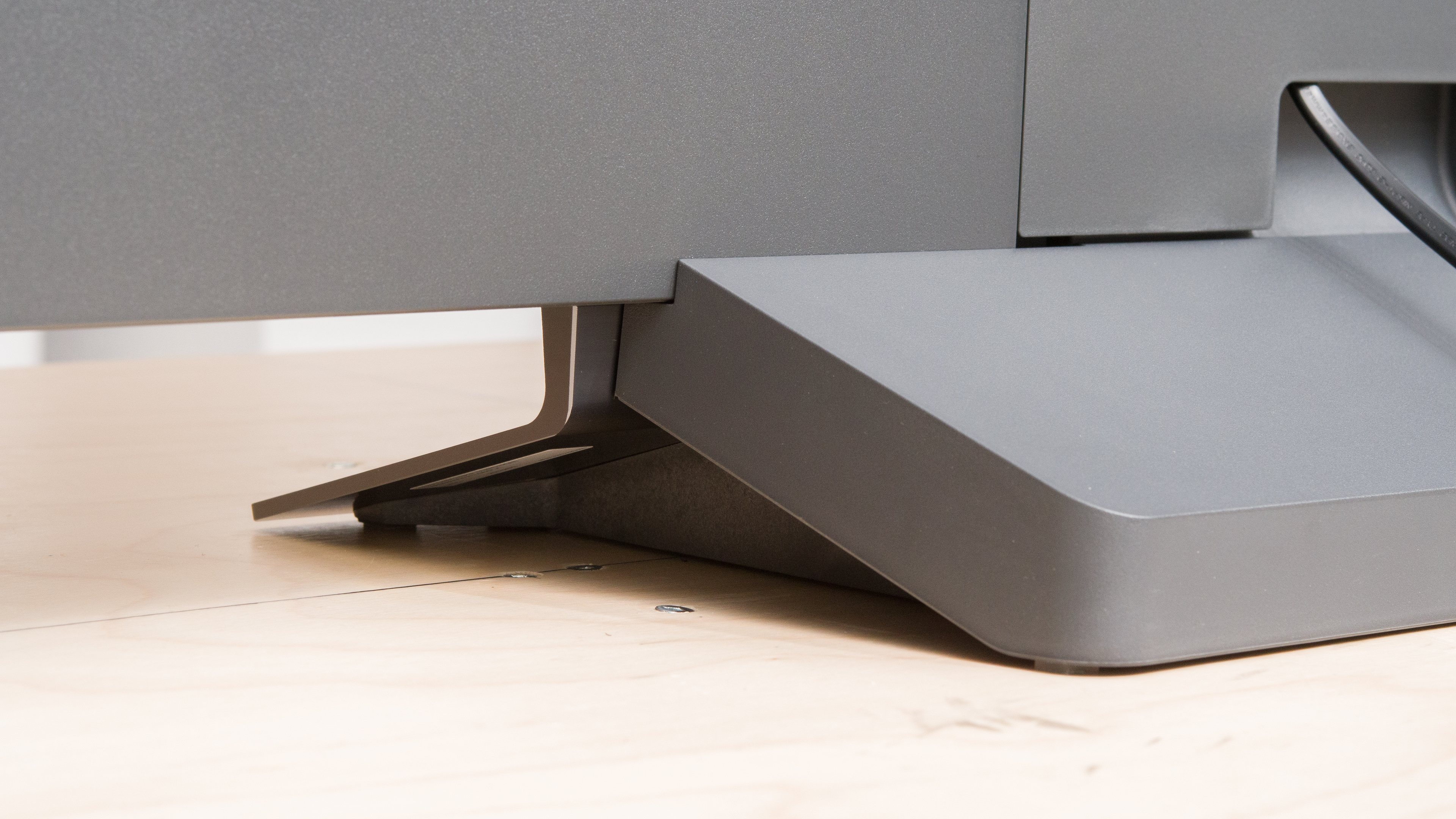 The stand is small, so it doesn't support the TV very well and wobbles quite a bit. The stand lifts the bottom of the screen about two inches above the table, which isn't quite enough to fit most soundbars, so you'll block part of the screen if you have a large soundbar on the same table. You can see a closeup photo of the stand here. Note that the 48-inch and 83-inch models use a different central stand, identical to the LG C1 OLED. The 42" model uses two feet on each side of the screen instead of a central stand.