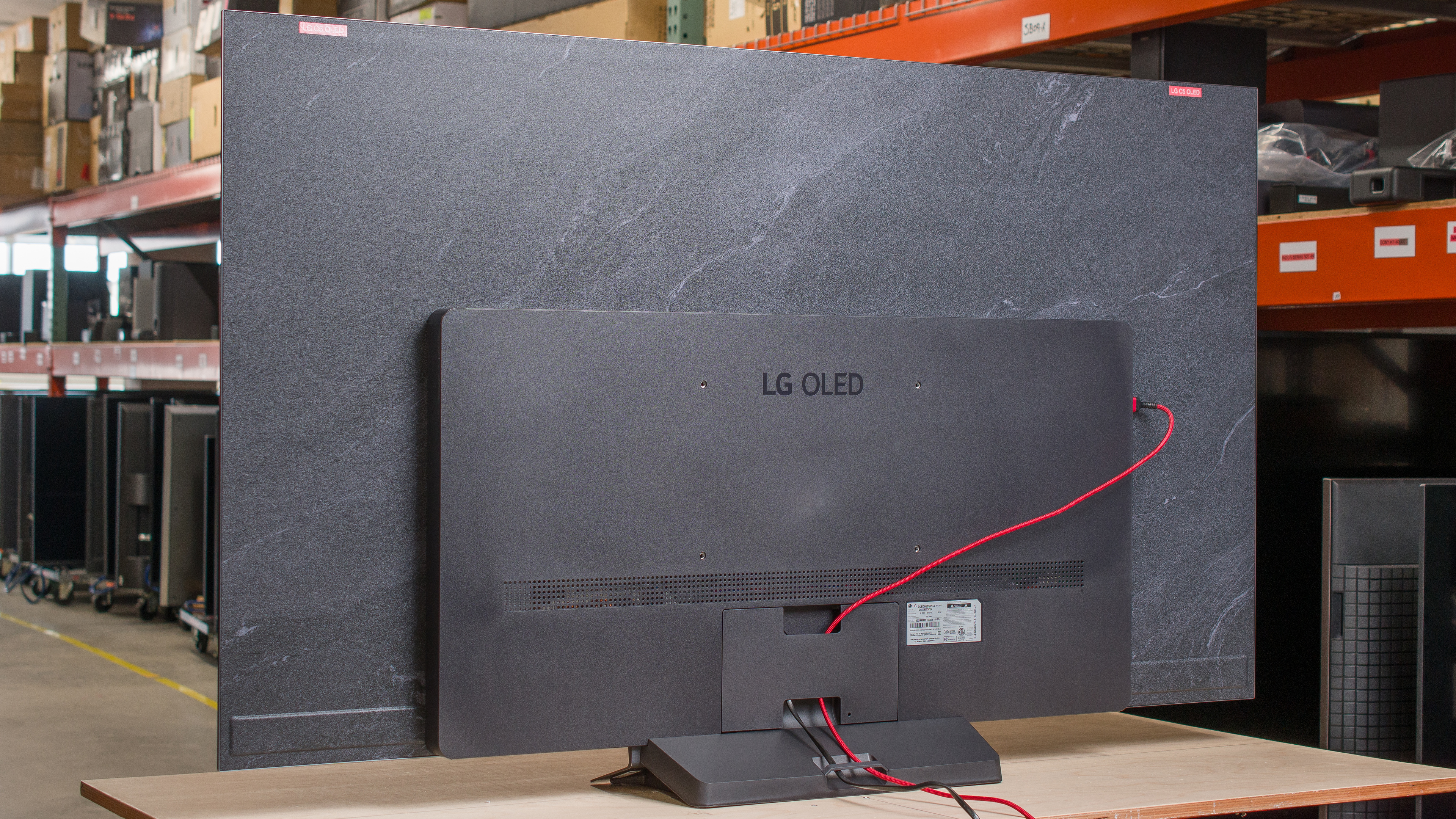 The back of the TV is pretty much identical to the LG C4 OLED, but the stone-like finish is now a much darker shade of gray. The inputs are on the far left side of the TV, which makes them easy to access if you have the TV on the stand. However, they're hard to reach when the TV is wall-mounted. There are channels on the back of the TV and on the stand to help with cable management.