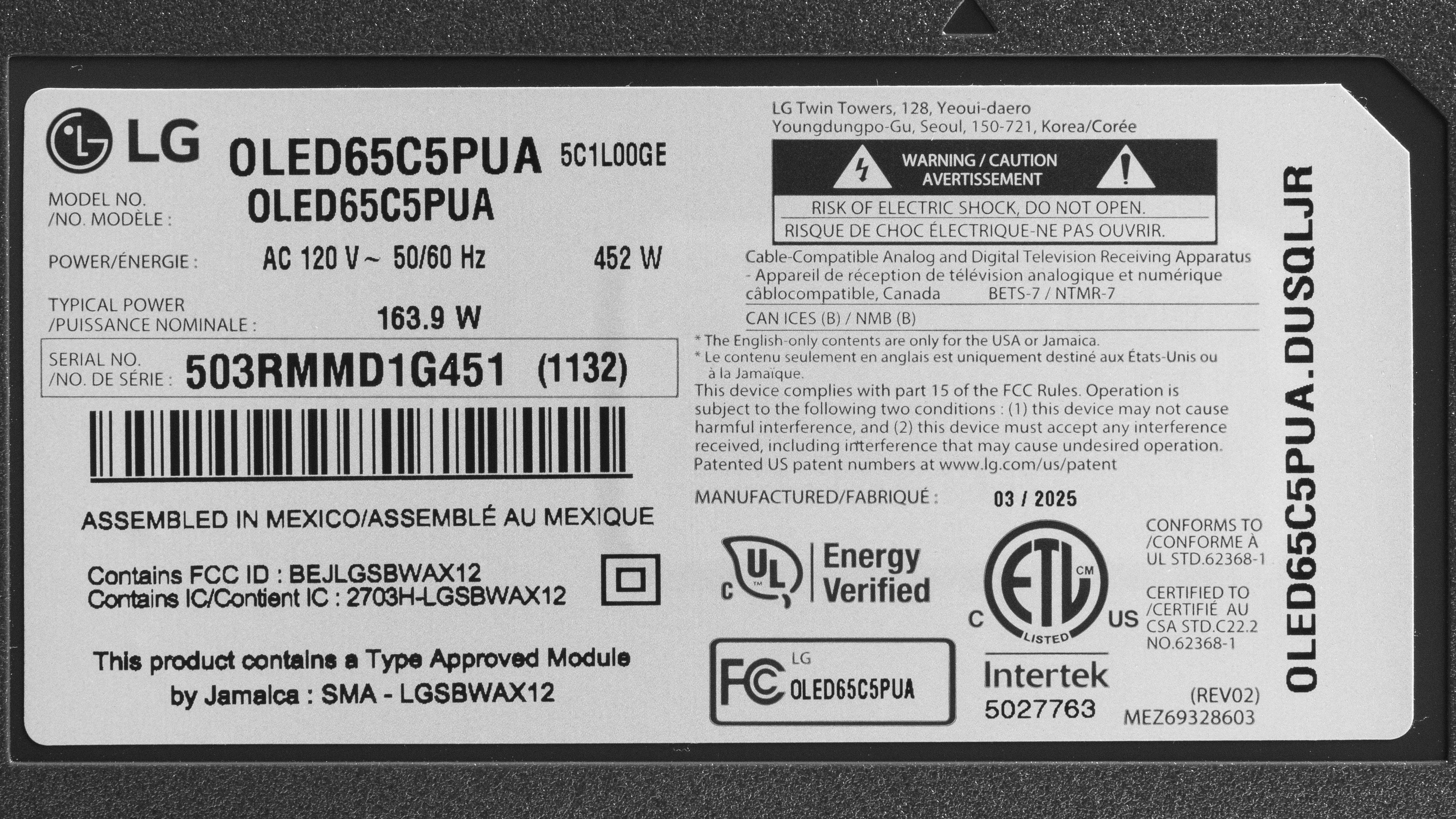We bought and tested the 65-inch LG C5 (OLED65C5); these results are also valid for the 55, 77, and 83-inch sizes. The 42-inch and 48-inch sizes don't have LG's Brightness Booster technology, so they don't get as bright as the bigger models do. Note that the last three letters in the model number (PUA in this case) vary between retailers and individual regions, but there's no difference in performance. The variant sold at Sam's Club carries the suffix 'AUA' and comes with an extended warranty.