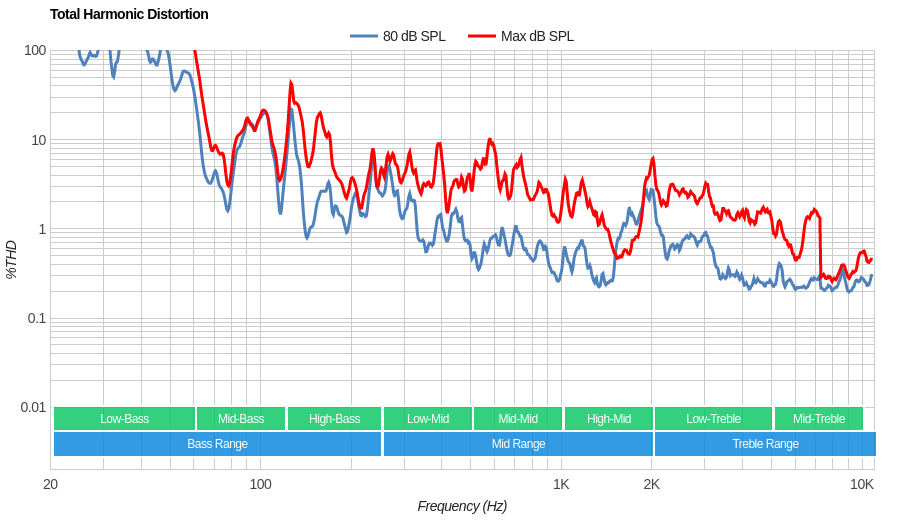 The C8 has a decent distortion performance. The THD response is rather elevated, which is typical of most TVs and doesn't increase too much under maximum load either.