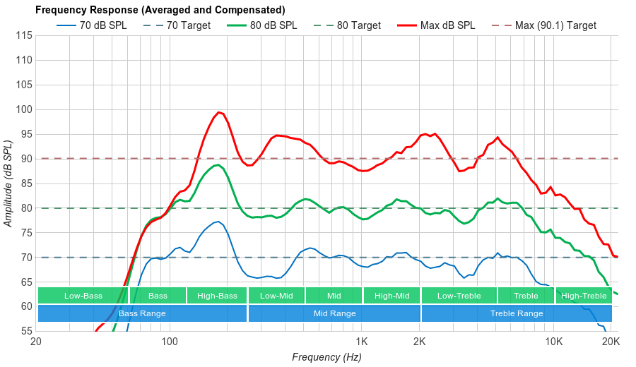 Good frequency response, the LG E7P follows our target decently well and it extends well into lower frequencies. It also doesn't have much dynamic range compression at higher volumes, so the sound quality doesn't deteriorate when brought up to its maximum.