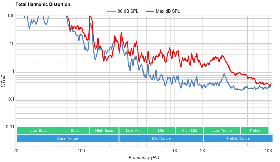 Average Distortion performance. The E7's THD follows a common pattern where levels are relatively low at normal listening volumes but rise significantly higher the volume is brought up. IMD is also quite high when the TV's volume level is set to max.
