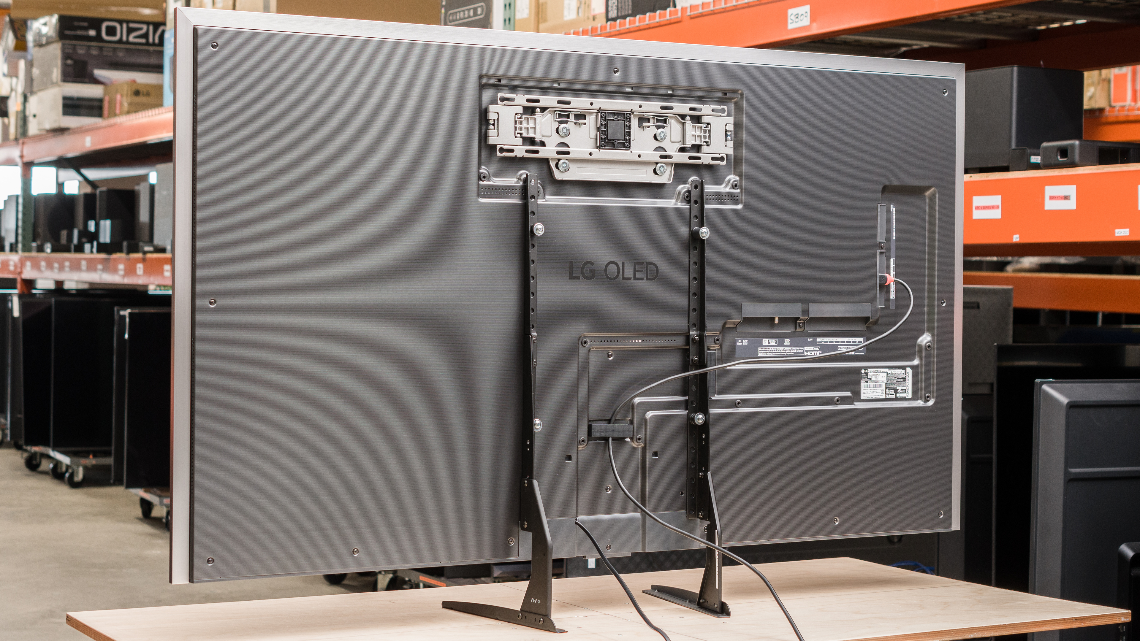 The TV doesn't have a stand, as it's designed to be wall-mounted with the included mount. Note that the stand you see in our pictures is third-party, but LG does sell a separate one for the LG G3 if you don't want to wall-mount it. You can also use the LG G2's stand, which you must also purchase separately.