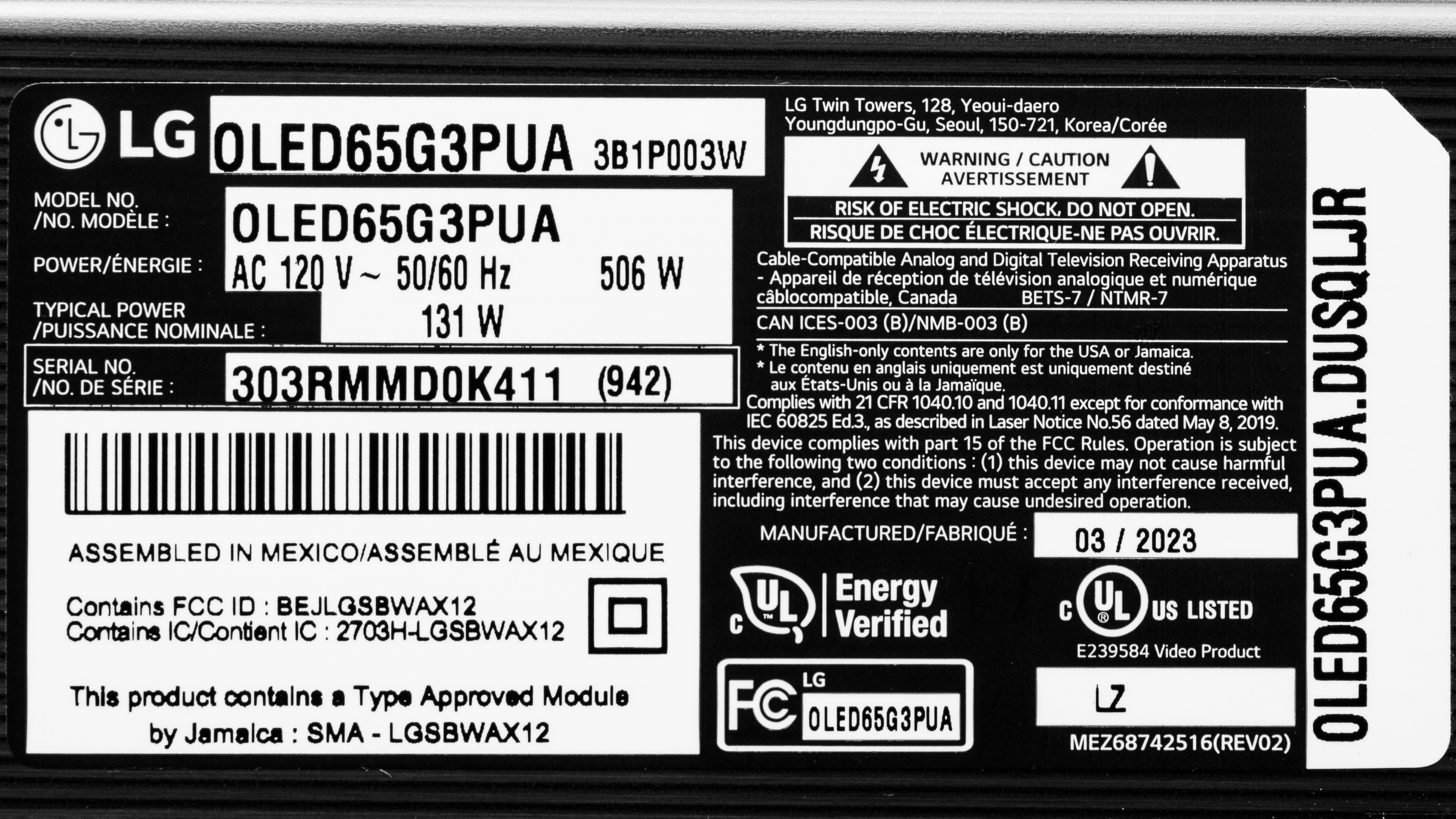 We tested the 65-inch LG G3 OLED (OLED65G3), but it's also available in 55, 77, and 83-inch sizes. The 83-inch model doesn't have the MLA focusing layer, so it isn't as bright as the smaller models. Note that the last three letters in the model number (PUA in this case) vary between retailers and individual regions, but there's no difference in performance.