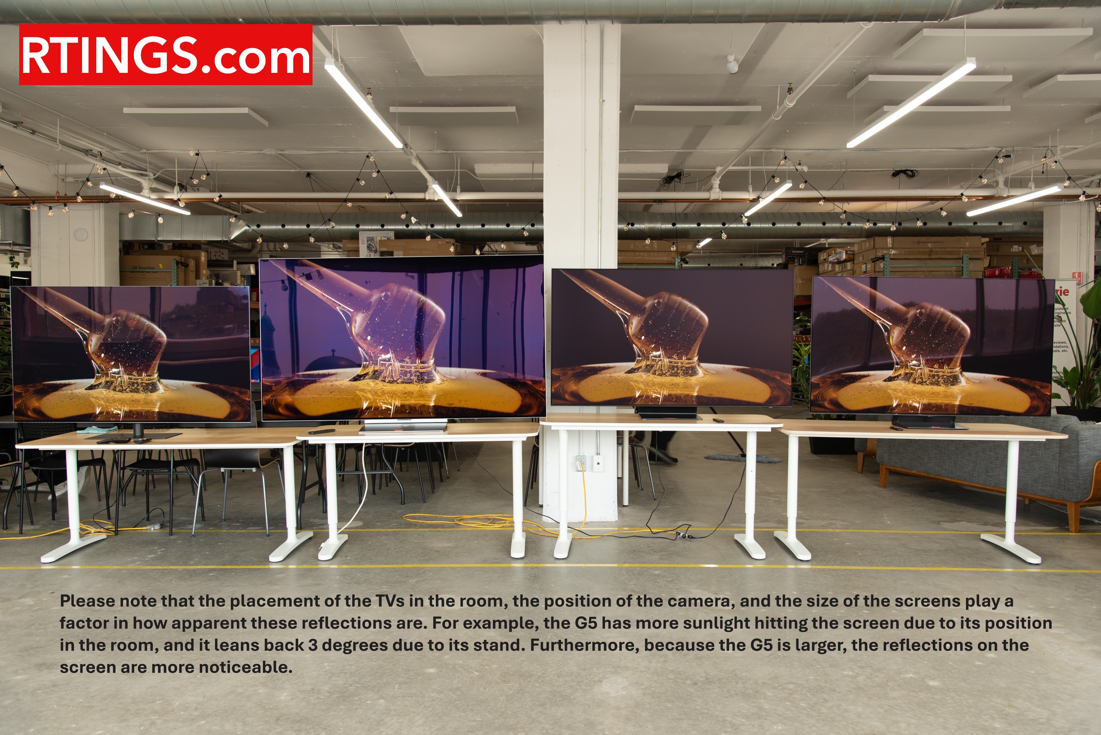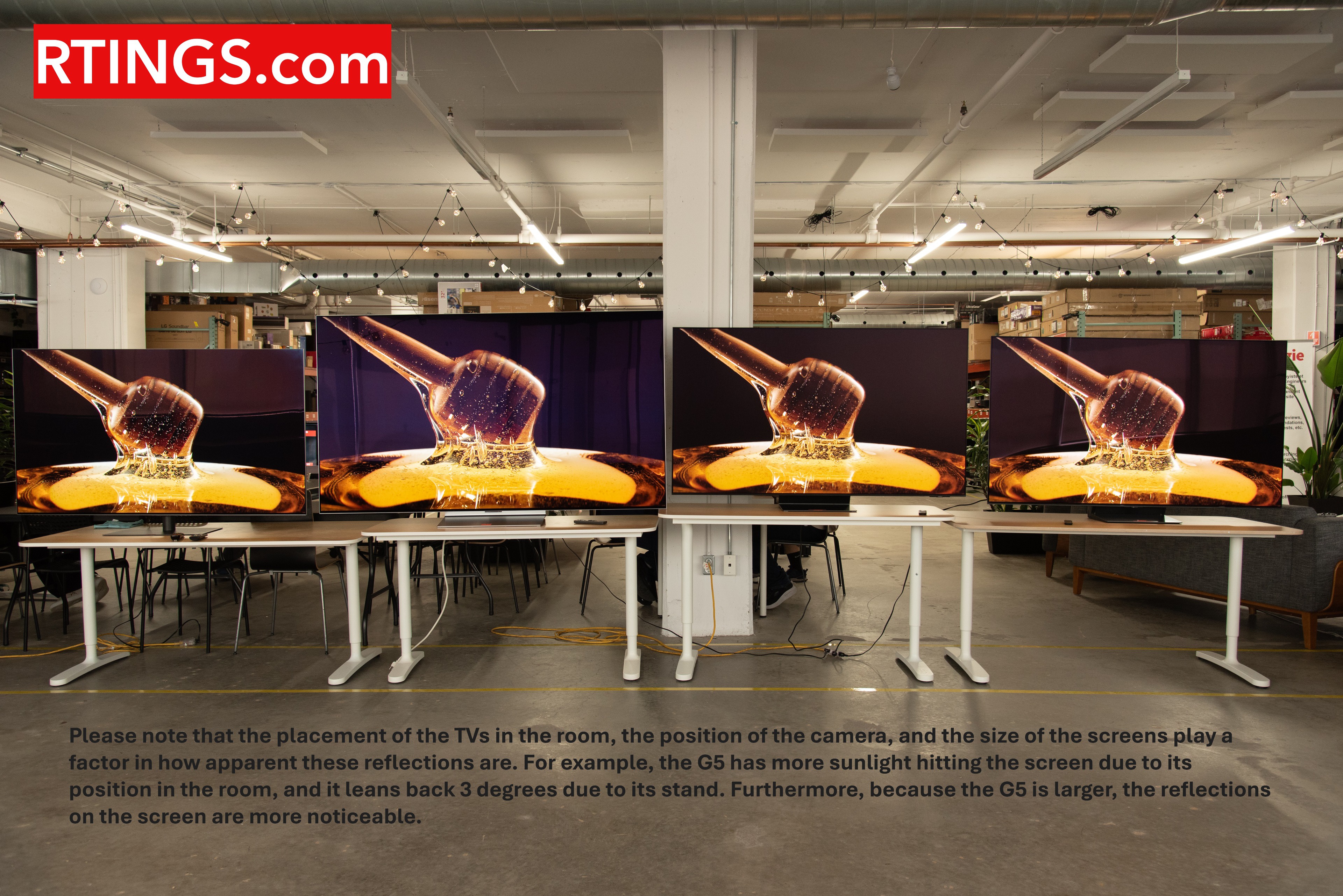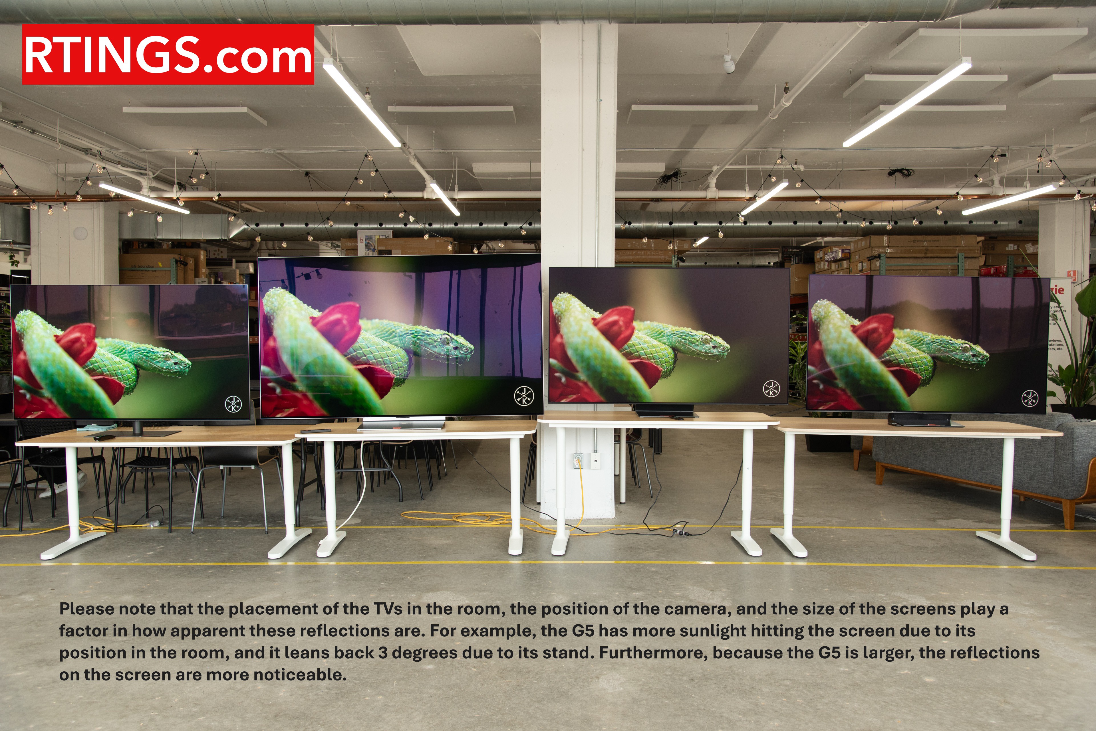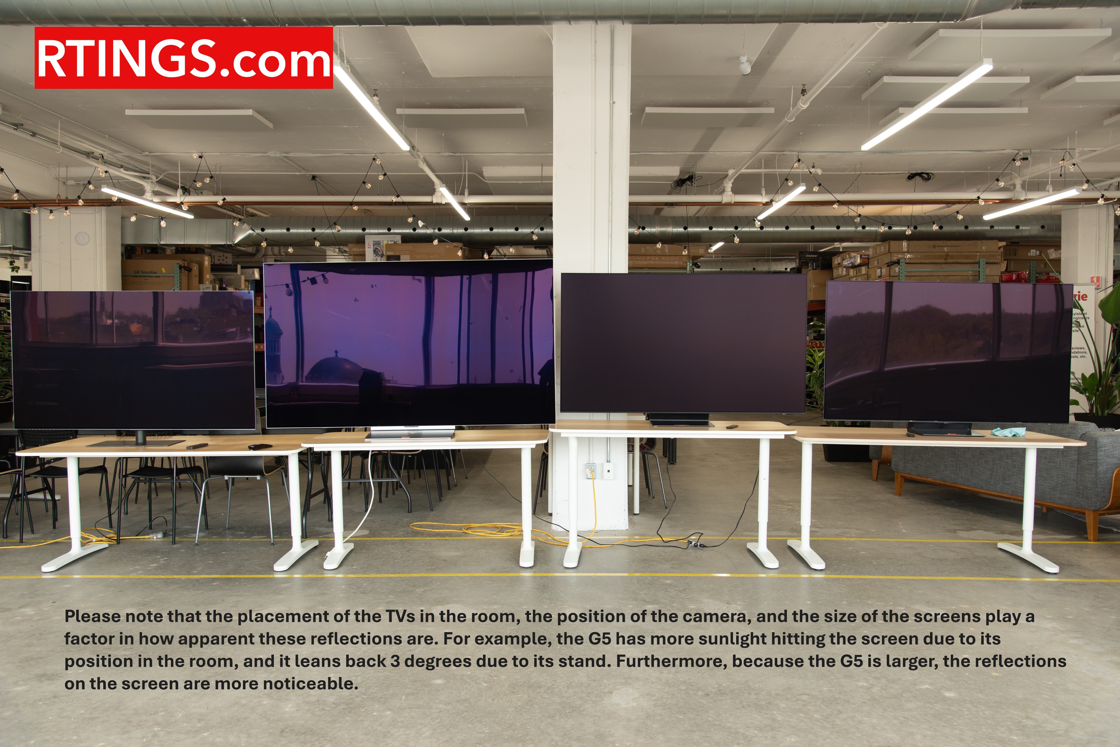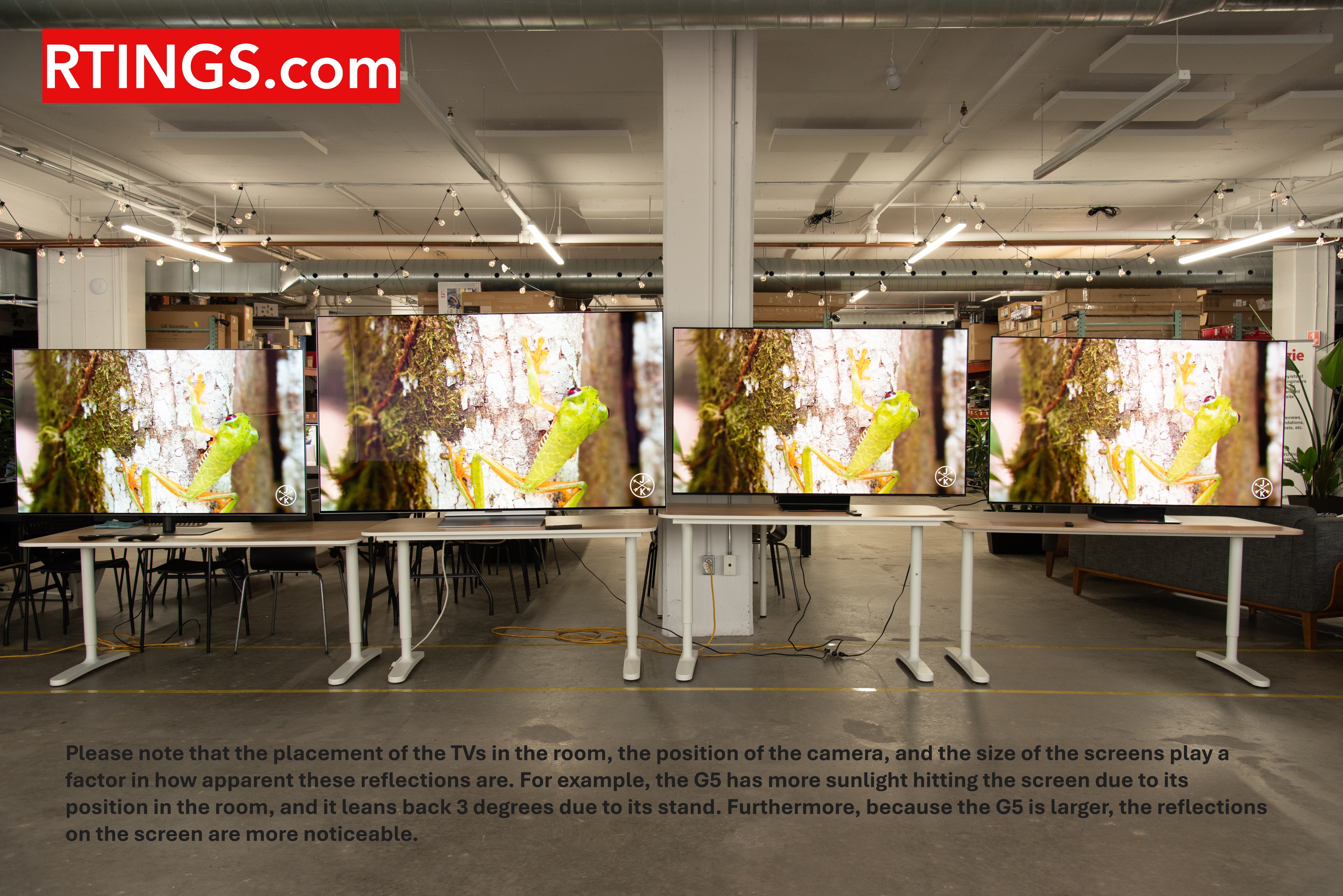 The photos below show how the TV handles reflections compared to some other similar models. They are lined up from left to right in this order: LG G4 OLED, LG G5 OLED, Samsung S95F OLED, and Samsung S90F OLED. Please note that the placement of the TVs in the room, the position of the camera, and the size of the screens play a factor in how apparent these reflections are. For example, the G5 has more sunlight hitting the screen due to its position in the room, and it leans back 3 degrees due to its stand. Furthermore, because the G5 is larger, the reflections on the screen are more noticeable.