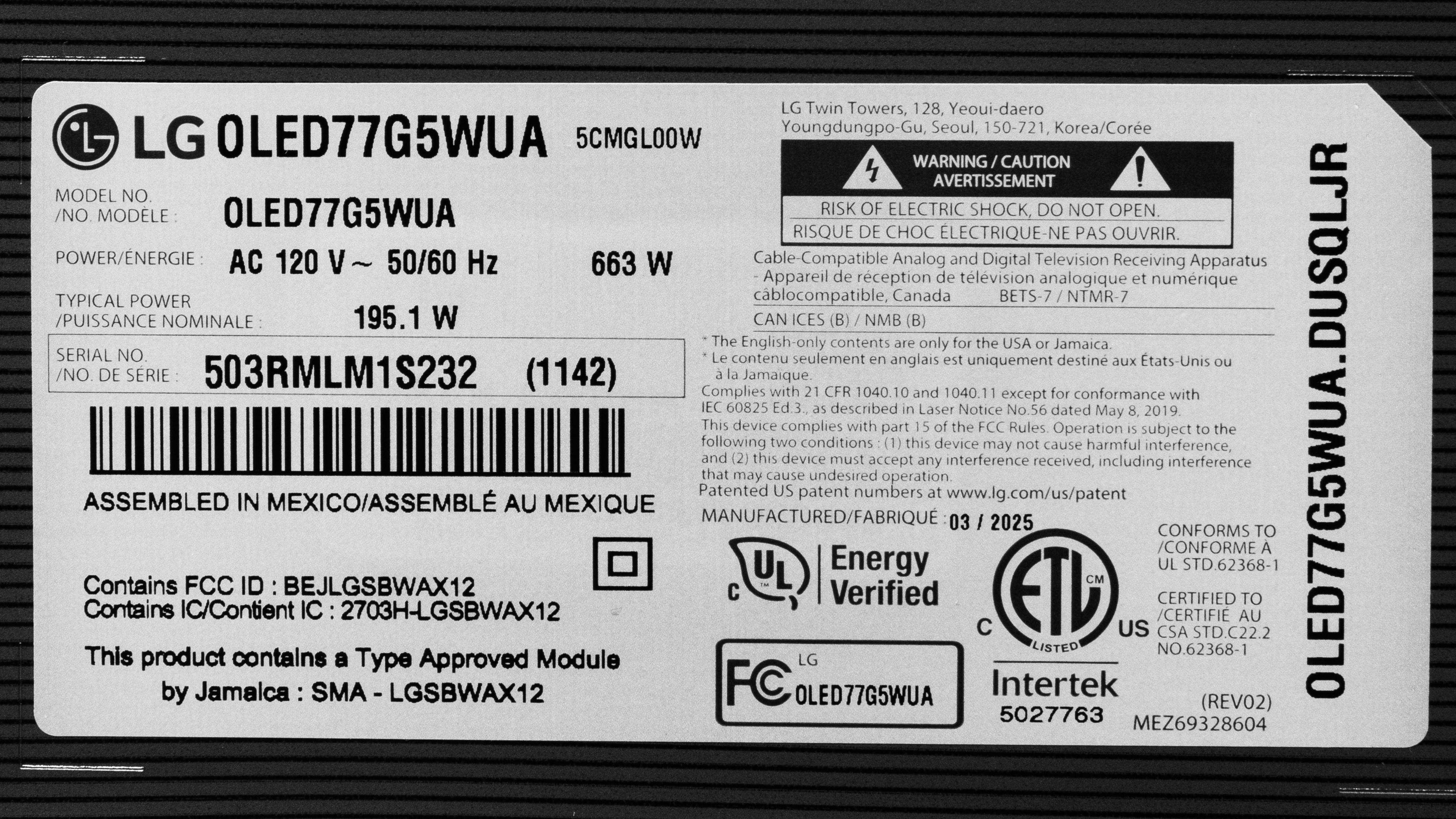 We bought and tested the 77-inch LG G5 OLED (OLED77G5WUA), but our results are also valid for the 55, 65, and 83-inch models. The massive 97-inch model doesn't have the new primary RGB tandem panel or an MLA layer, so it isn't as bright and doesn't have the same color performance as the smaller models. Note that the last three letters in the model number (WUA in this case) vary between retailers and individual regions, but there's no difference in performance. All sizes of the TV come with a wall mount instead of a stand in the U.S., but in some regions like Canada, the 55-inch and 65-inch can be purchased with a stand (SUB) or wall mount (WUA).