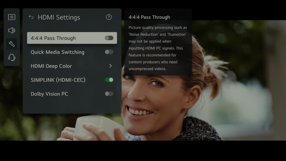 The TV supports Dolby Vision from native apps and external devices. As with normal HDR content, when you start playing Dolby Vision content, some settings change automatically. Since we don't specifically test Dolby Vision, we don't have exact settings for it, but they should be the same as our HDR10 settings.