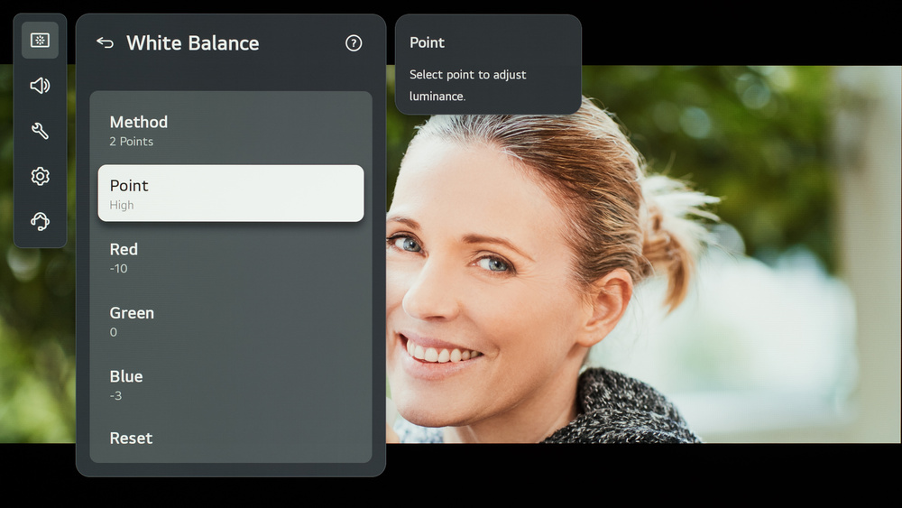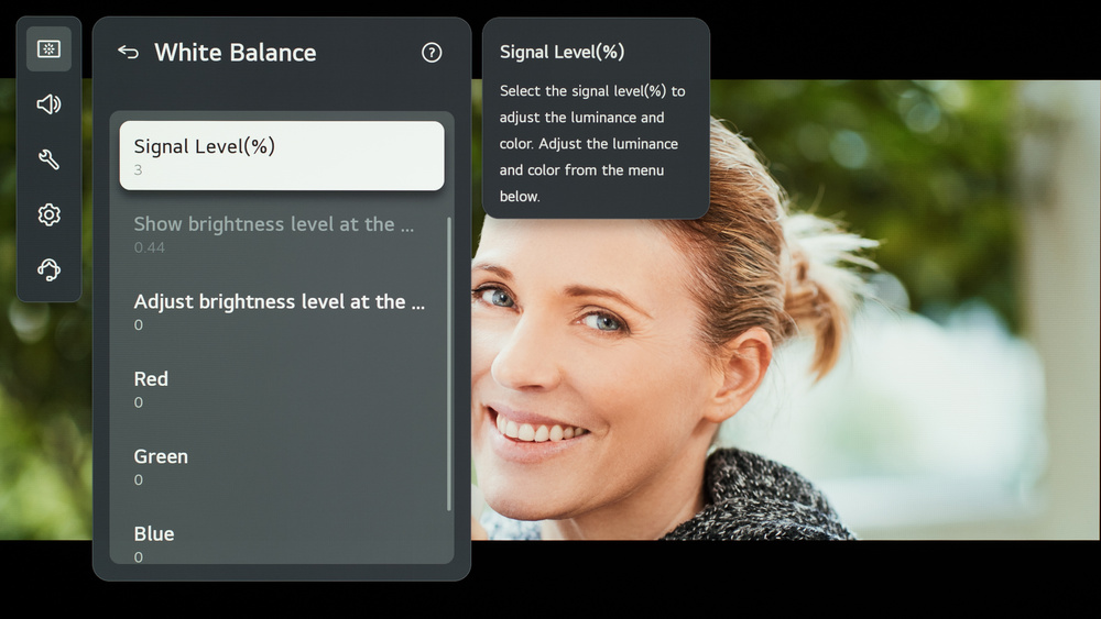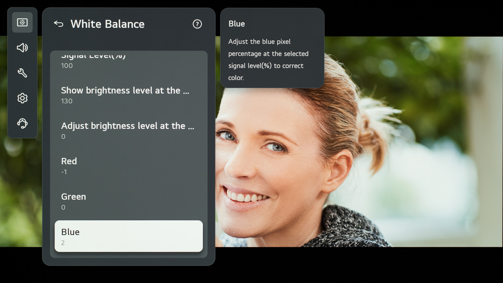 The following are the results of calibrating the white balance of our unit to 6500K in HDR using the 2-point method. These settings are provided for reference only and shouldn't be copied as the calibration values vary per individual unit. If you want to try them, you'll need to enter all values shown, as all of them are active at the same time. If you have worse picture quality, simply reset them to the default values.