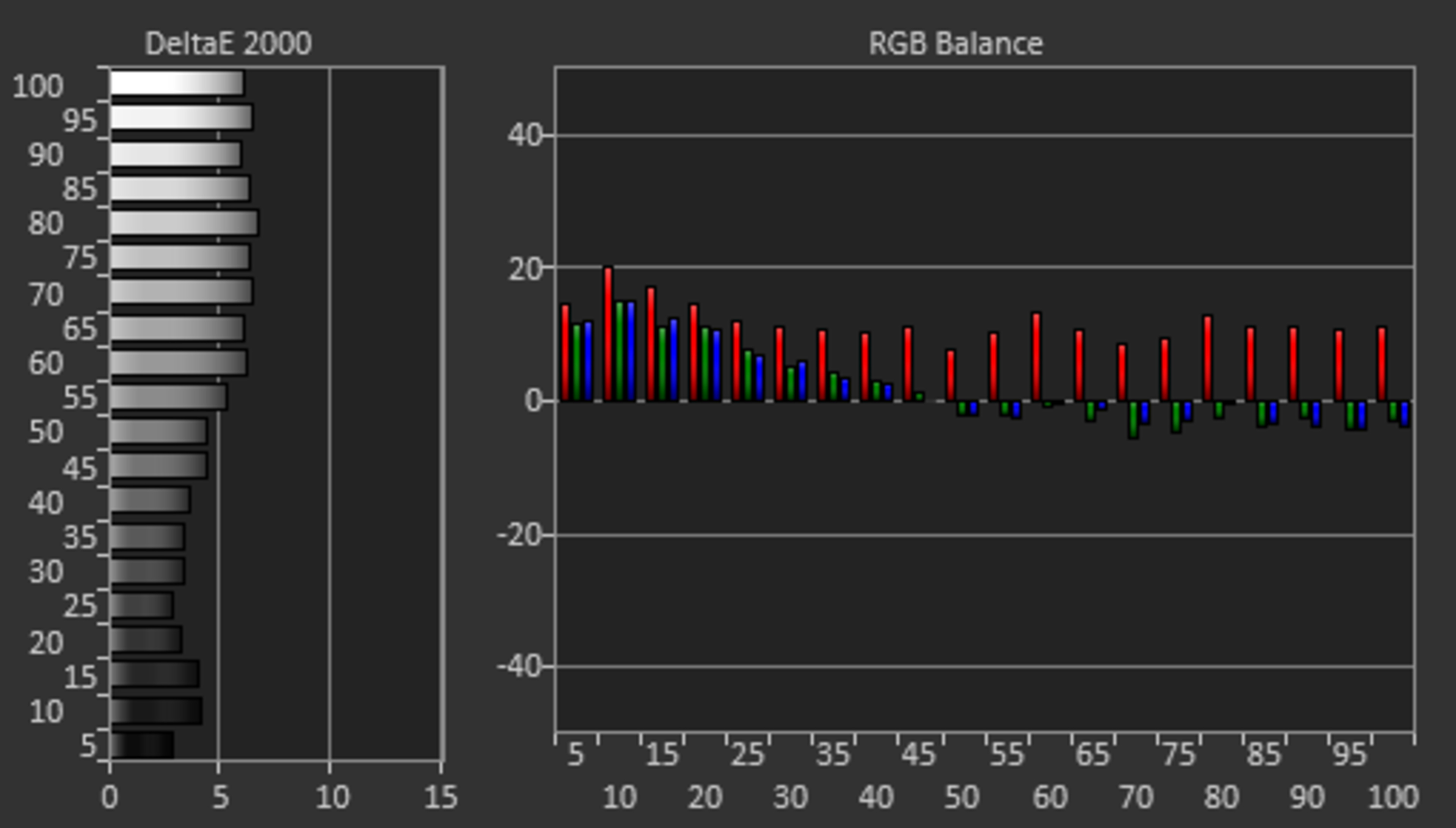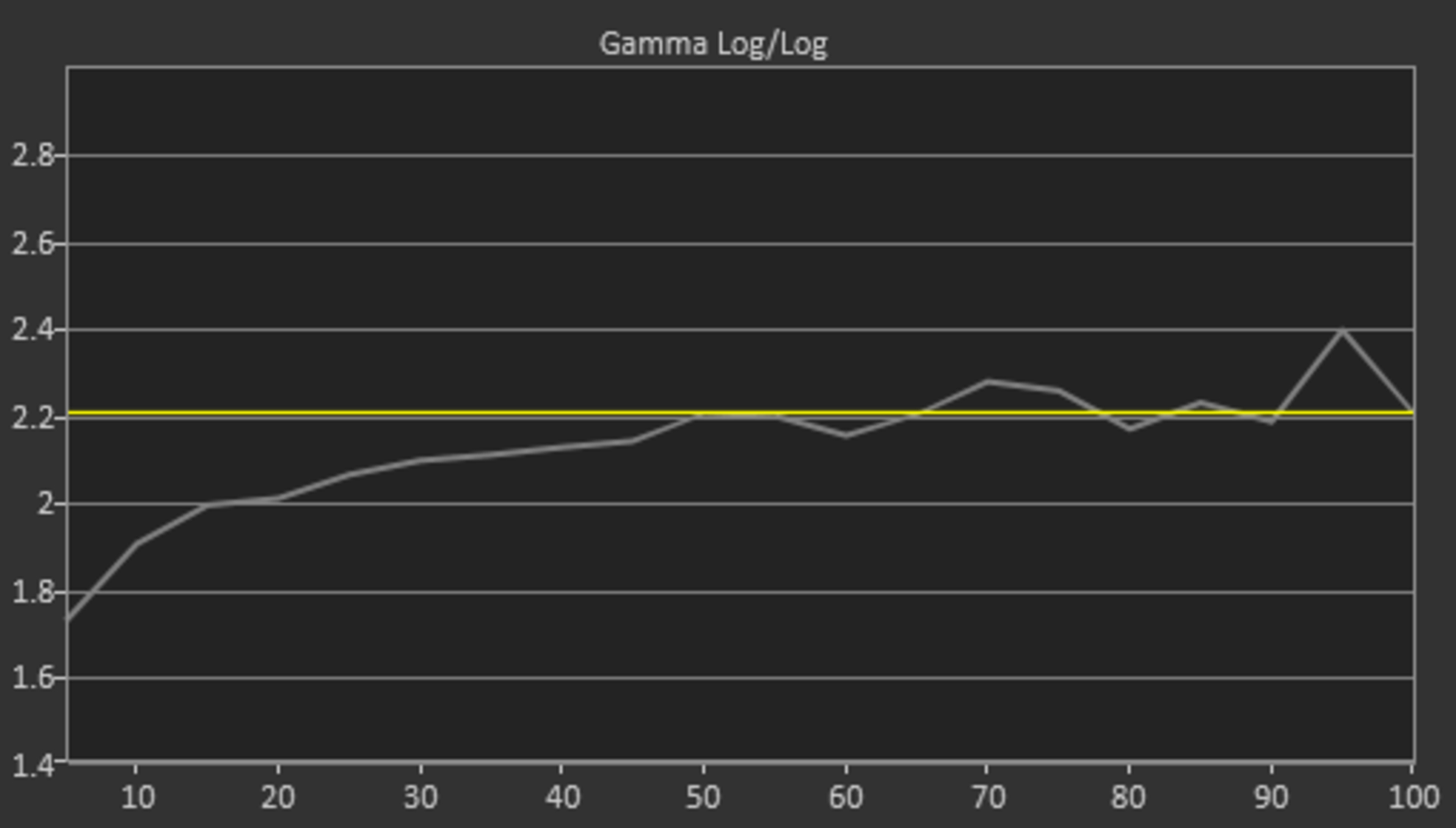 Decent out-of-the-box color accuracy. Most colors are slightly inaccurate and white balance is off, which affects shades of gray. The color temperature is slightly cold and for the most part, gamma follows the target curve well, except extremely bright scenes may be too bright.