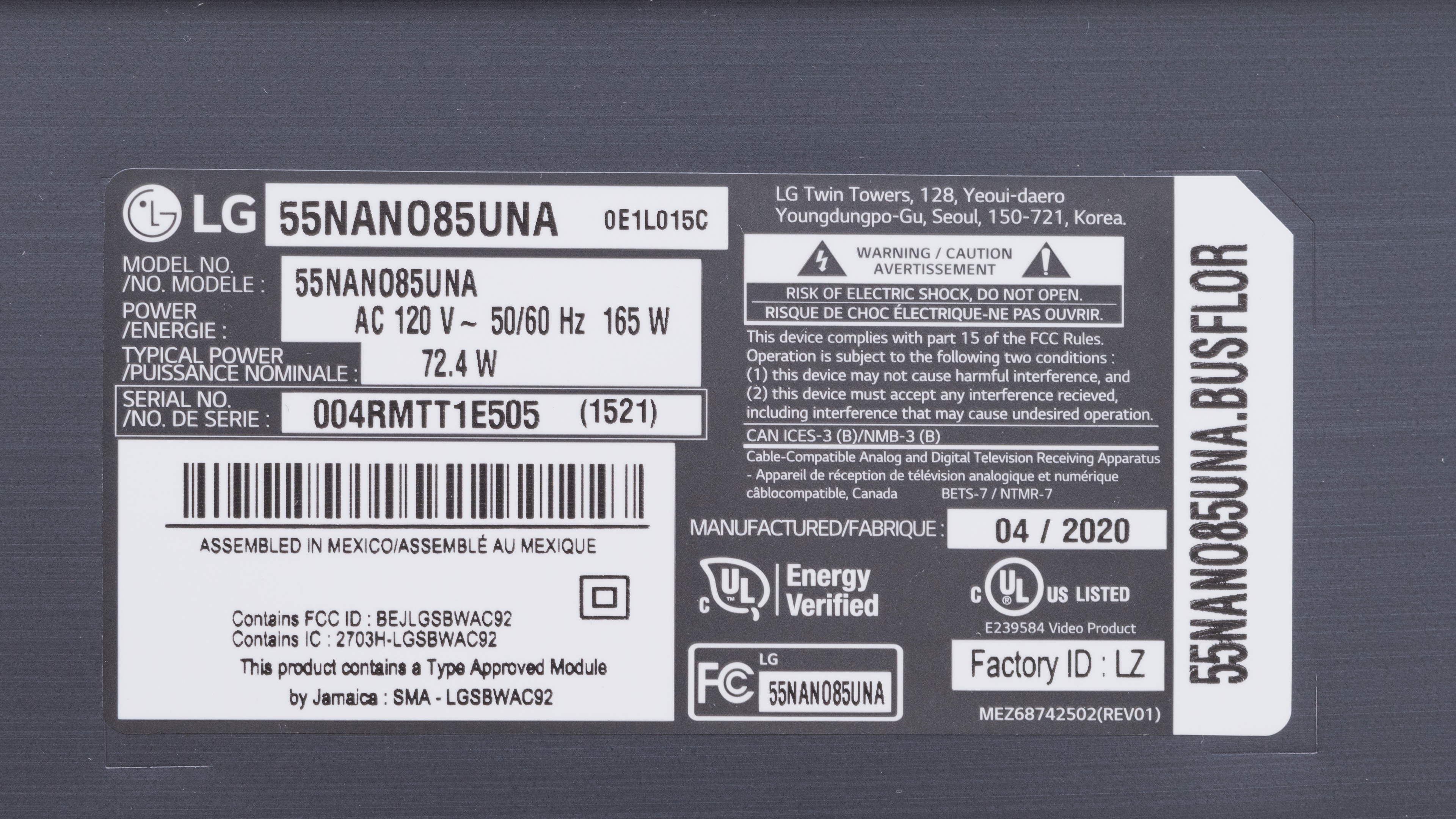 We tested the 55 inch LG NANO85 2020 (55NANO85UNA) and we expect our results to be valid for the 49 inch (49NANO85UNA) and 65 inch (65NANO85UNA) models too. The European version, the LG NANO86, comes with a different stand, similar to the one on the LG SM8600.