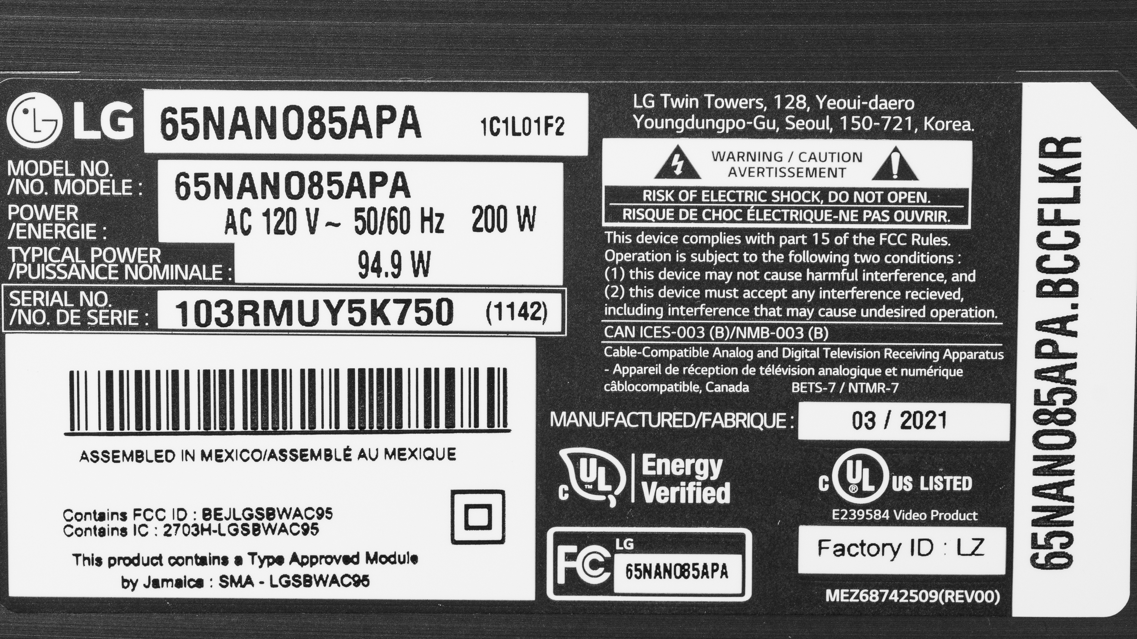 We tested the 65 inch LG NANO85, and the results are also valid for the 55 inch and 75 inch models. There's a 50 inch model available in Canada and Europe, but it has a VA panel with a higher contrast ratio and worse viewing angles. The 86 inch model is a bit different because it has full-array local dimming instead of being edge-lit, so the local dimming will perform better, and it also has different speakers. The Europe model is labeled the LG NANO86, and it has a center-mounted stand, and the results are also valid for it. The NANO85 only seems to be available at Costco in the US, but it's available at various retailers outside the US. You can see the differences between each model below.