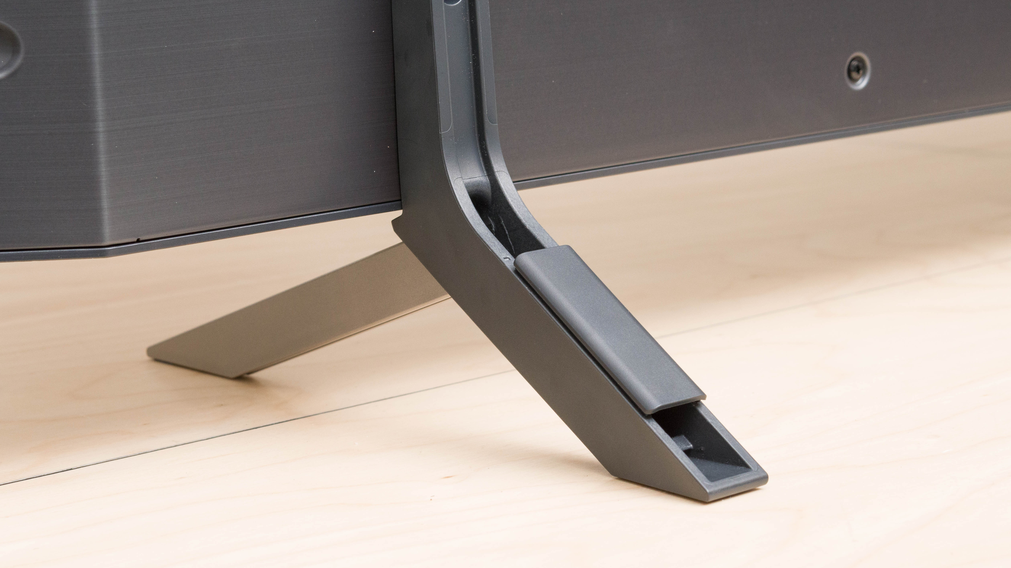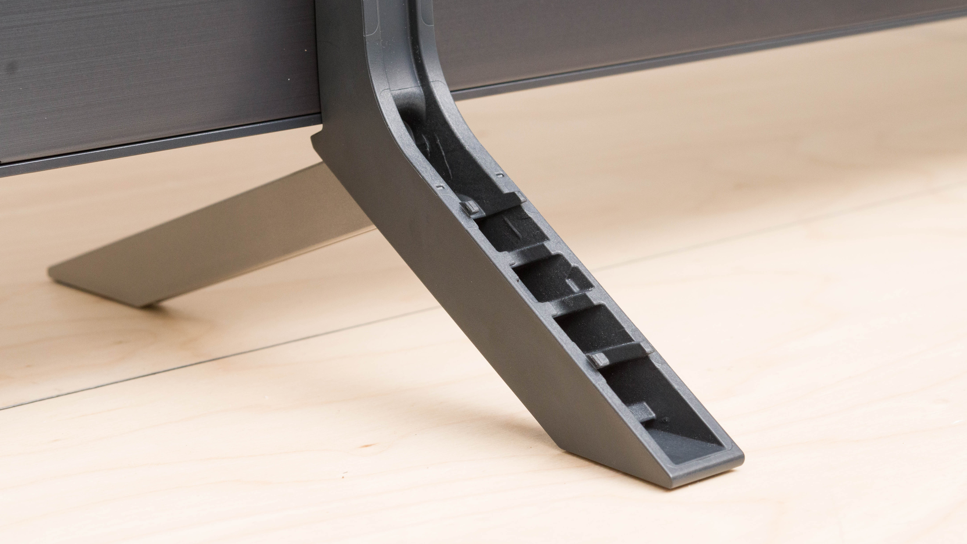 The stand consists of metal feet that support the TV well. They raise the TV 2.5 inches off the table, or 3.5 inches to the bottom of the screen, so placing a soundbar in front won't block the screen. You can also place the feet in two different configurations: