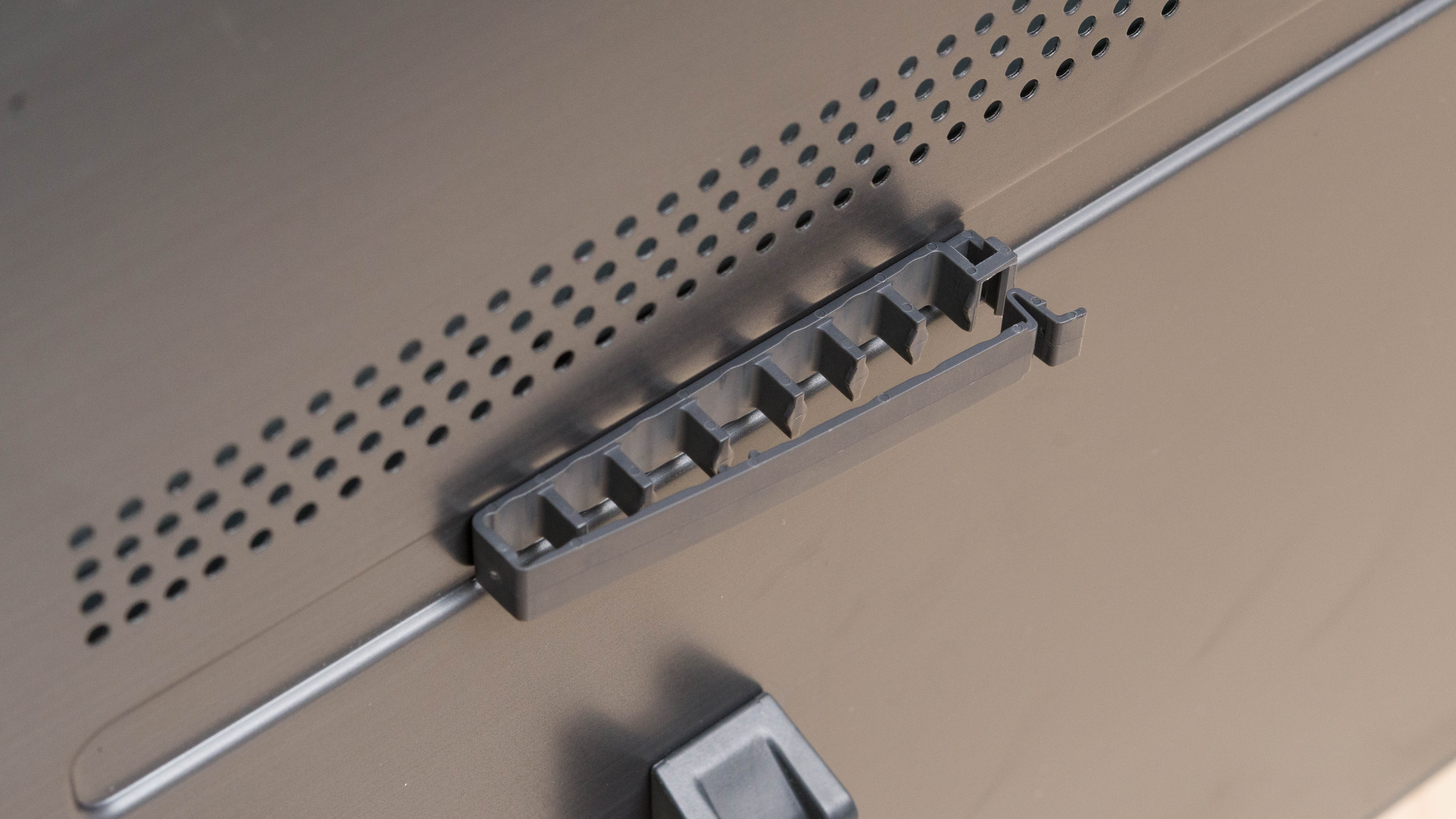 The back panel is brushed aluminum that feels solid. It's smooth for the most part, and there are air vents near the top. You can route cables through the feet, which come with rubber covers, and there are clips on the back for cable management.