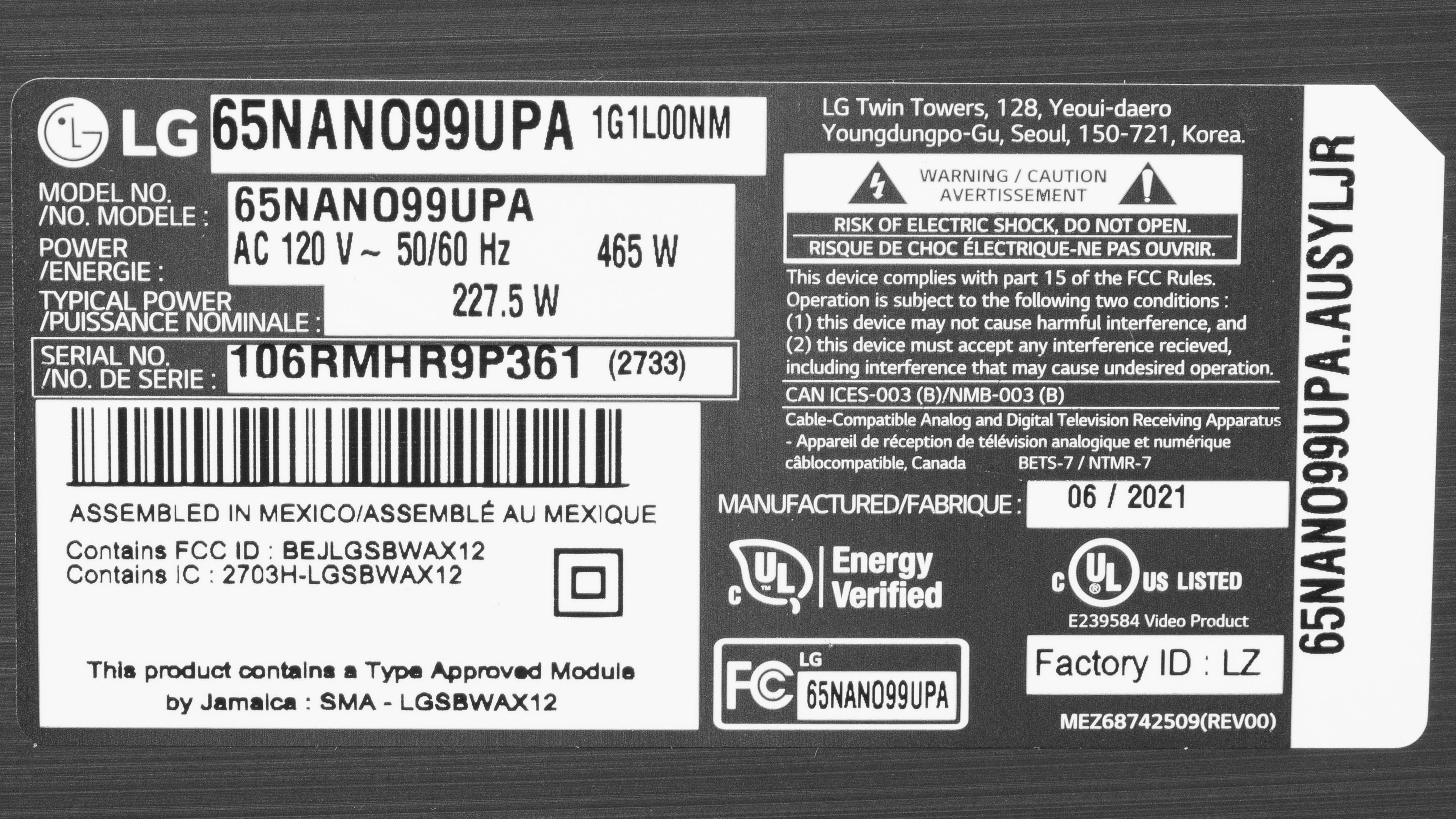 We tested the 65 inch LG NANO99, which is also available in 75 and 86 inch sizes, and our results are valid for both sizes. It's only available in the United States, and even though there's a LG NANO96 model available in Europe that uses the same processor, it has a different speaker configuration and a different stand. While all of our results aren't valid for that model, we don't expect the picture quality to be much different.