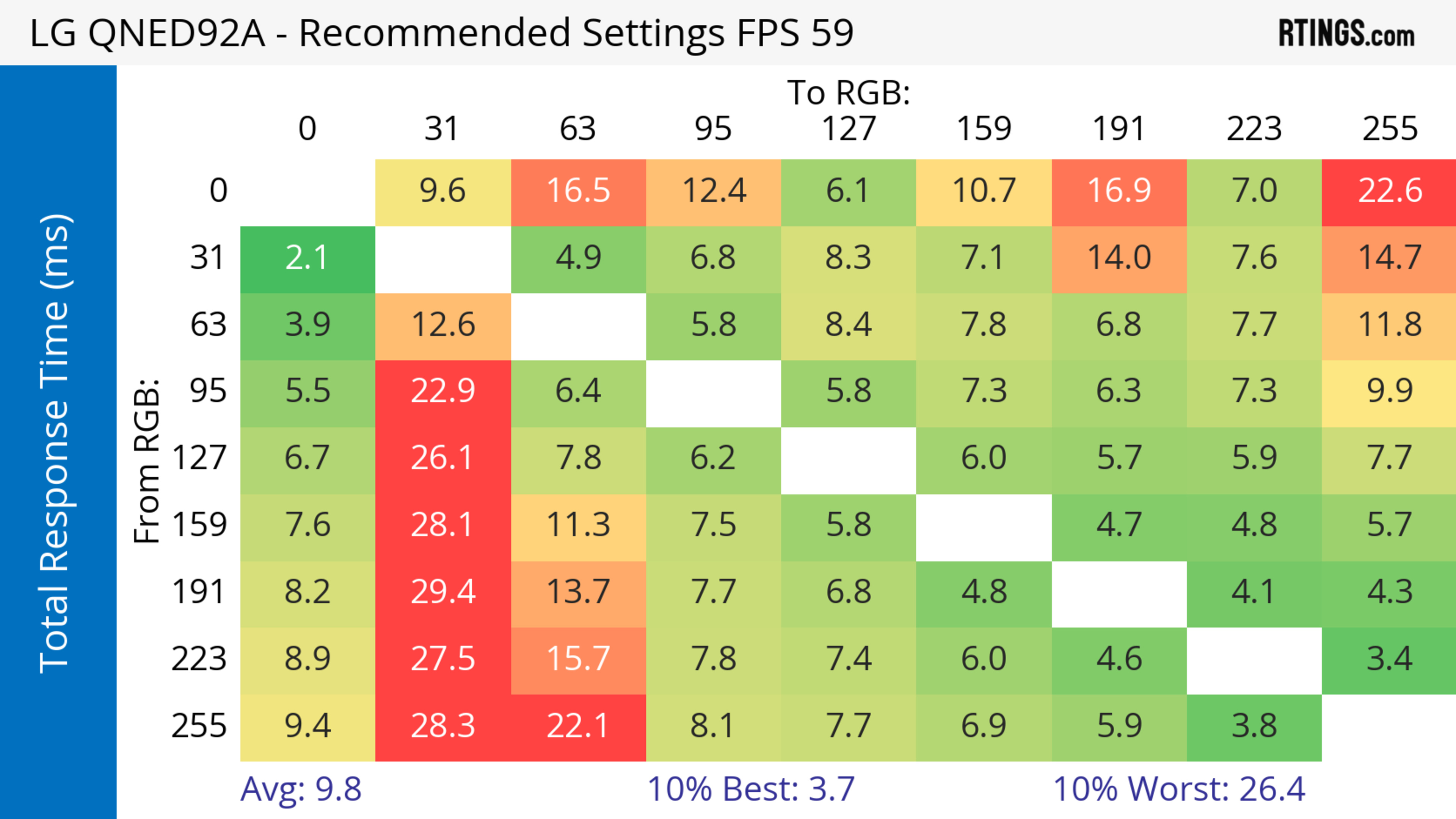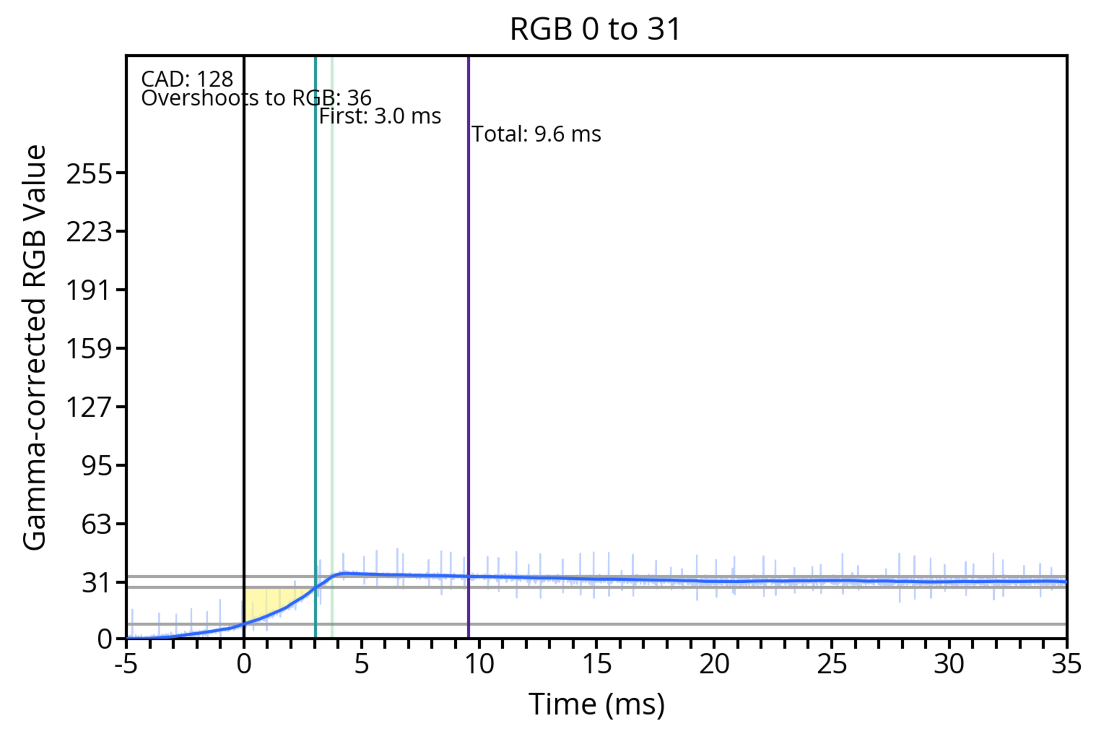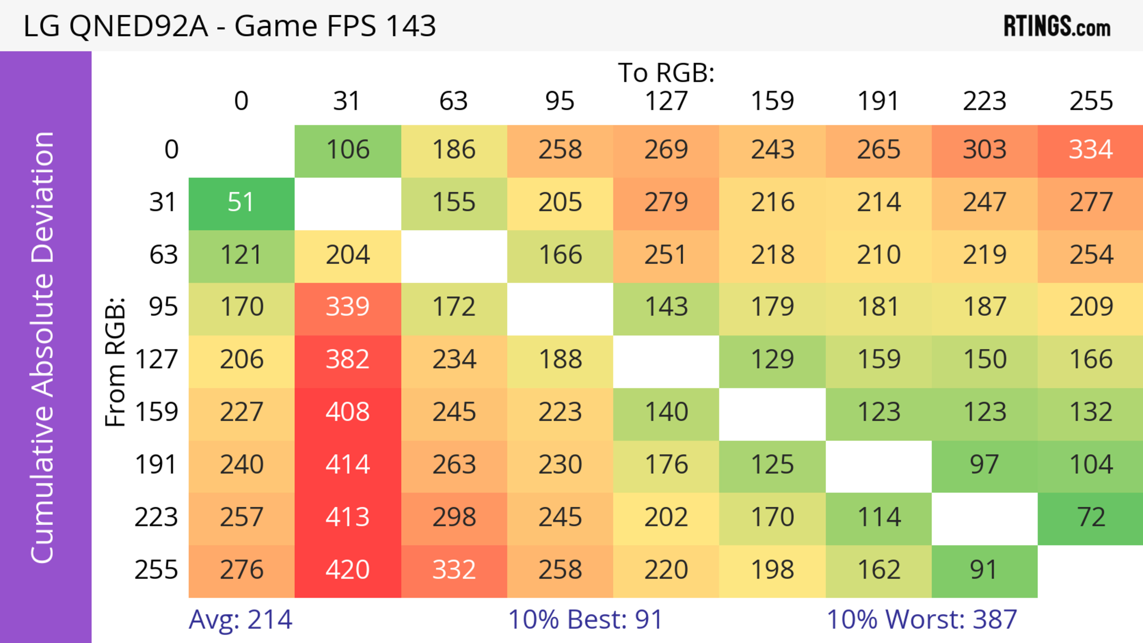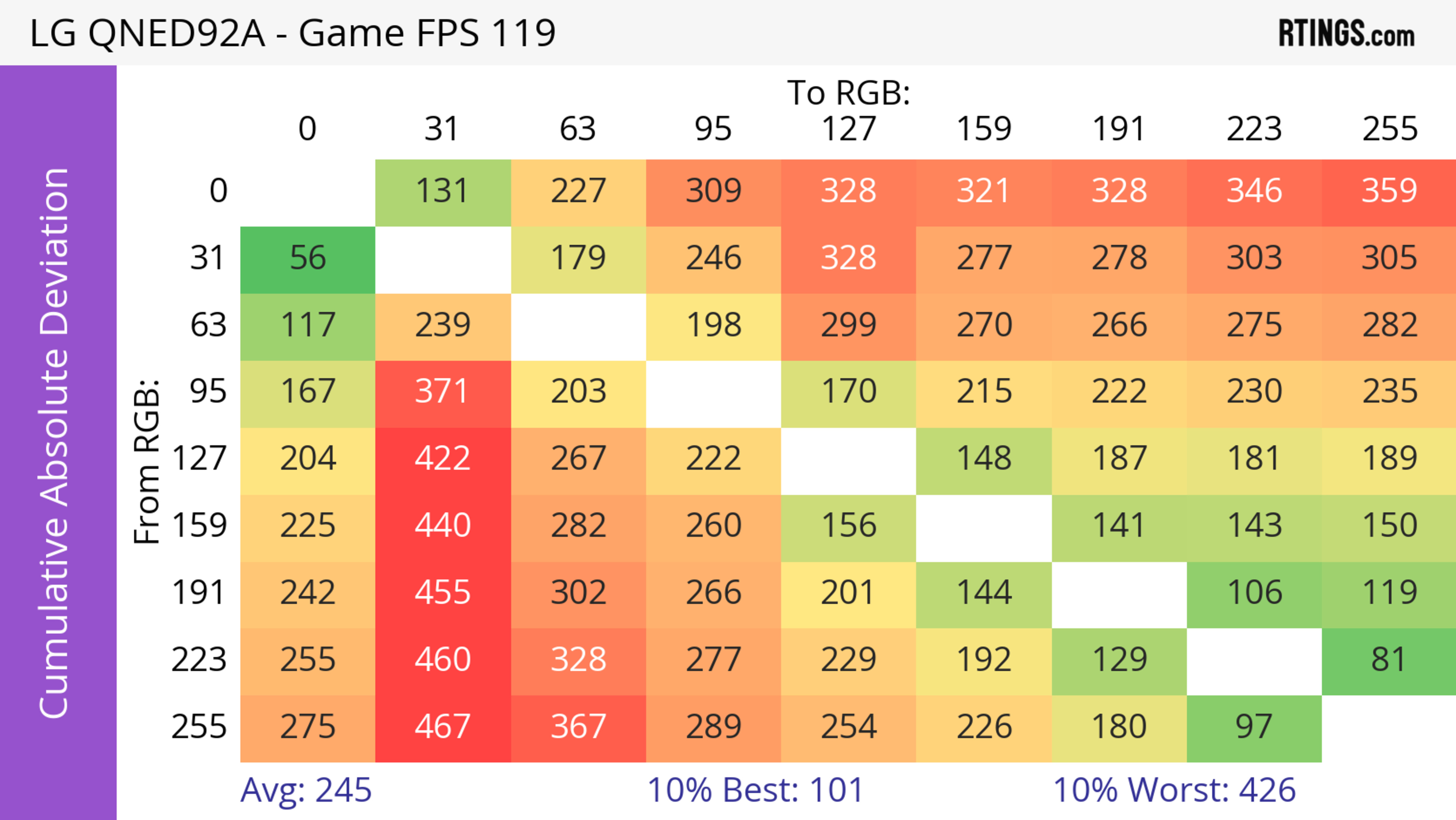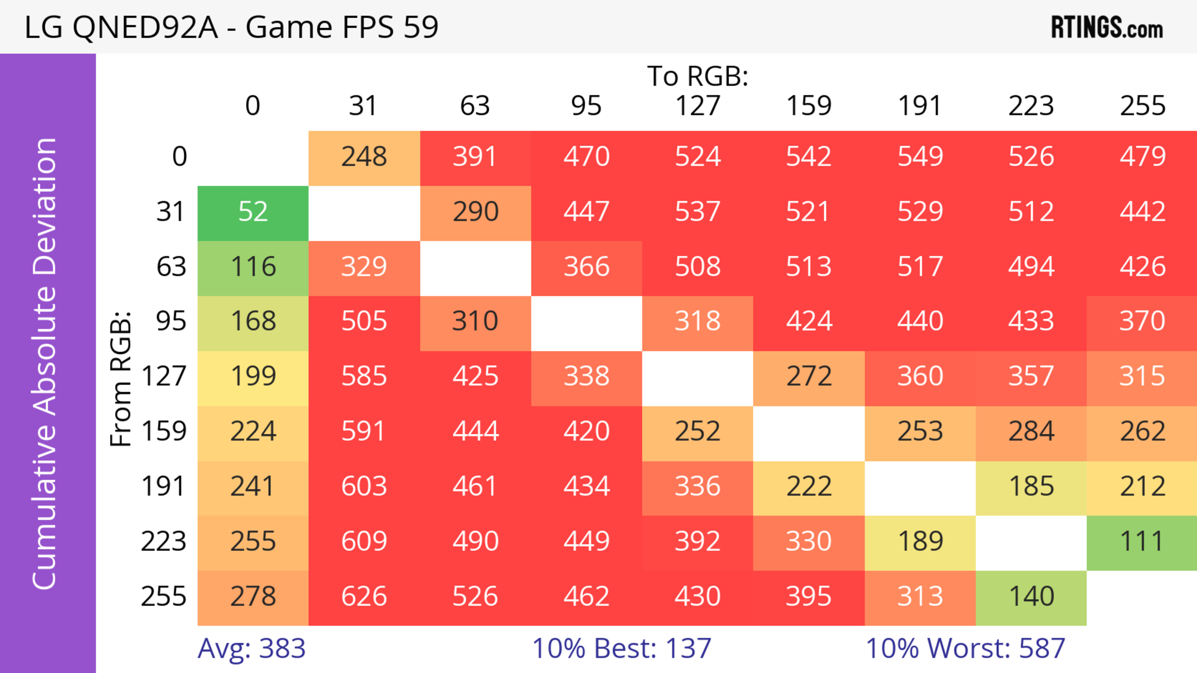 Unfortunately, dropping down to 60Hz increases the total deviation considerably, and almost all scenes look bad. There's no noticeable overshoot or inverse ghosting, but the TV is just extremely slow to transition between shades.
