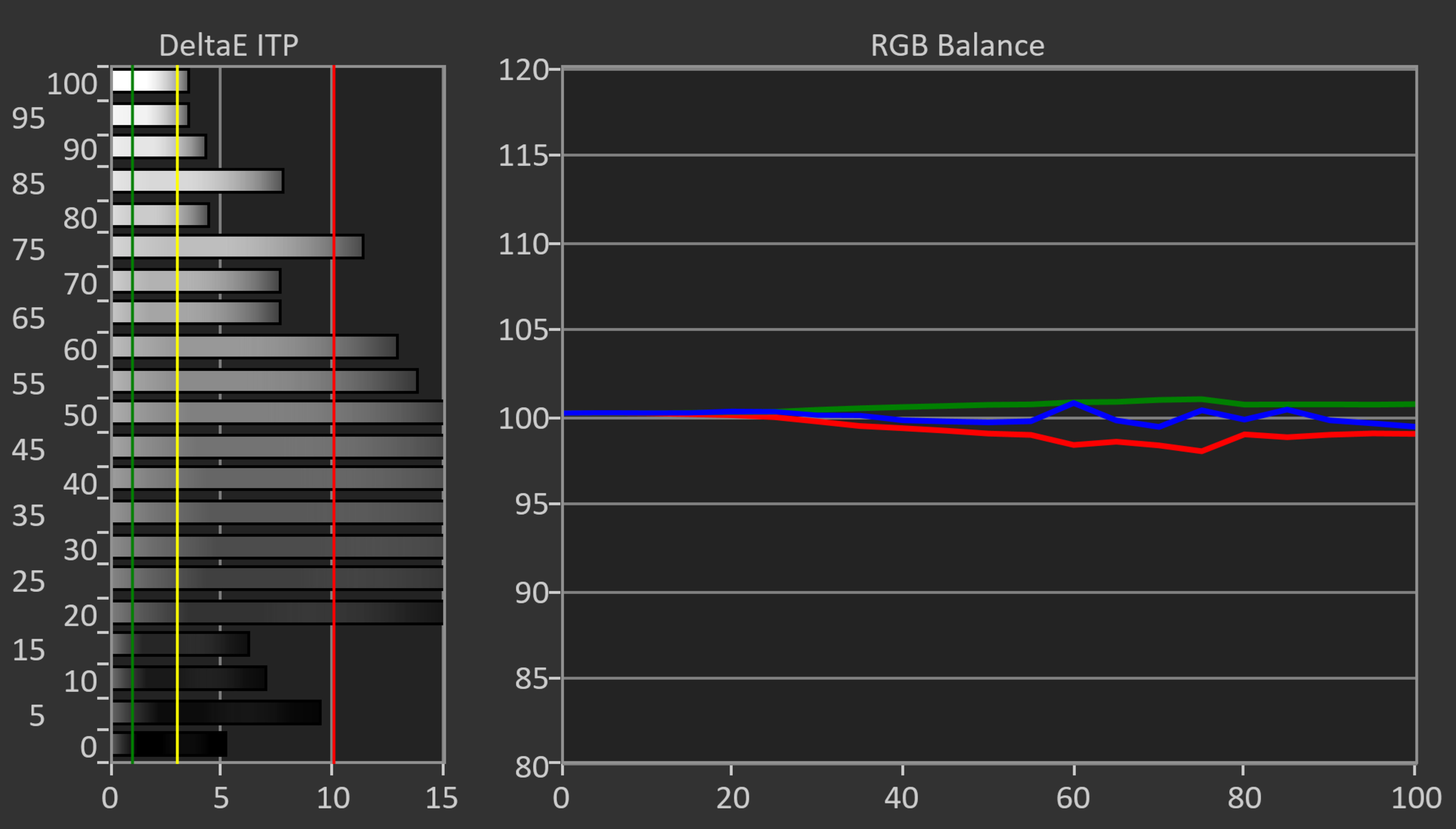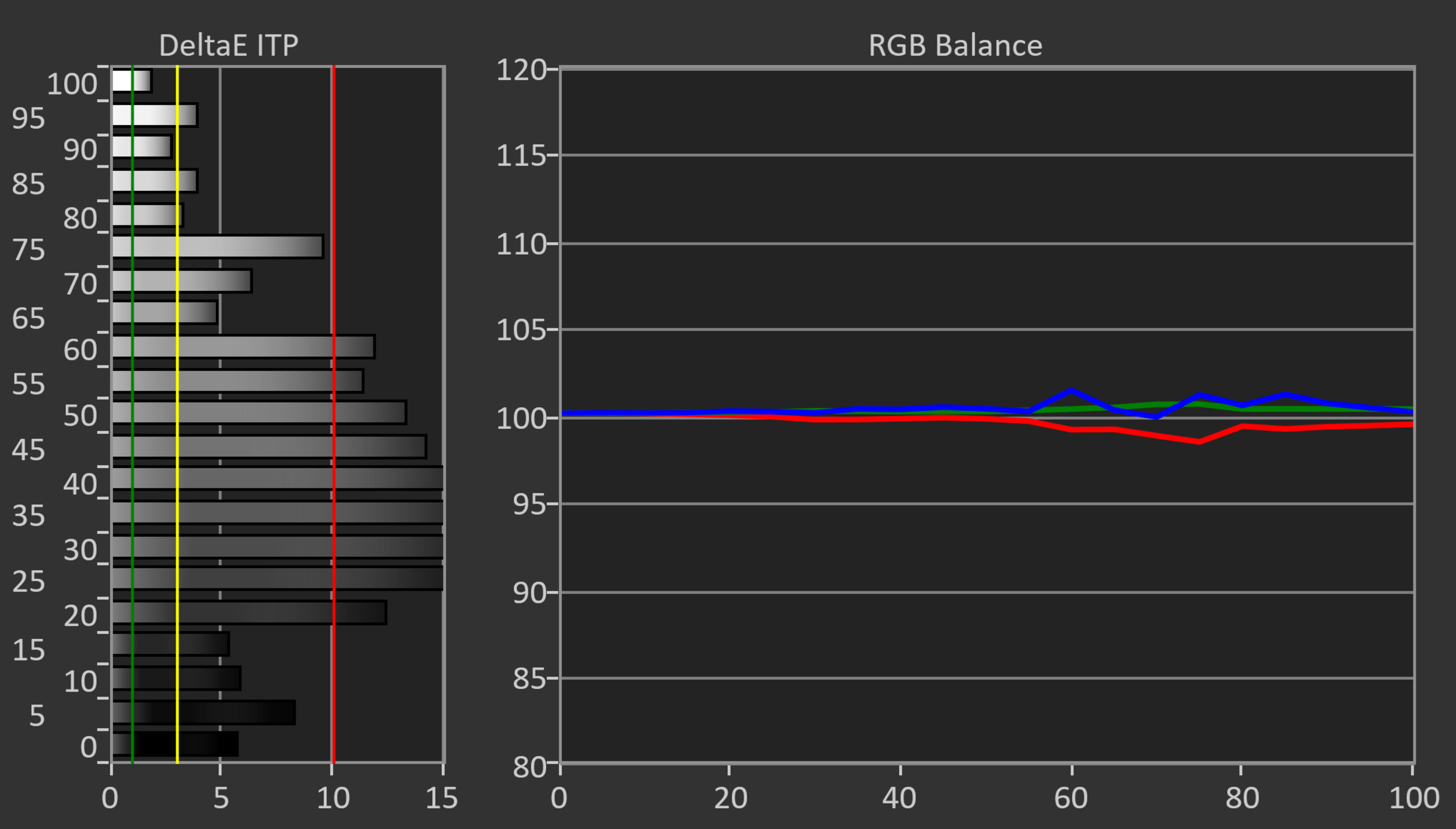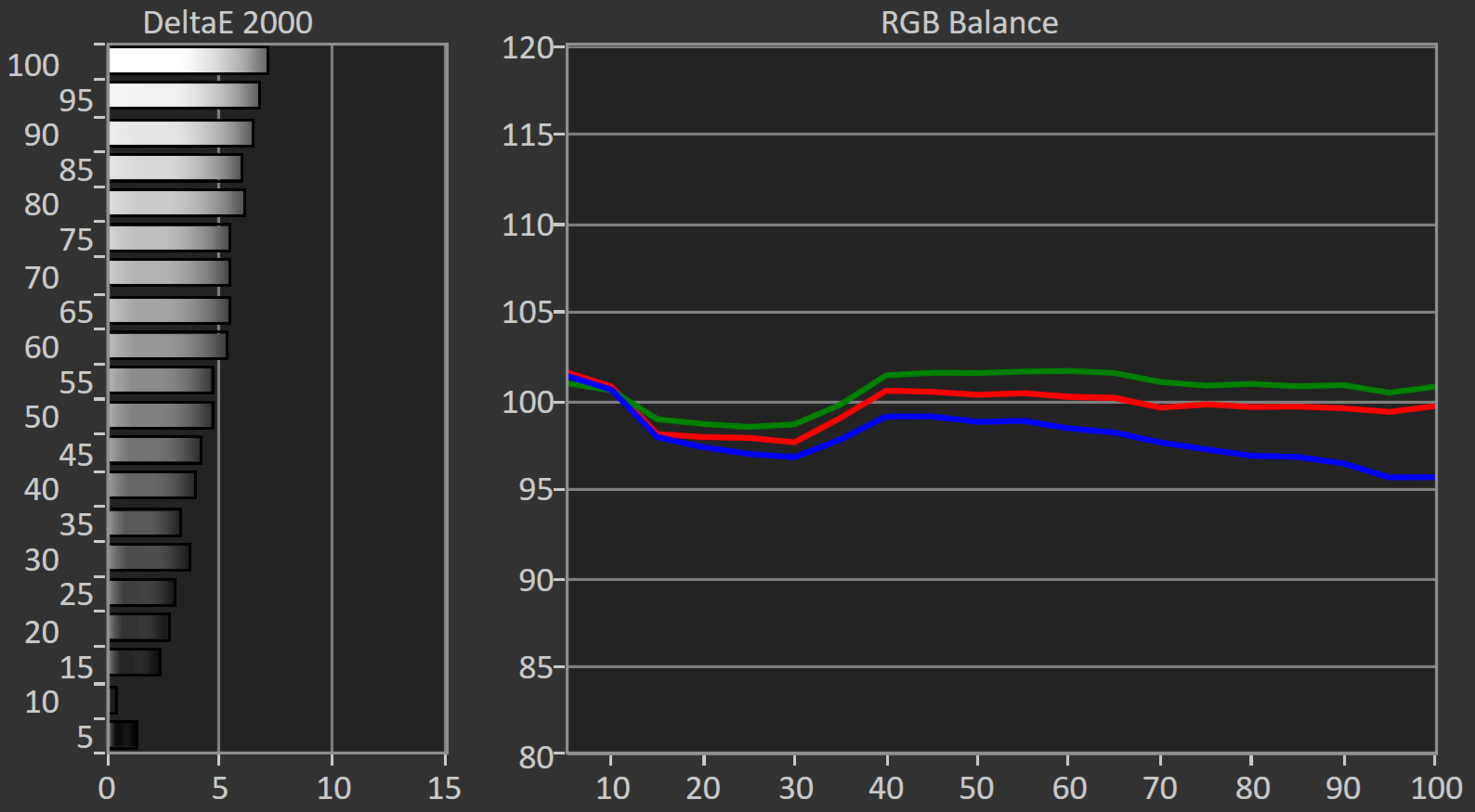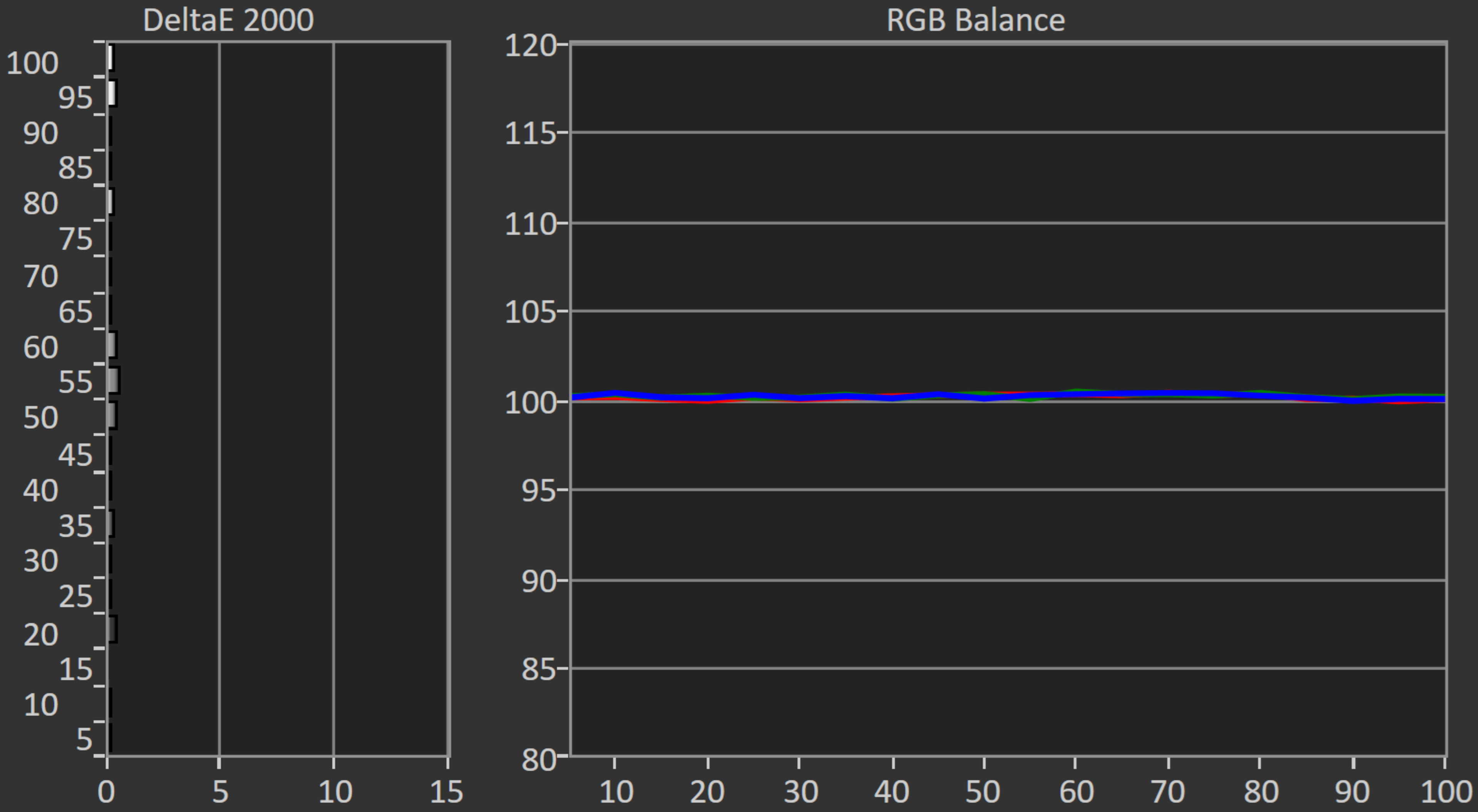 This TV is really easy to calibrate and delivers fantastic accuracy after calibration. The white balance and gamma tracking are both nearly perfect, with no remaining issues. Saturated reds are still a bit off, but it's not noticeable, and all other colors are nearly perfect.