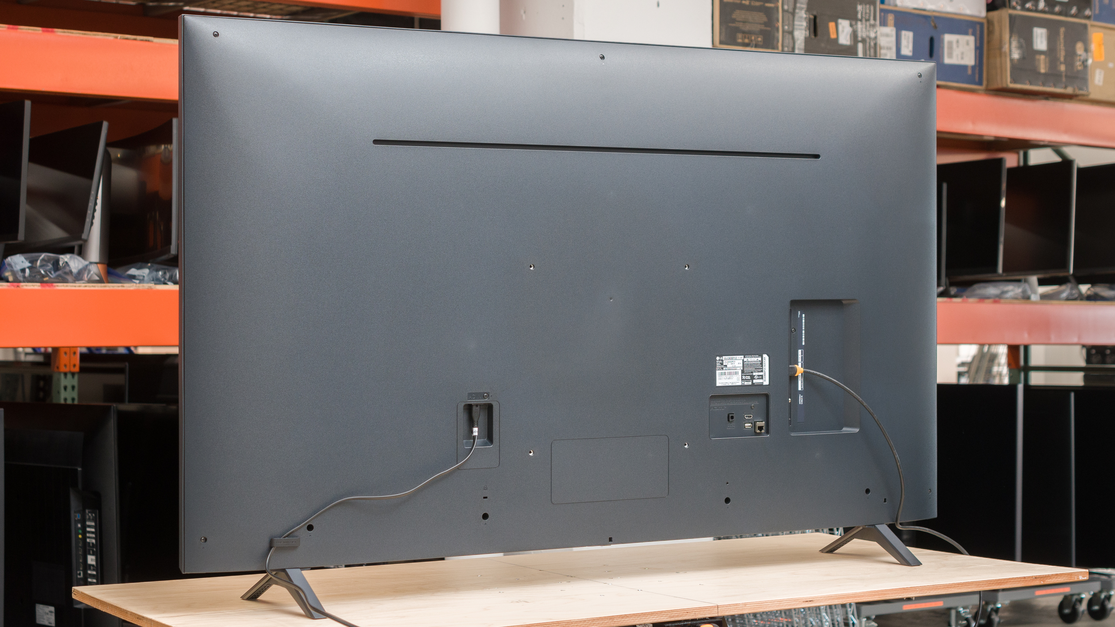 The back of the TV is very plain. There are hooks on the back of the TV to help with cable management. Most of the inputs face to the side, but they're inset into the back of the TV, making it difficult to access if the TV is wall-mounted on a fixed stand. The back of the 43-inch model looks a bit different, with the inputs facing out of the TV's right side.