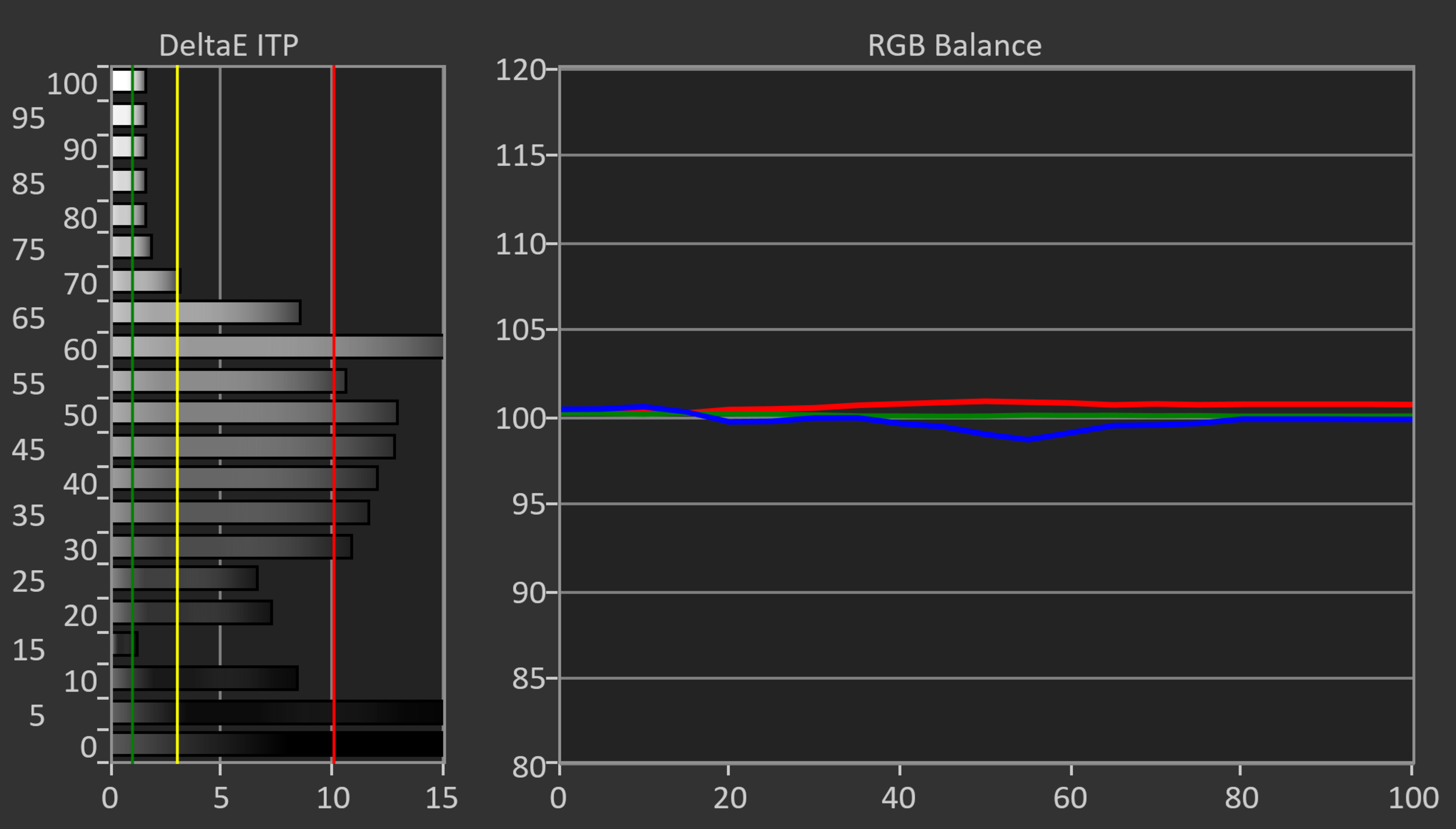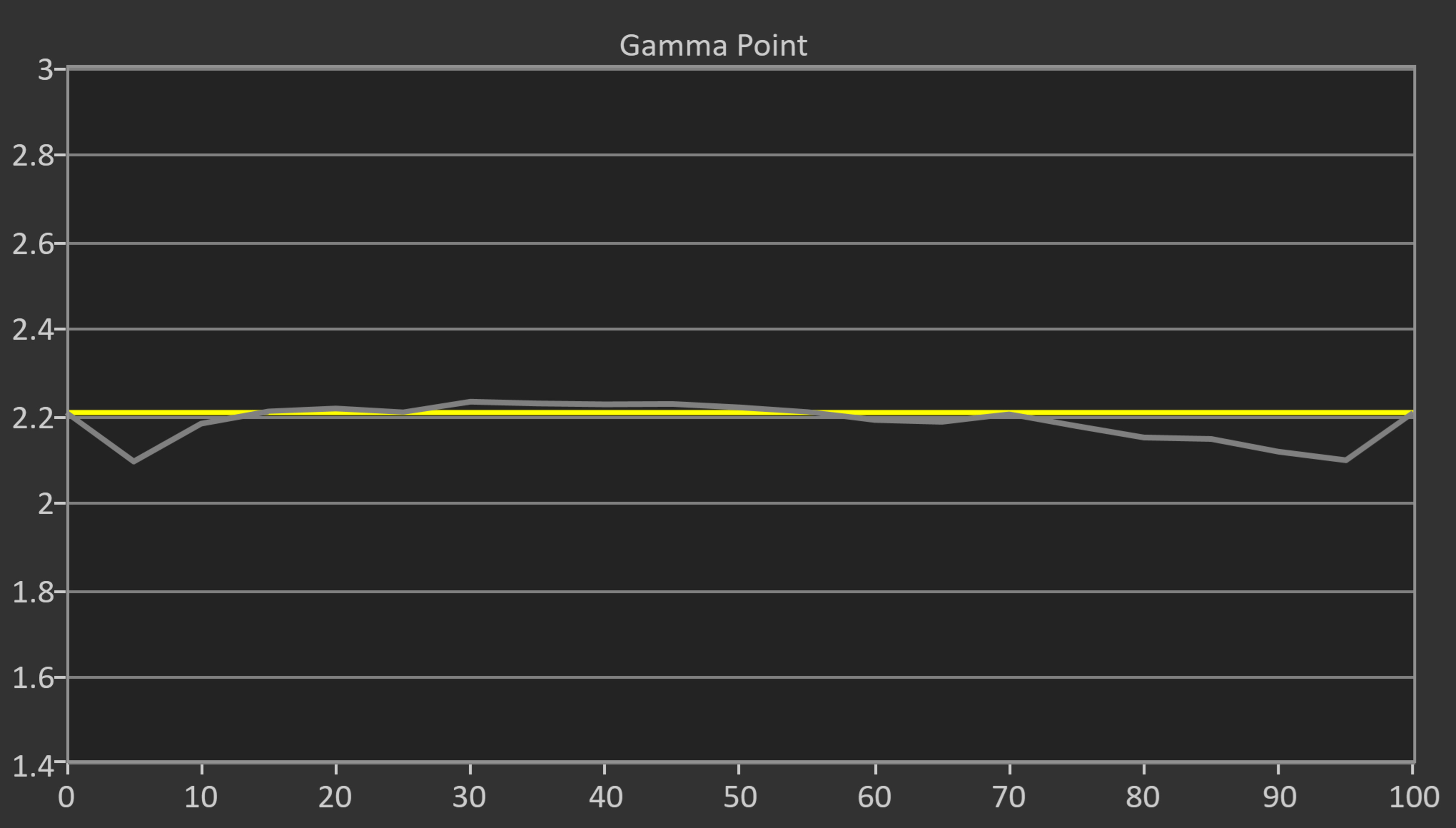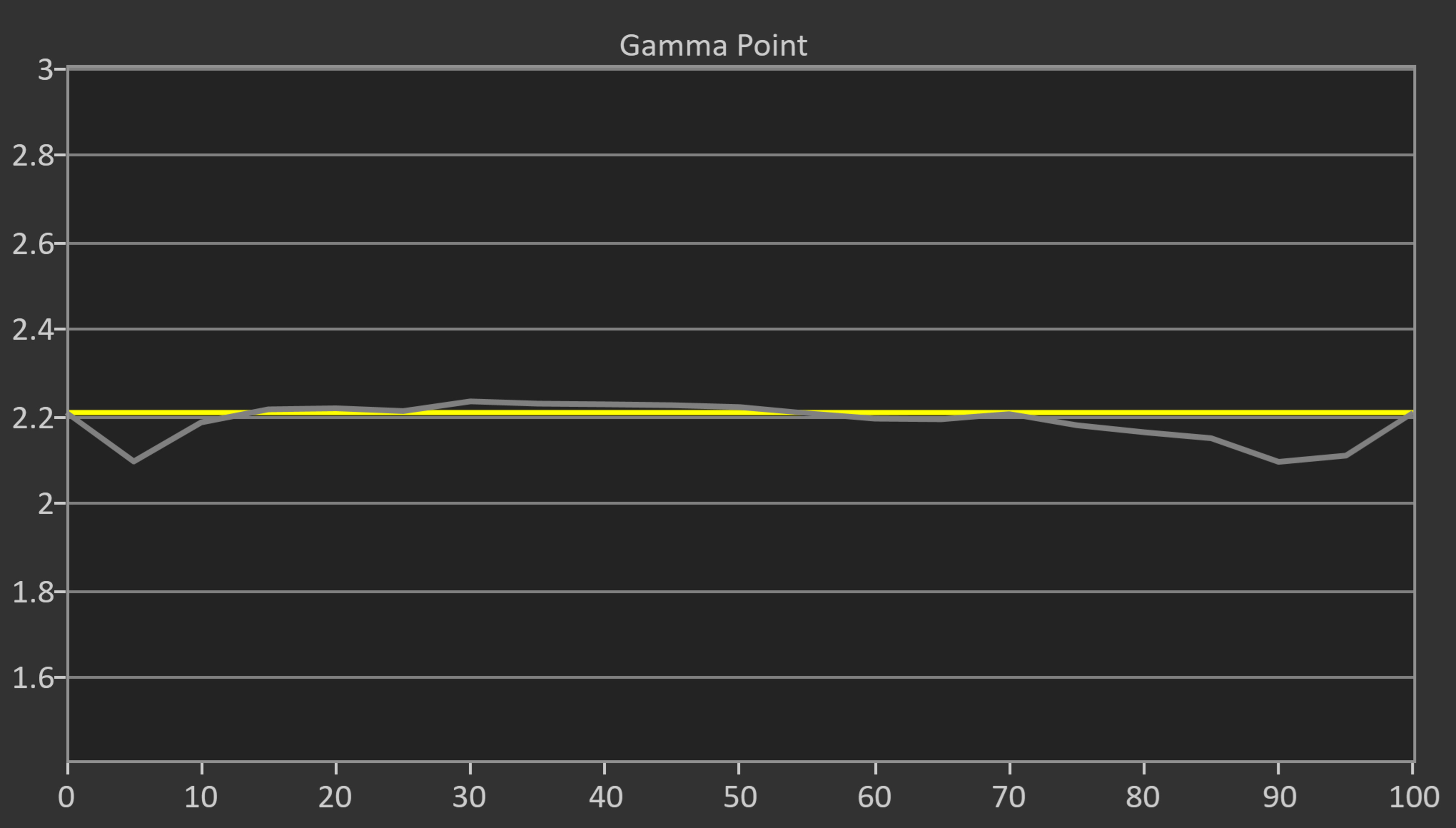 The Panasonic W70B is surprisingly accurate out of the box in SDR. The factory calibration is nearly perfect, with no noticeable issues with the white balance or color accuracy. The color temperature is also nearly perfect, and gamma closely tracks the 2.2 target.