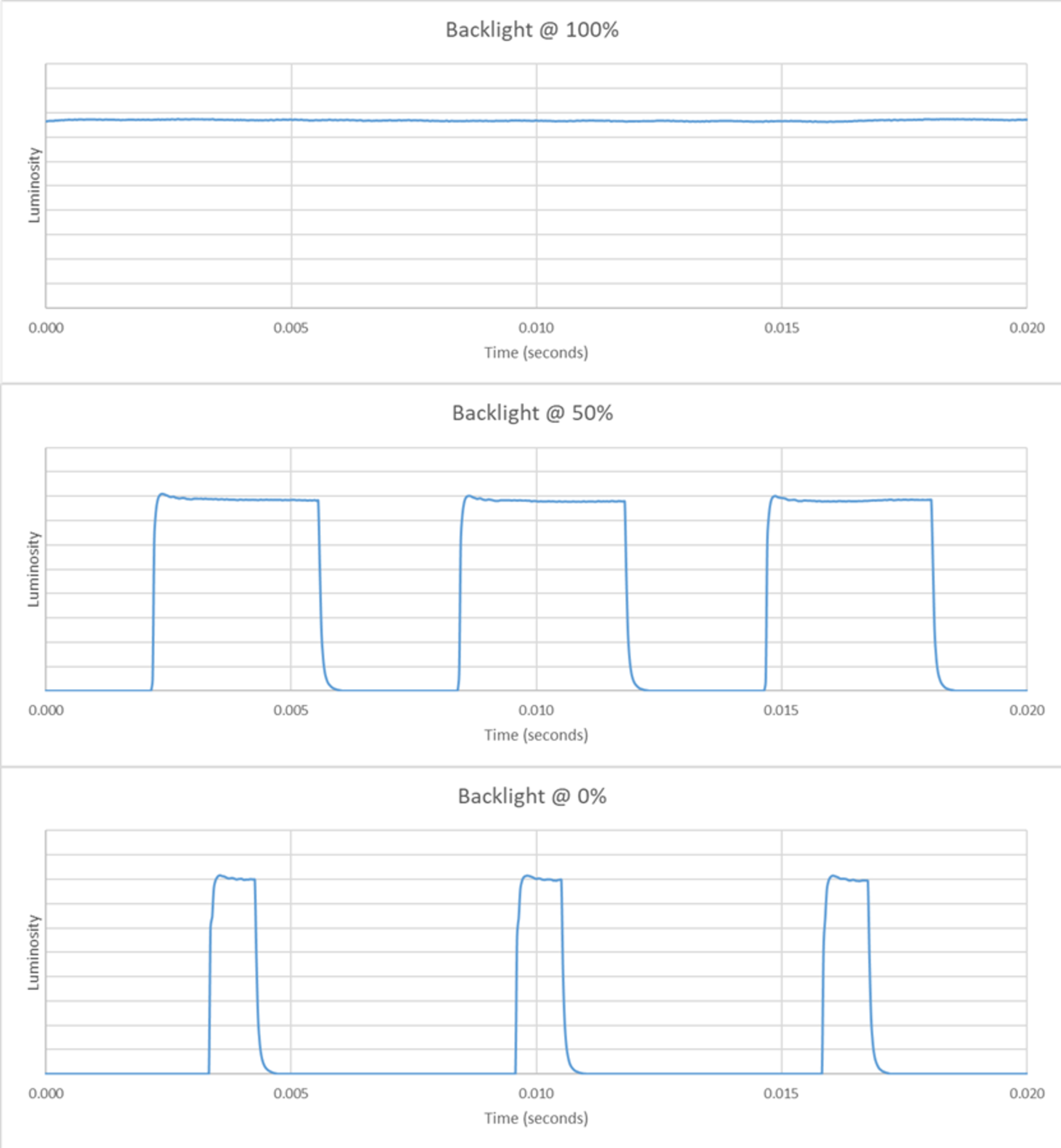 This TV uses pulse-width modulation to control the backlight, so there's noticeable flicker at any Backlight setting below max. It flickers at a low frequency that isn't a multiple of 60, so it's noticeable and contributes to the TV's uneven frame cadence.