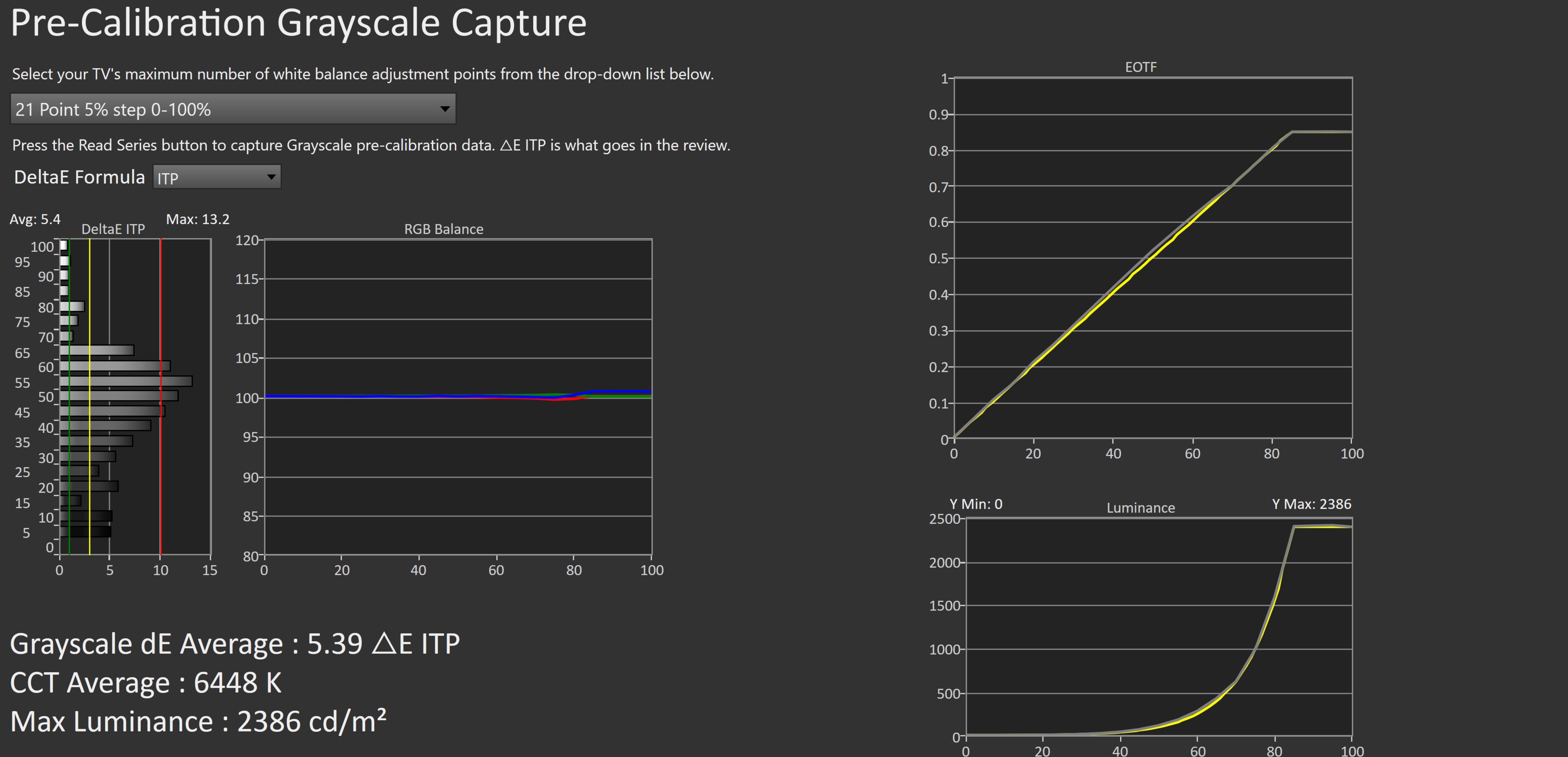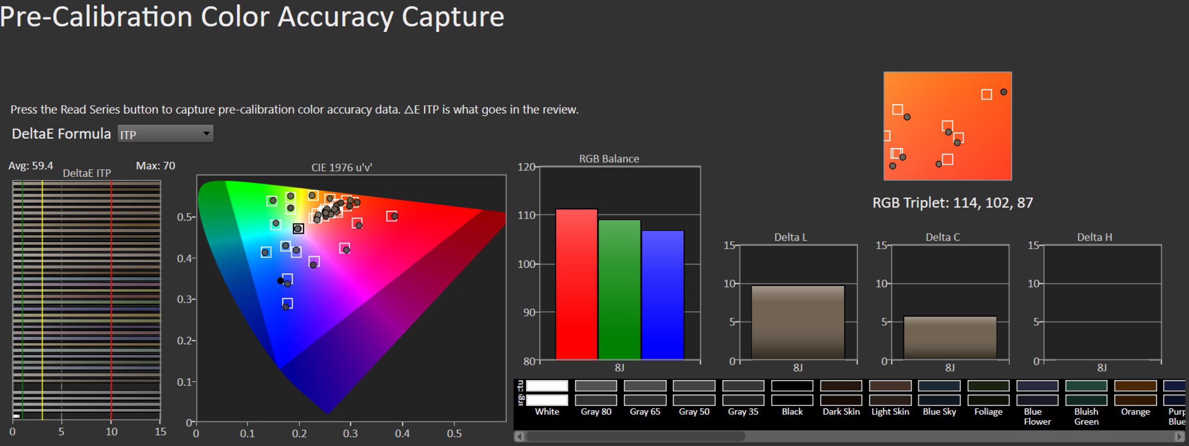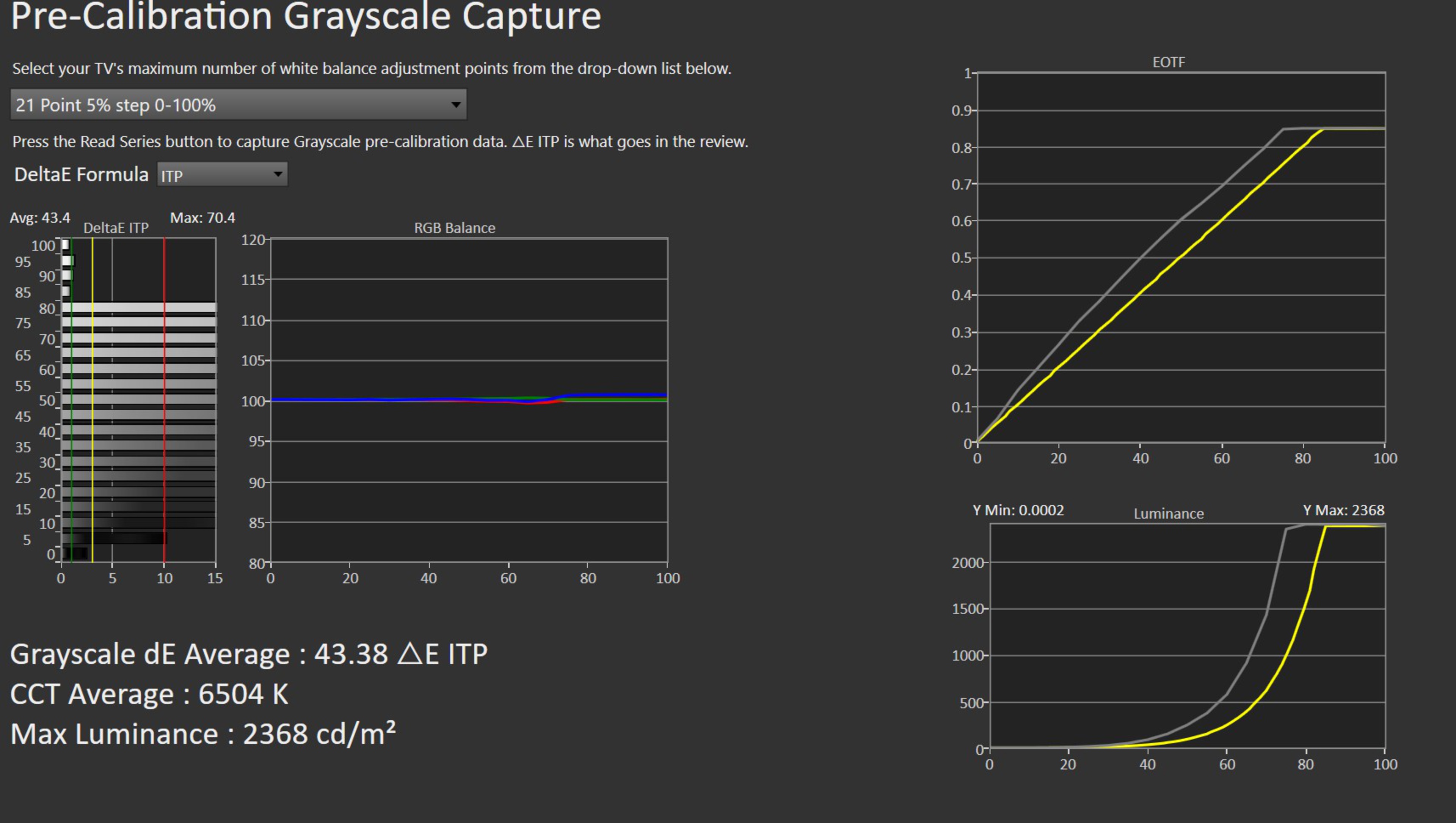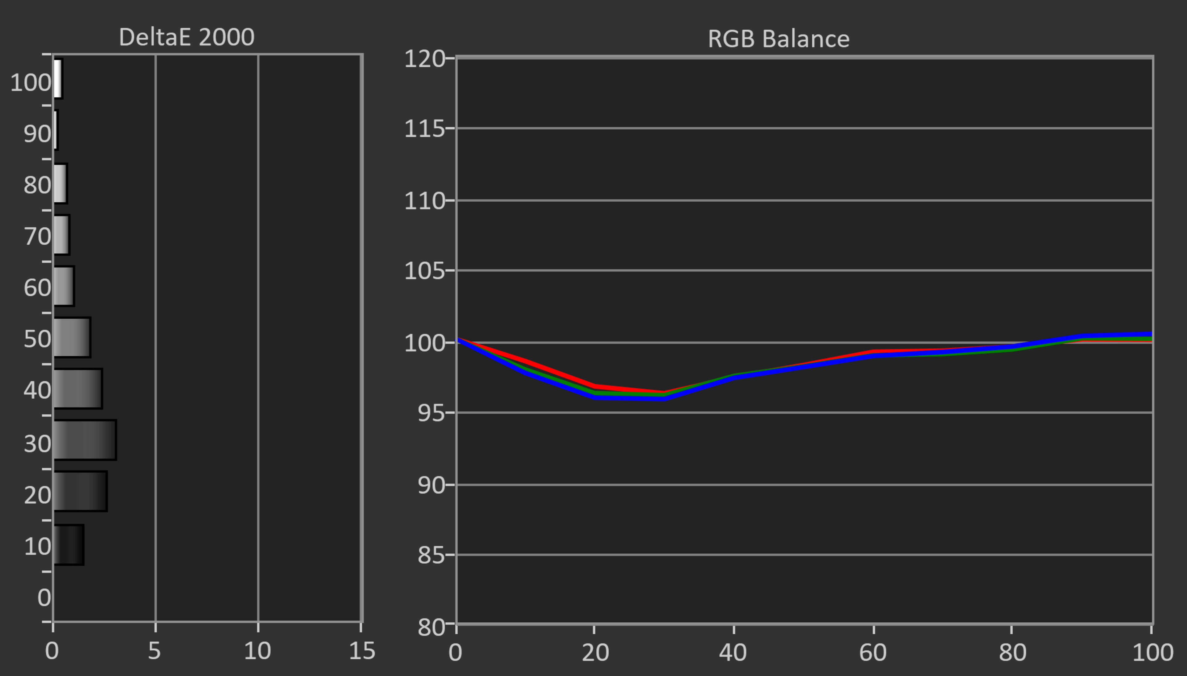 With the Panasonic Z95B's HDR brightness set to 70/100, the TV has outstanding HDR accuracy before calibration. The white balance is a bit off in mid grays, but it's hardly noticeable, and its overall white balance is fantastic. The color temperature is almost perfectly at the industry standard 6,500K, which is outstanding. Its overall color accuracy is excellent, with only minor mapping errors that won't bother anyone other than the most ardent color purists. This really isn't a TV that requires calibration if you care about the content creator's intent.