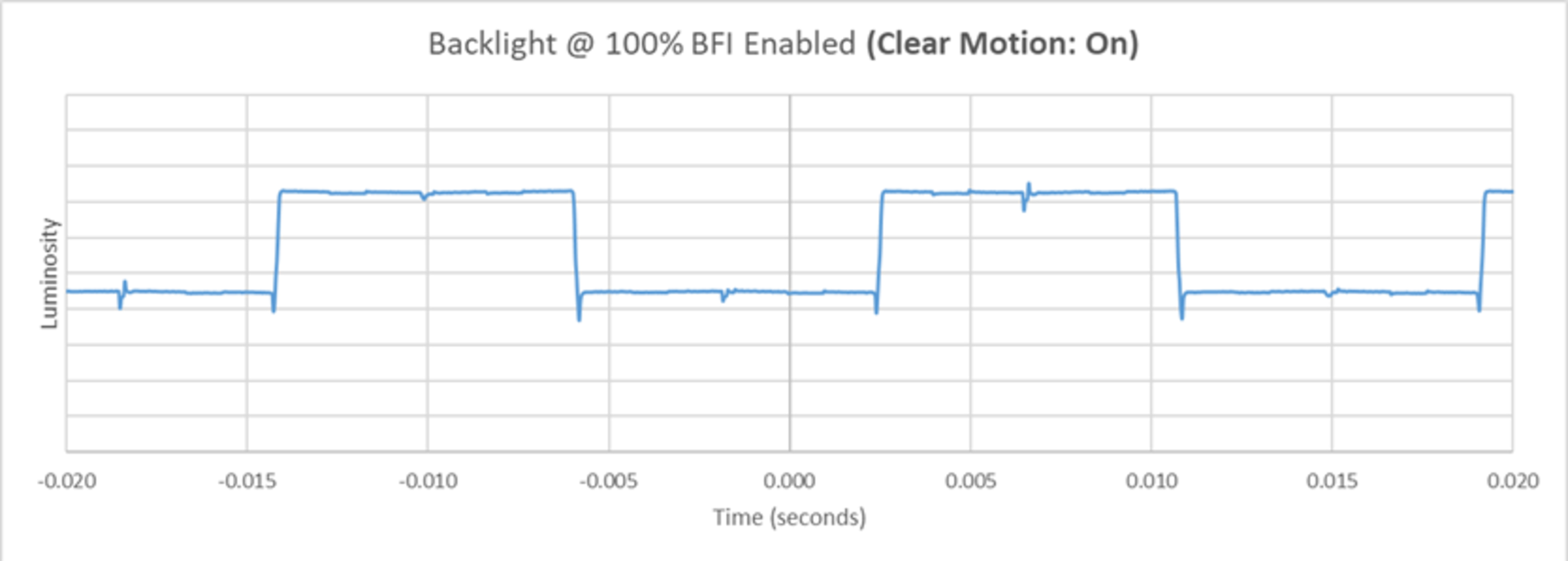 The Panasonic Z95B has an optional black frame insertion (BFI) feature that reduces the appearance of persistence blur caused by the TV's nearly instantaneous response time. Panasonic's implementation of BFI is very strange, though, as unlike any other TV on the market, the screen never goes completely black between frames; it just dims the backlight slightly.