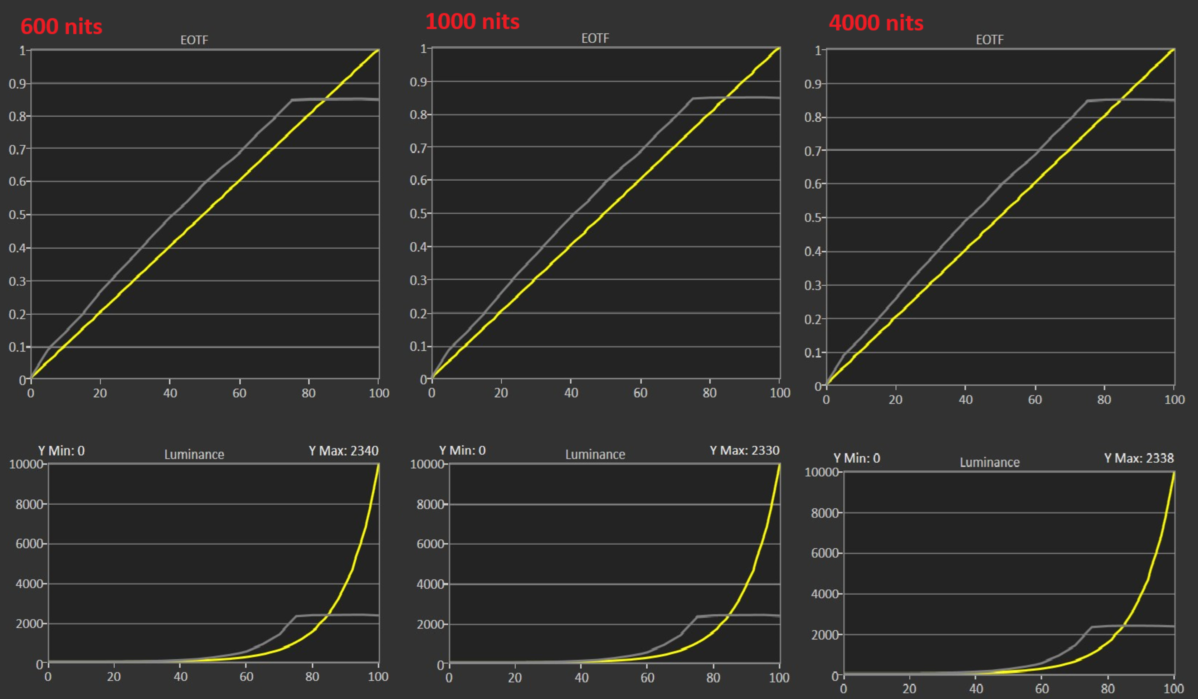 The Panasonic Z95B has outstanding PQ EOTF tracking with the TV's HDR brightness set to 70/100. With content mastered in 600 and 1000 nits, there's a sharp cutoff at 1000 nits, but the TV is bright enough to display most highlights in content mastered at those brightness levels. With content mastered at 4000 nits, the TV gradually dims very bright highlights to maintain some gradation in them, before a sharp cutoff happens at the TV's peak brightness.
