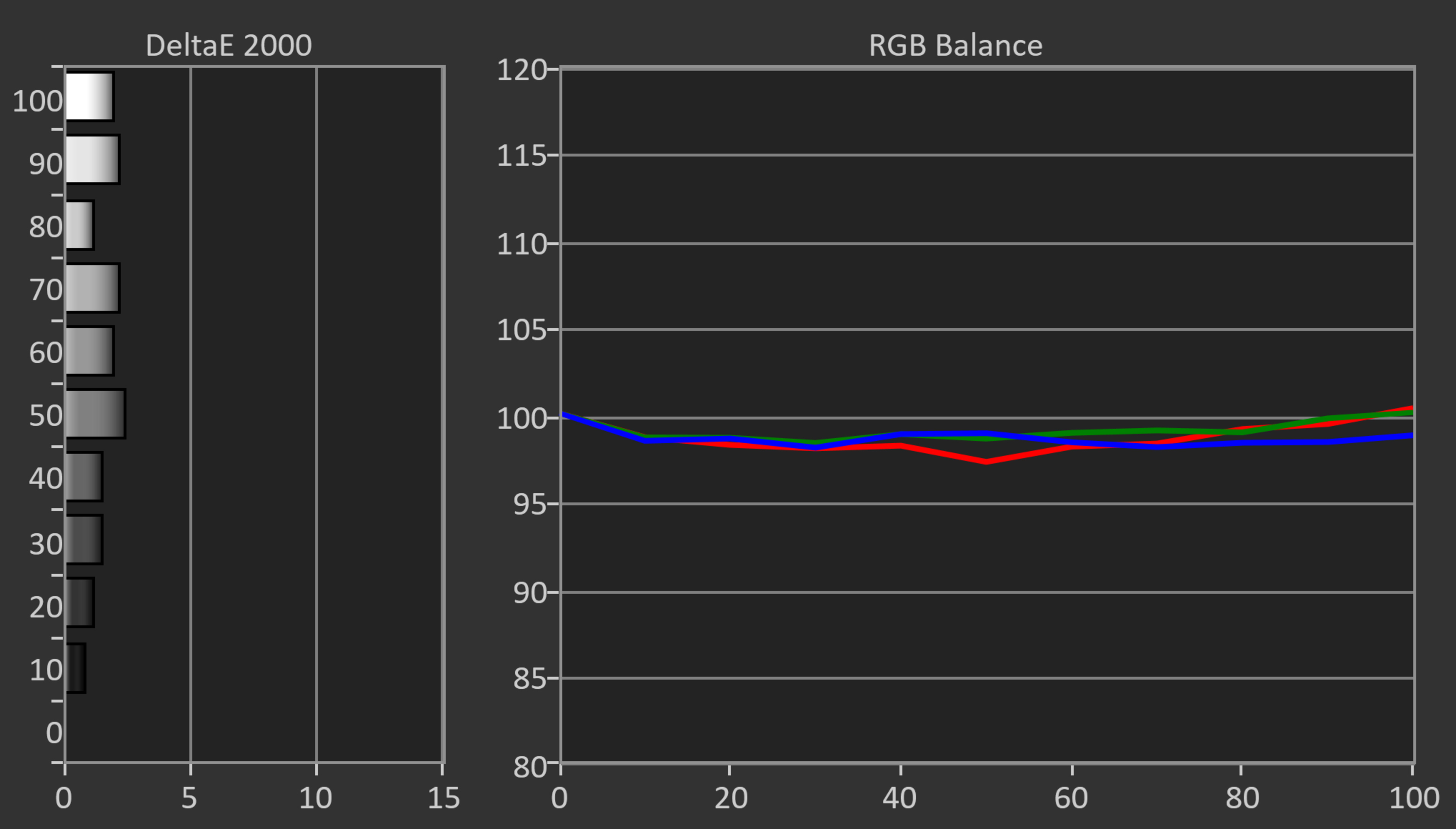 The Roku Pro Series TV has excellent color accuracy before calibration. The RGB balance is slightly off, and the gamma is between 2.2 and 2.4, resulting in an image that appears slightly too dark overall. Still, the color temperature is very close to 6,500K, and there are only minor inaccuracies in colors that are barely noticeable.