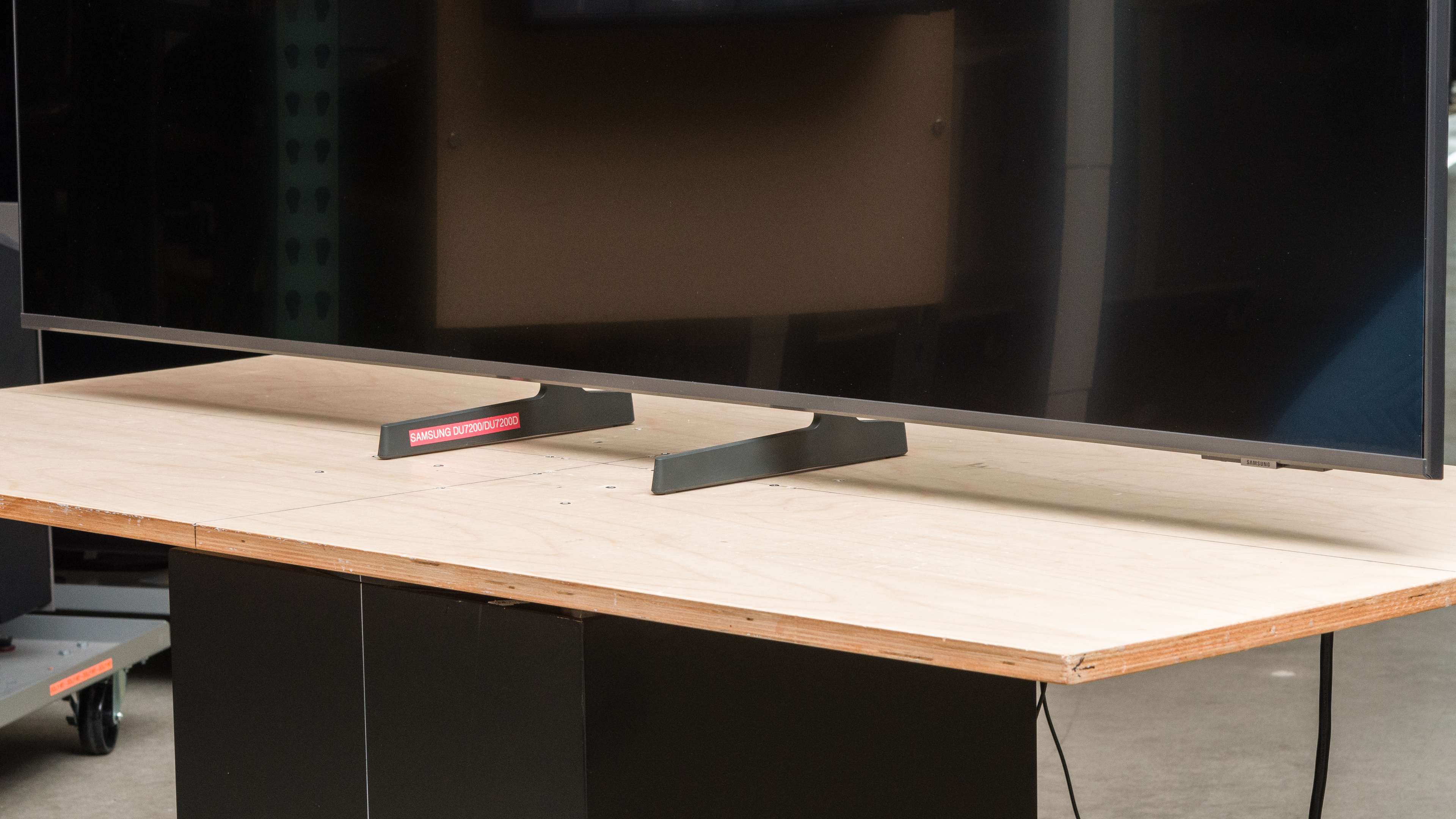 The TV uses a pair of plastic feet that can be adjusted into different positions depending on your needs. The narrow position (pictured above) brings the feet close together, which is great for smaller tables. You can also keep the feet close together and lower the height. If you're more worried about stability, you can widen the feet and set them to either a high or low position. In the higher position, the feet lift the TV about 3.54" above the table, so almost any soundbar fits underneath.