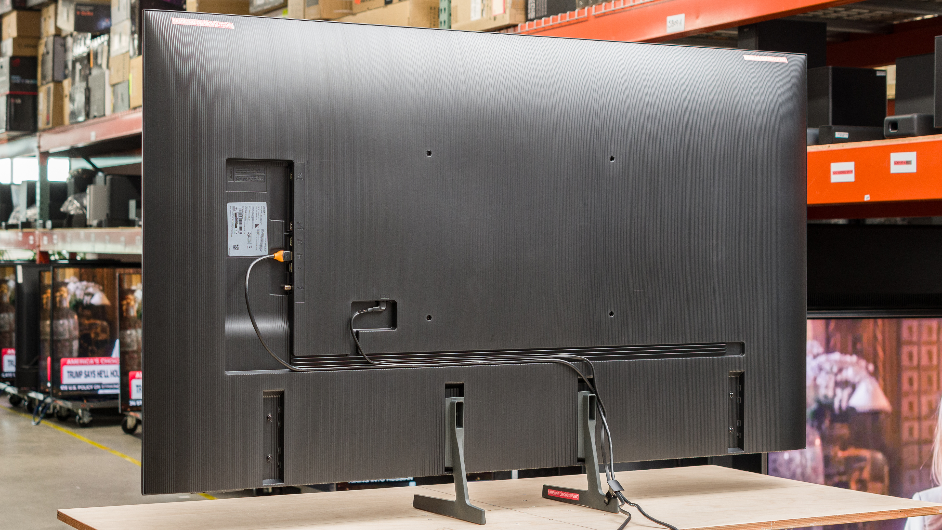 The back of the TV is made from plastic. All of the inputs are on the right side of the TV when facing the front, but they're in a recessed cutout that makes them quite hard to access if you have it wall-mounted. The back has grooves and a clip that can be attached to one of the feet to help with cable management.