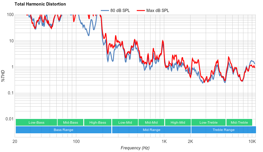 Average distortion performance. The M4500's THD levels remain reasonable low across its volume range. IMD is a little higher, especially at maximum volume where some aliasing of higher frequencies can be heard.