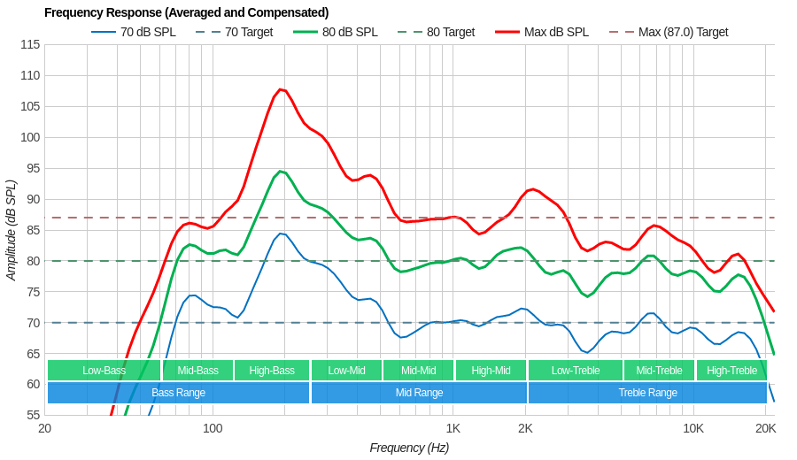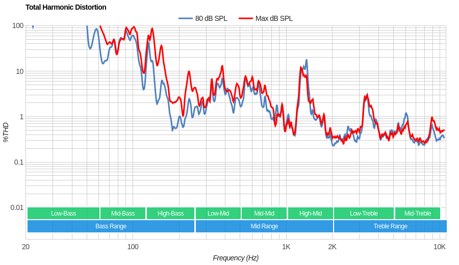 The harmonic distortion performance is about average. The overall amount of THD is rather elevated, but on there doesn't seem to be a dramatic rise in THD under maximum load. However, the sharp peaks around 1KHz and 2KHz, could the make the sound of those frequencies a bit harsh and brittle.