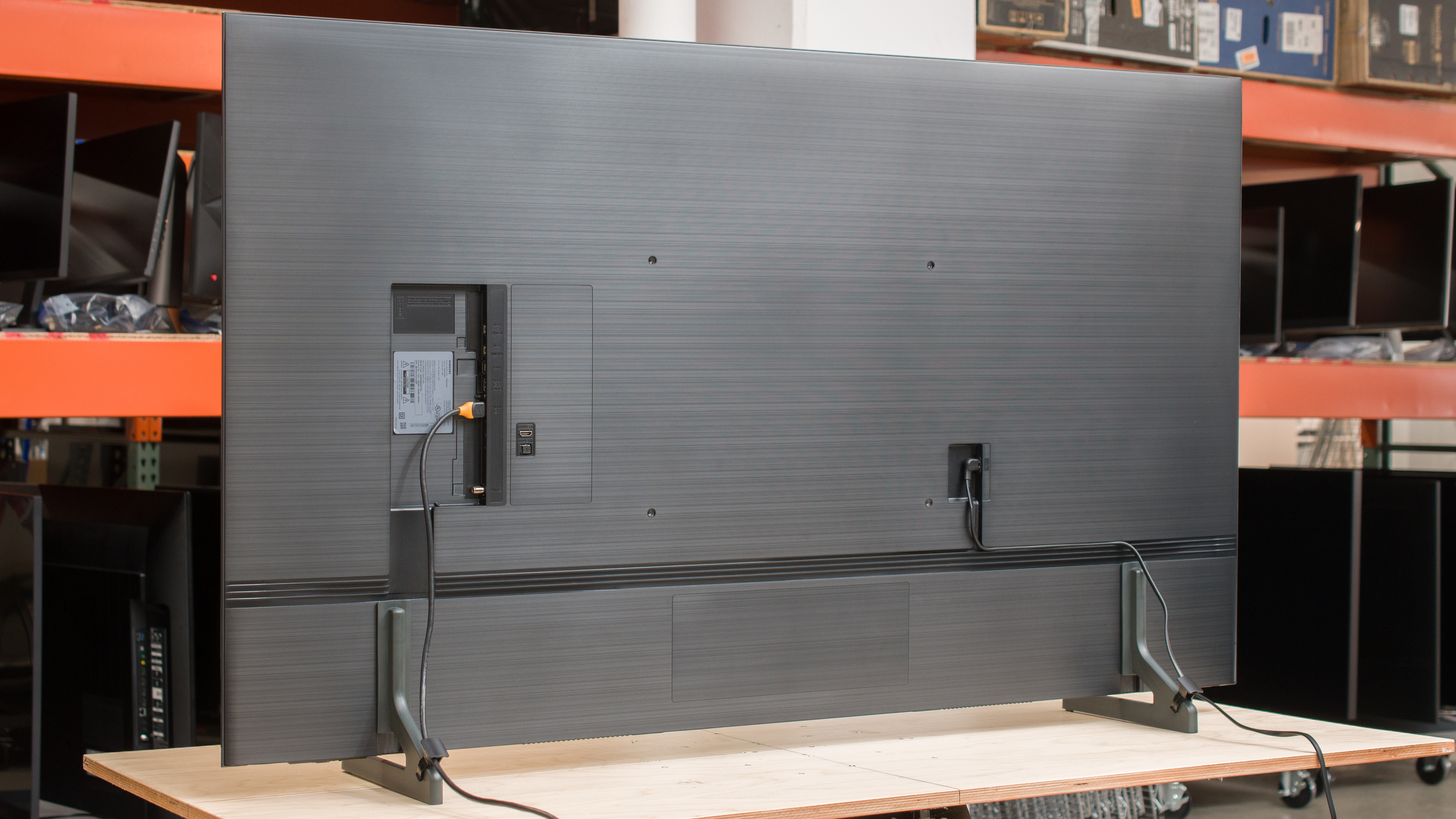 The back of the TV is brushed gray-tone plastic. There are tracks along the back to help route the cables to the inputs for cable management, and the feet have clips to help route the cables behind the feet. Sadly, the inputs are recessed into the TV, so they're hard to reach if you wall-mount the TV with a fixed bracket, so a mounting arm is recommended.