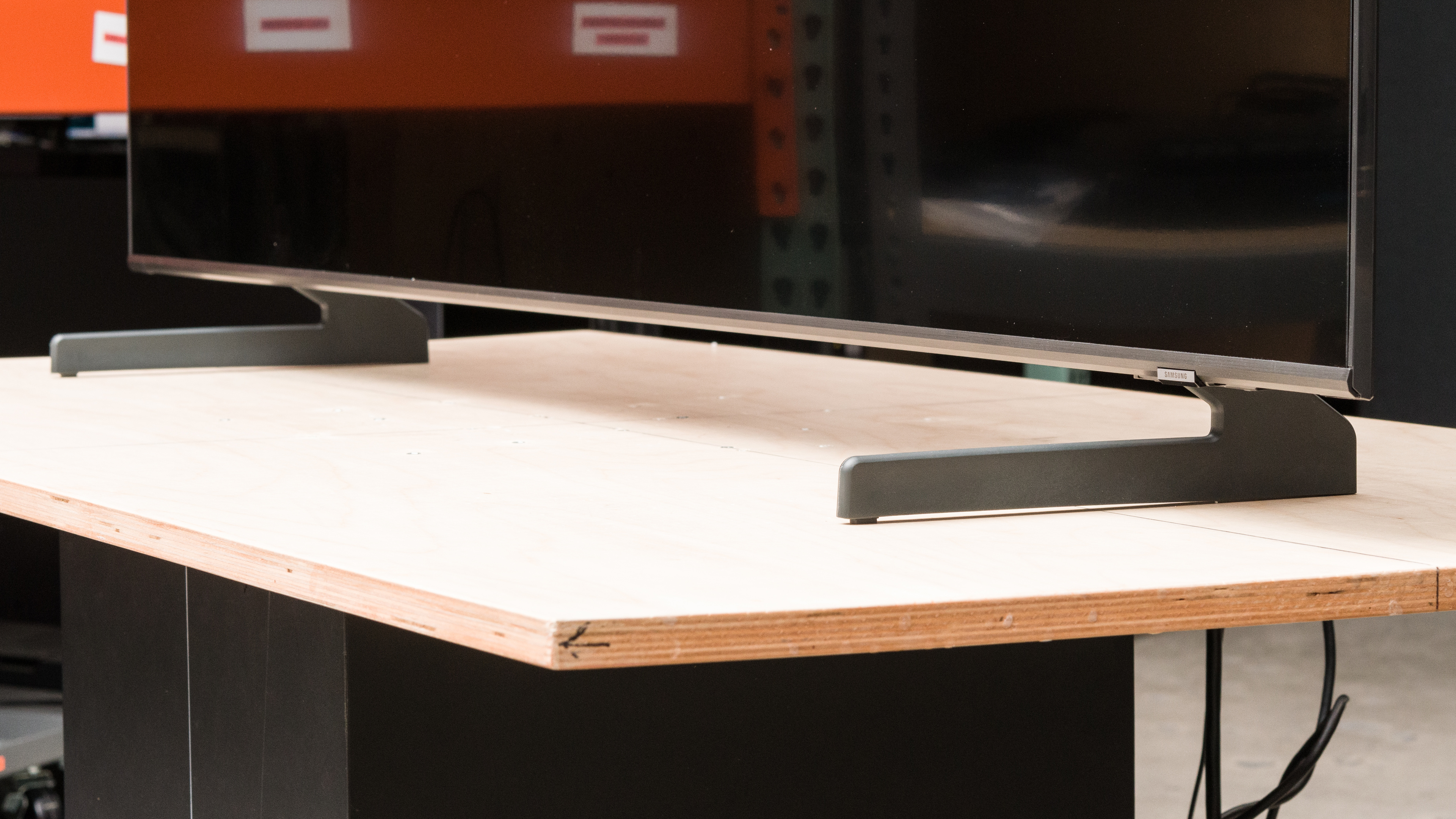 The stand has wide-set plastic feet which support the TV well. Because the stand is so wide, you'll need a big table to place it on. The stand can be placed in the lower position as shown, which raises the screen about 1.9" above the table, or in the raised position (shown here), which raises the screen about 2.9" above the table. Most soundbars fit in front of it in the raised position without blocking the screen.
