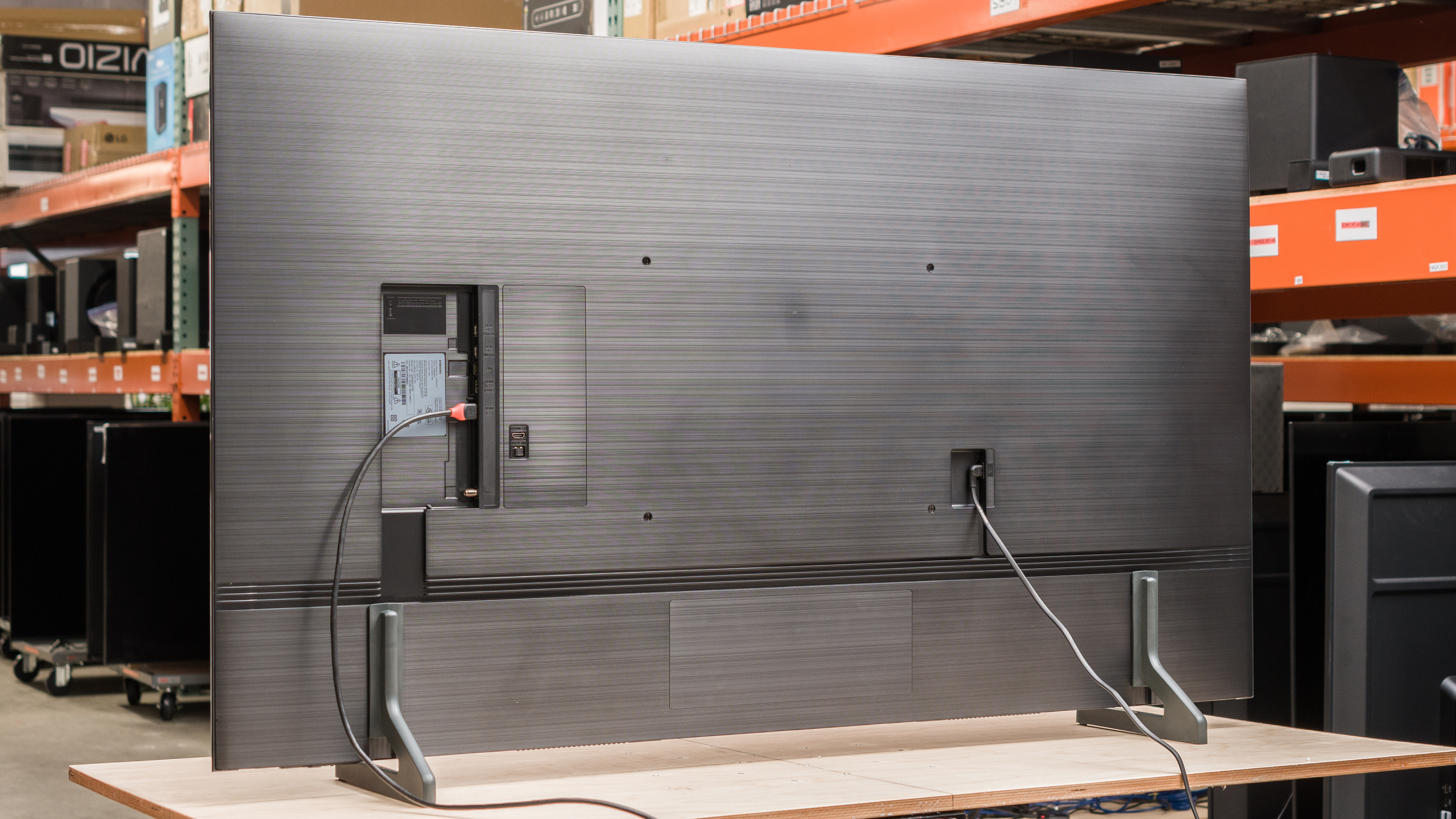 The back of the TV is made of plastic and has a nice brushed finish. Unfortunately, there are no clips or guides for cable management, so it's hard to maintain a clean setup. Sadly, the inputs are recessed into the TV, so they're hard to reach if you wall-mount the TV with a fixed bracket, so a mounting arm is recommended.