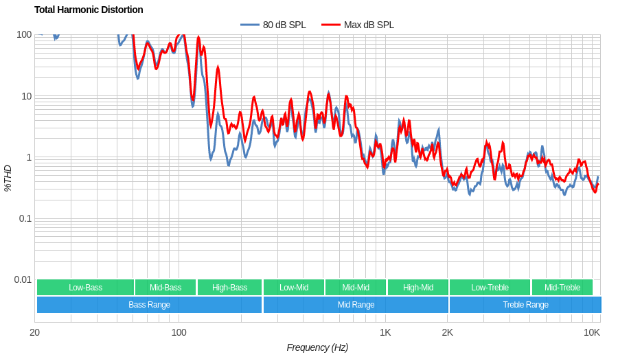 The distortion performance is mediocre. The overall amount of harmonic distortion is elevated, even at moderate volumes.