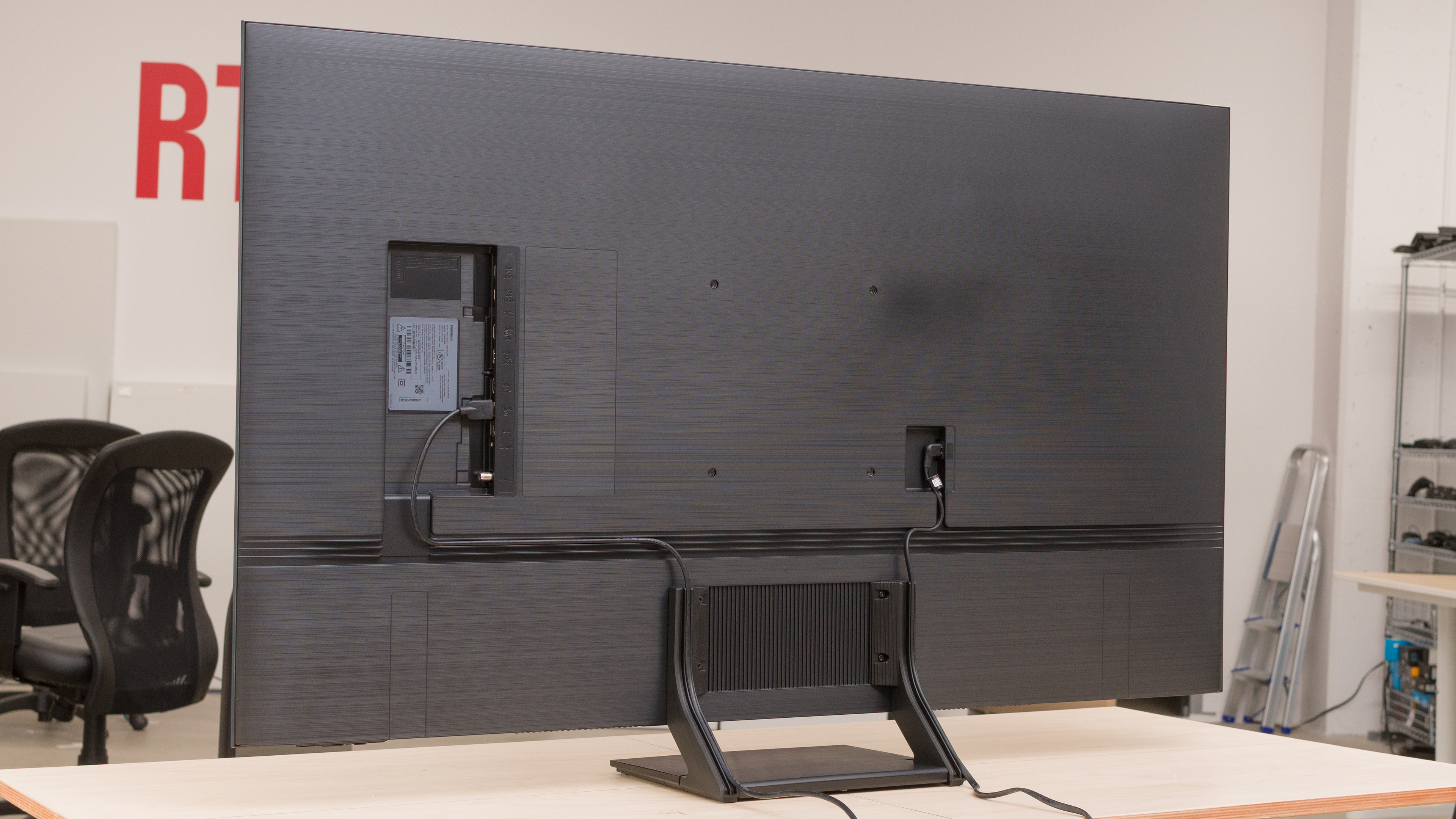 The back is plastic with fine horizontal etchings to give it a brushed aluminum look. There are tracks along the back of the TV and the stand for cable management. The inputs face to the side, but they're inset into the back of the TV and hard to access.