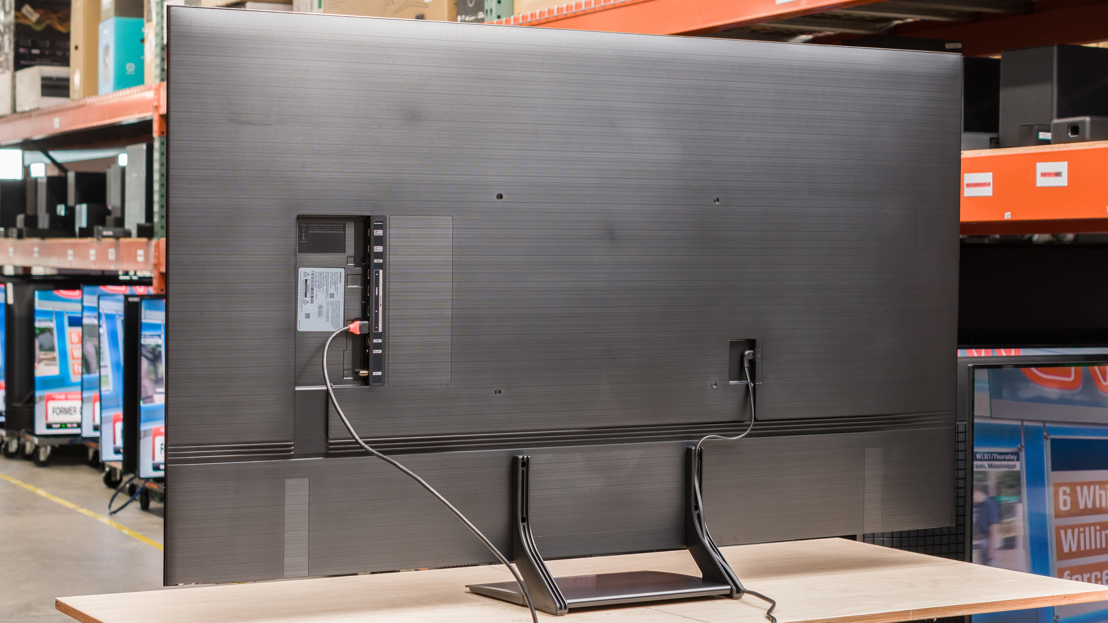 The back of the TV is plastic with fine horizontal etchings, and it feels solid overall, without excessive flex around the VESA holes or inputs. There are grooves on the back of the TV and the stand for cable management. The inputs are recessed in an inlet on the side of the TV, and they're hard to reach if the TV is wall-mounted.