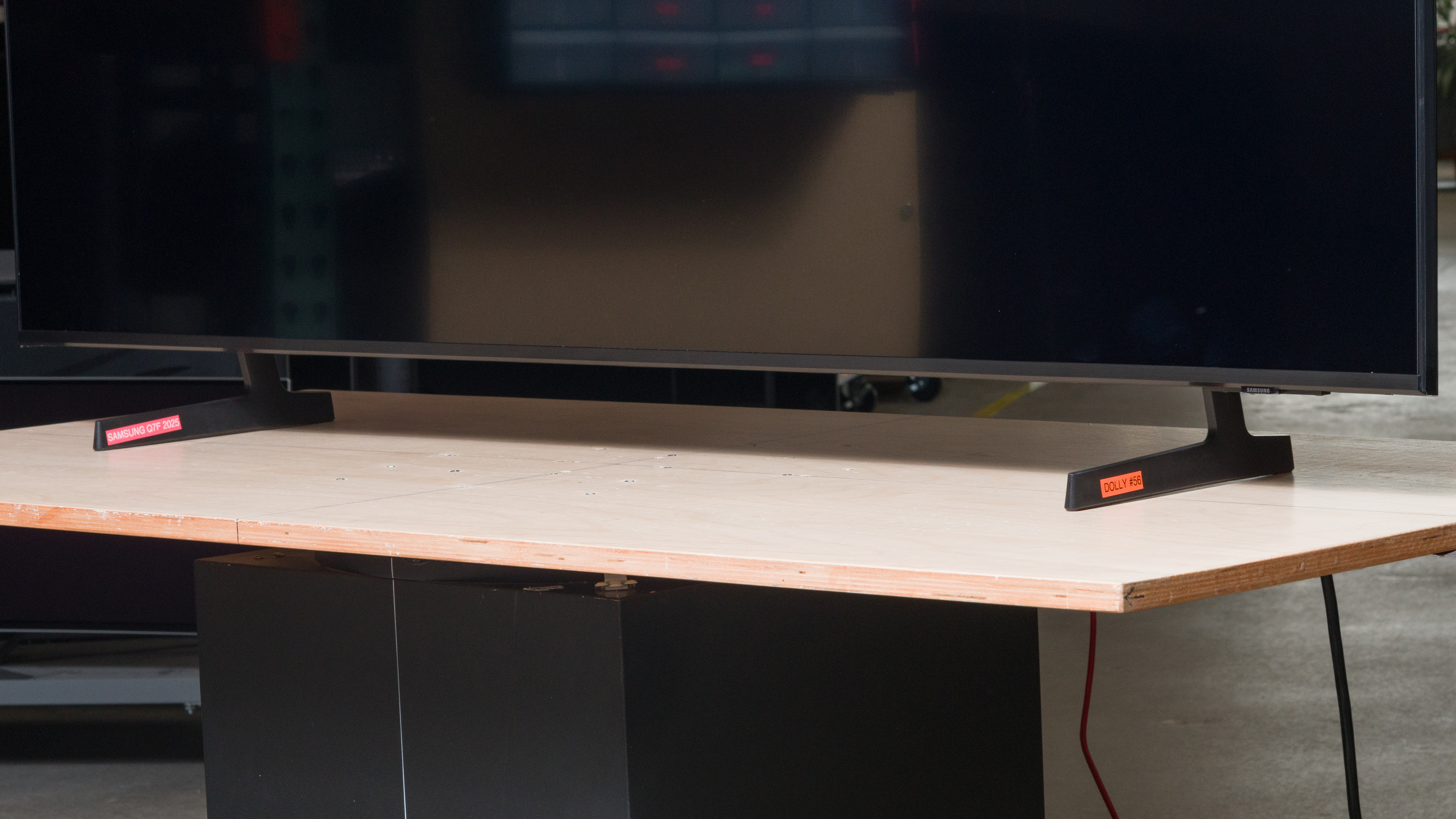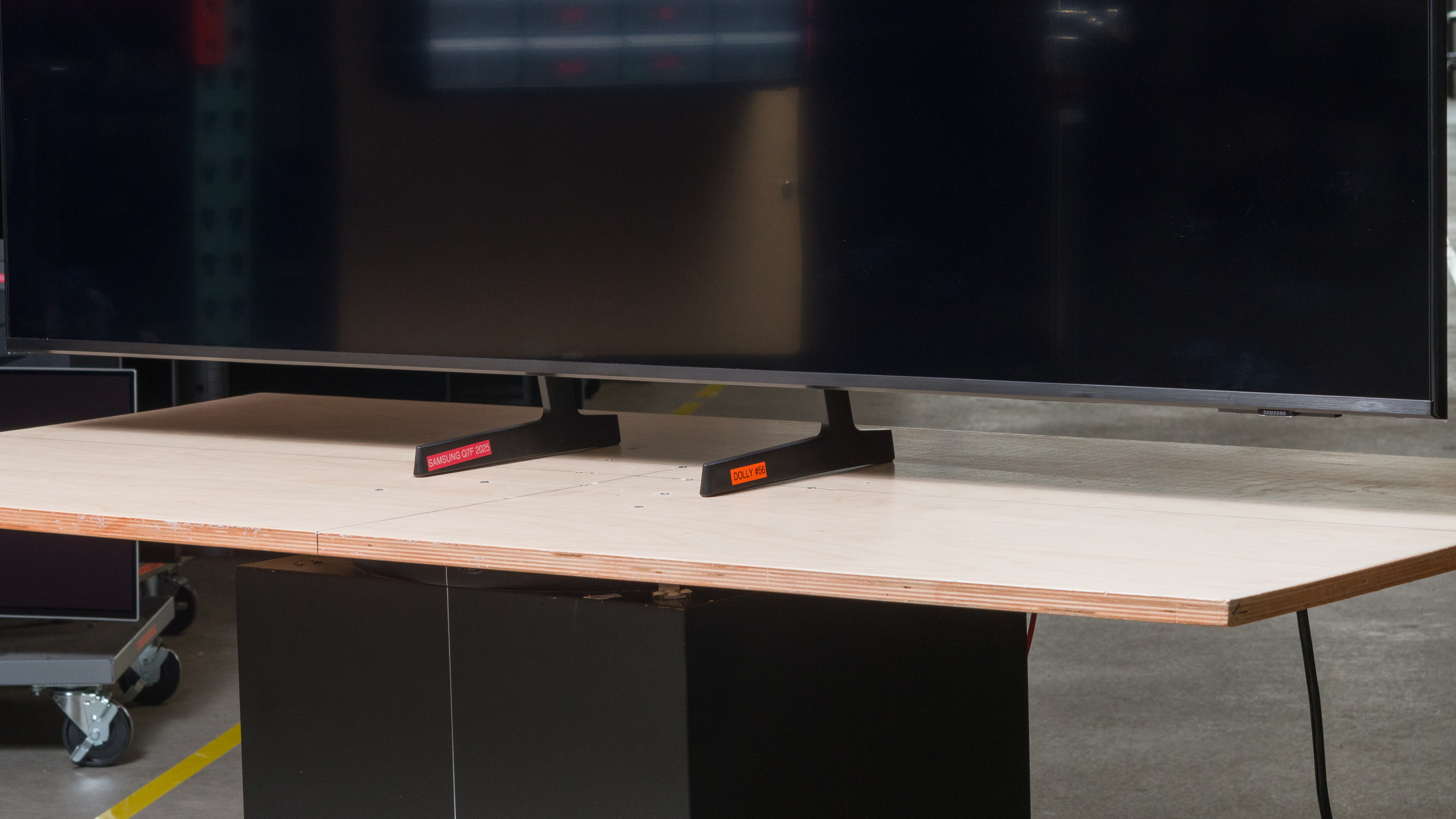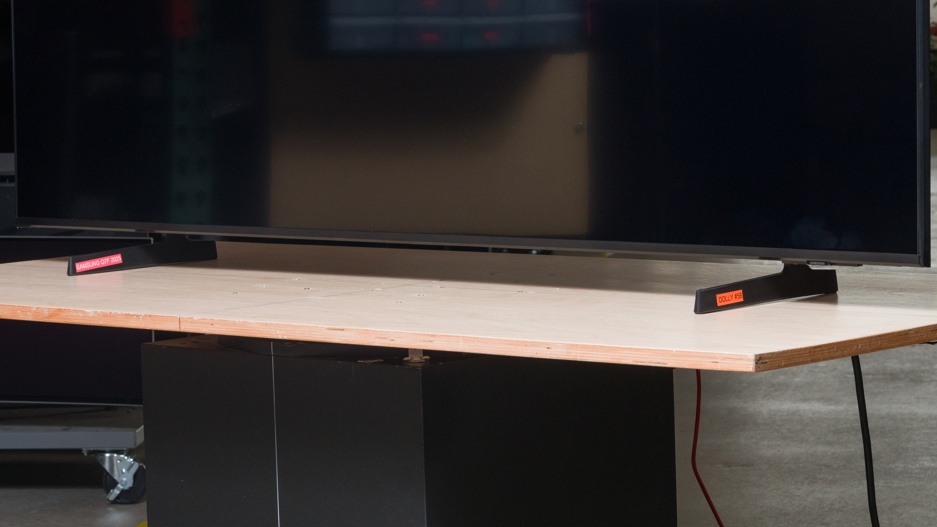The Samsung 65Q7F has alright build quality overall. It wobbles a bit in the high and narrow position when you're cleaning the screen, but it settles quickly and doesn't cause any issues. There's quite a bit of flex on the back panel that becomes more pronounced near the VESA mounting points, but it doesn't prevent you from wall-mounting it.