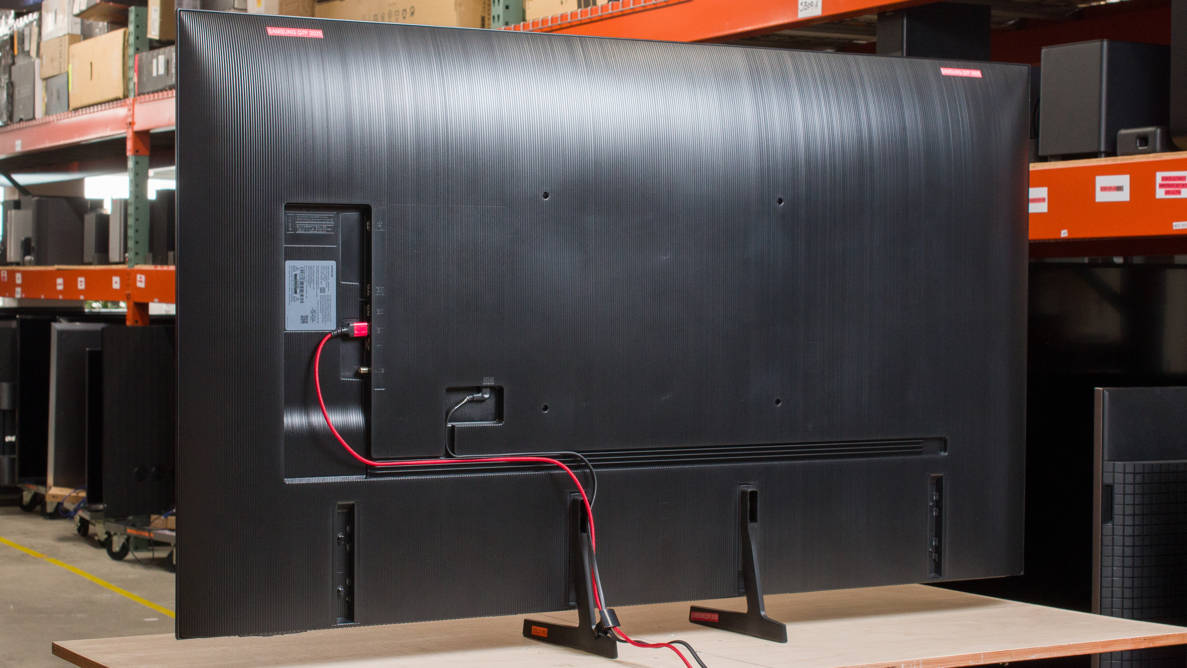 The back of the TV is made from plastic. All of the inputs are on the right side of the TV when facing the front, but they're in a recessed cutout that makes them quite hard to access if you have it wall-mounted. The back has grooves and a clip that can be attached to one of the feet to help with cable management.
