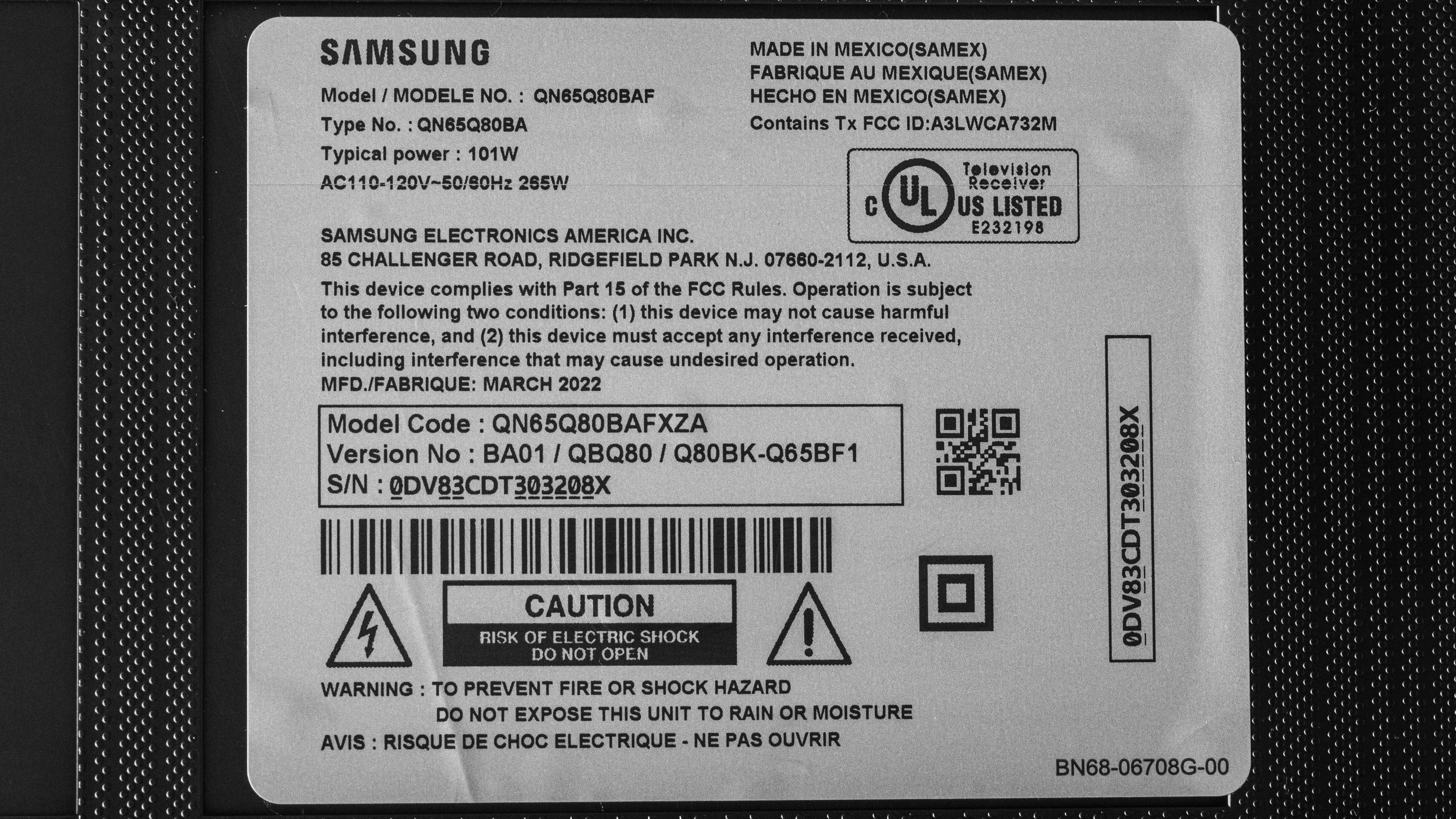 We tested the 65-inch Samsung Q80B, and the results are valid for the 55 and 75-inch models. The 50-inch version has a lower refresh rate and doesn't support HDMI 2.1 bandwidth, and both the 50 and 85-inch models have different panel types, so those sizes perform differently. The last four letters of the model code (in this case, FXZA) vary between regions and even retailers, and it's known as the Samsung Q80BD at Costco and Sam's Club. As Samsung's European lineup is different, these results are only valid for the North American Q80B and not the European version.