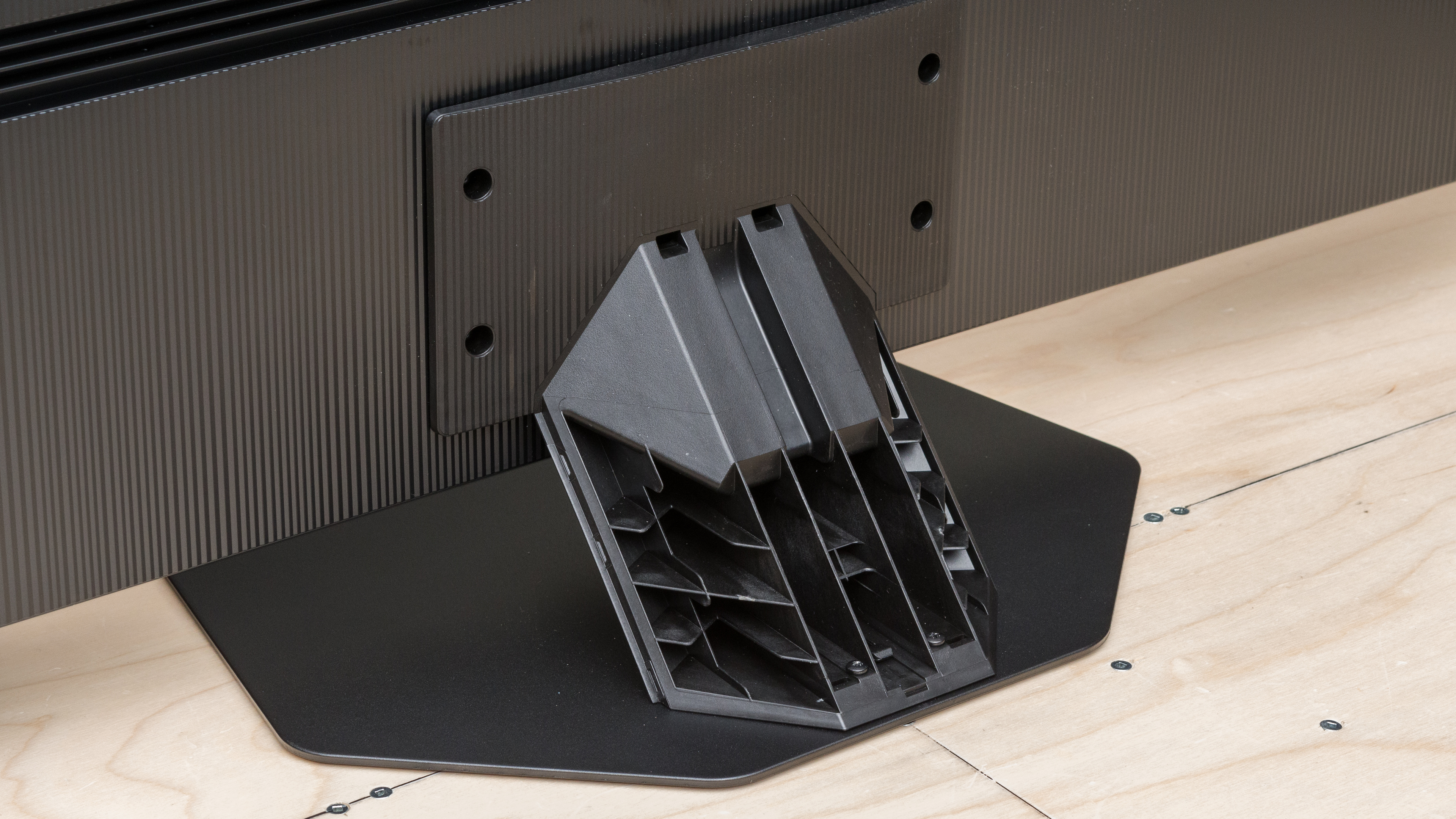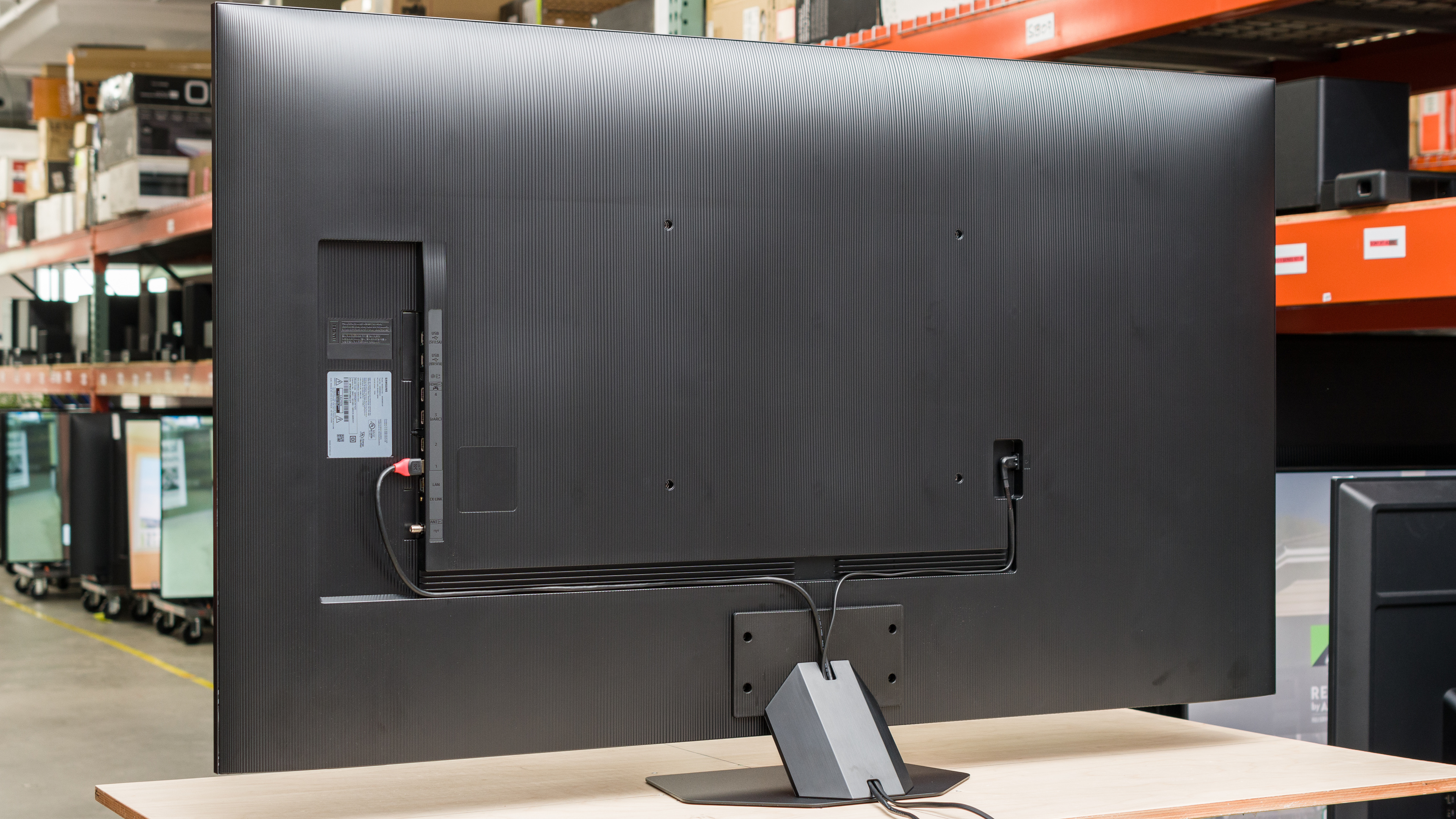 The back panel is made of textured plastic with vertical etched lines. There are grooves in the casing to help with cable management, which then get funneled into the stand. The stand has a removable cover that helps with hiding cables. The inputs are recessed and are hard to access if the TV is wall-mounted.