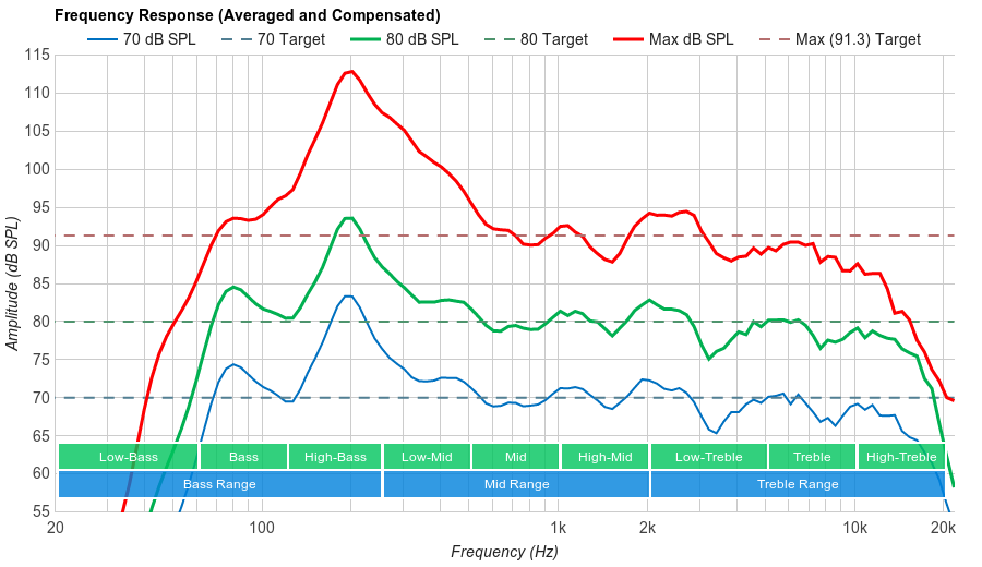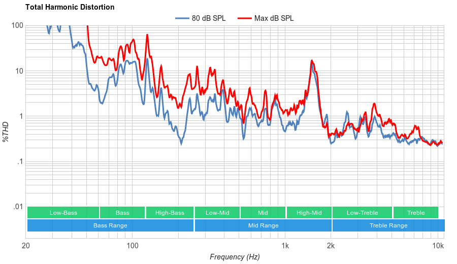 Average harmonic distortion performance. The overall amount of harmonic distortion at 70 is about average. The rise in distortion at 80 and maximum volume isn't too much either, and the values remain within average limits.