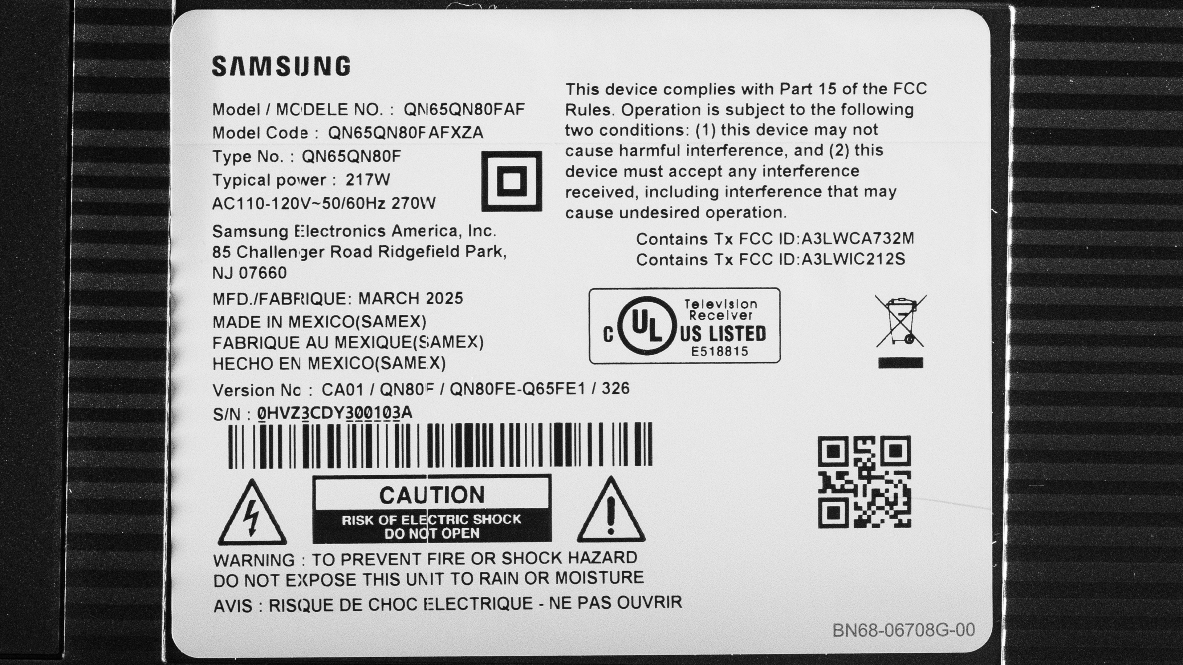 We bought and tested the 65-inch Samsung QN80F, and these results are also valid for the 55-inch, 75-inch, and 85-inch models. We bought and tested the 100-inch model separately. It's also sold in warehouse stores like Sam's Club and Costco as the QN80FD. Samsung's marketing around the warehouse variant suggests that it has more dimming zones, as they advertise it with Ultimate UHD Dimming instead of the Supreme UHD Dimming found on the regular models, but as Samsung doesn't discuss panel features, we don't know for sure. We also put the 65-inch and 100-inch models together in a head-to-head comparison; you can read our findings here.